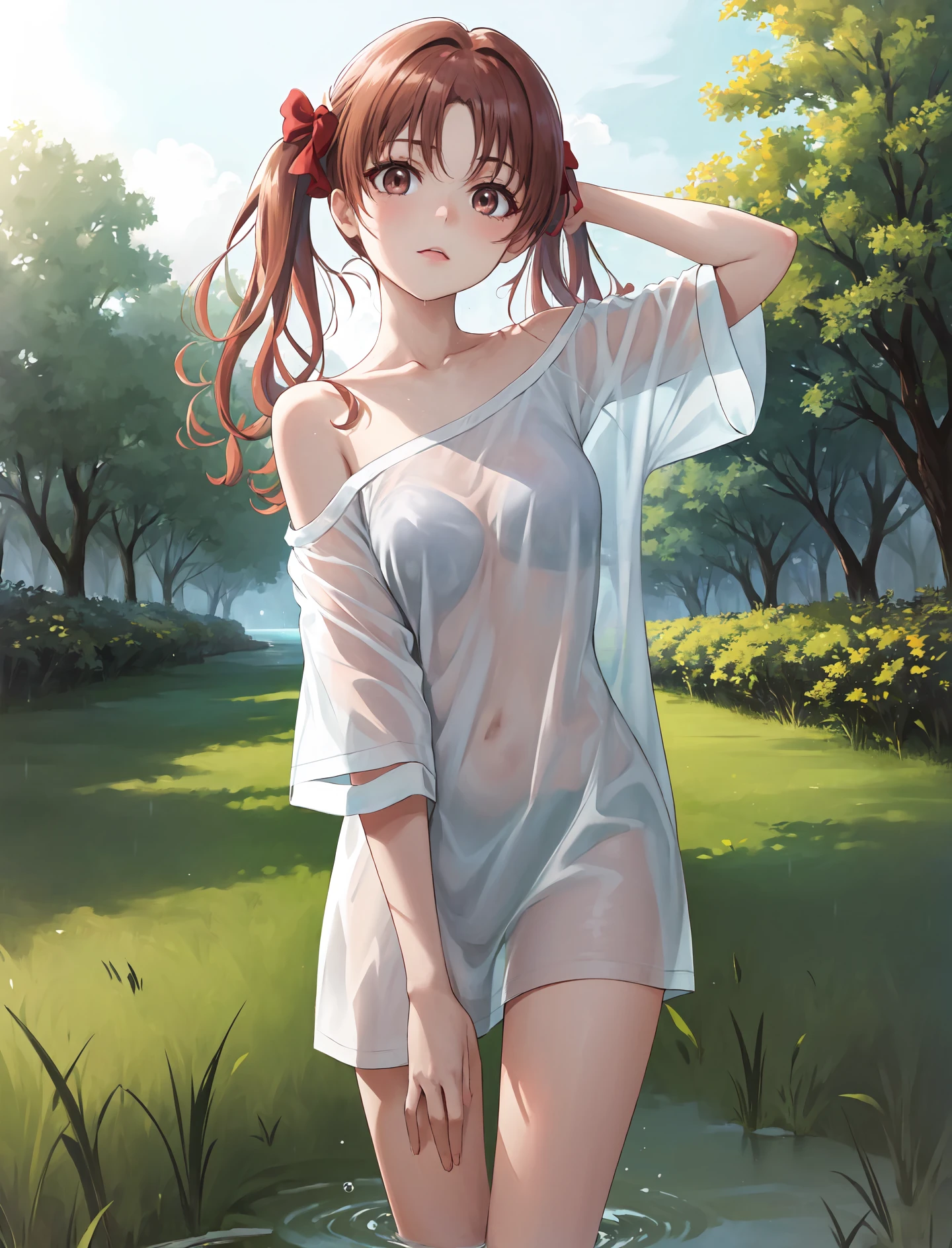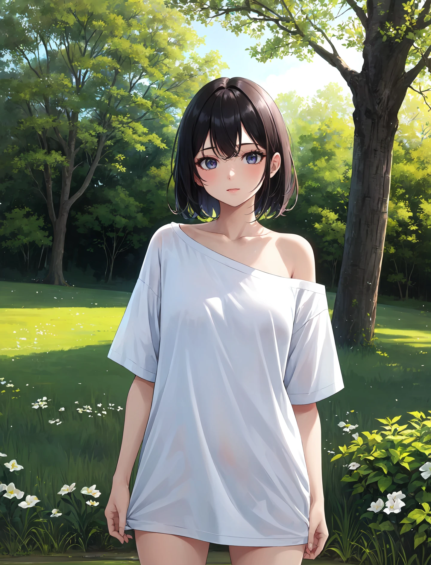 shirt, white shirt, collarbone, short sleeves, t-shirt, off shoulder, oversized shirt, ????? shirt, oversized clothes, see-through silhouette, see-through shirt;