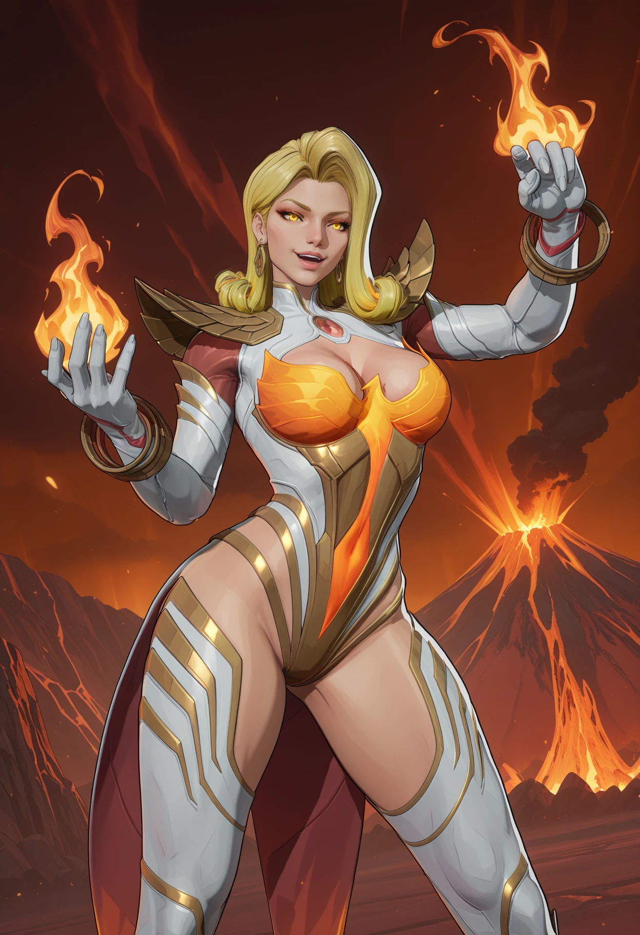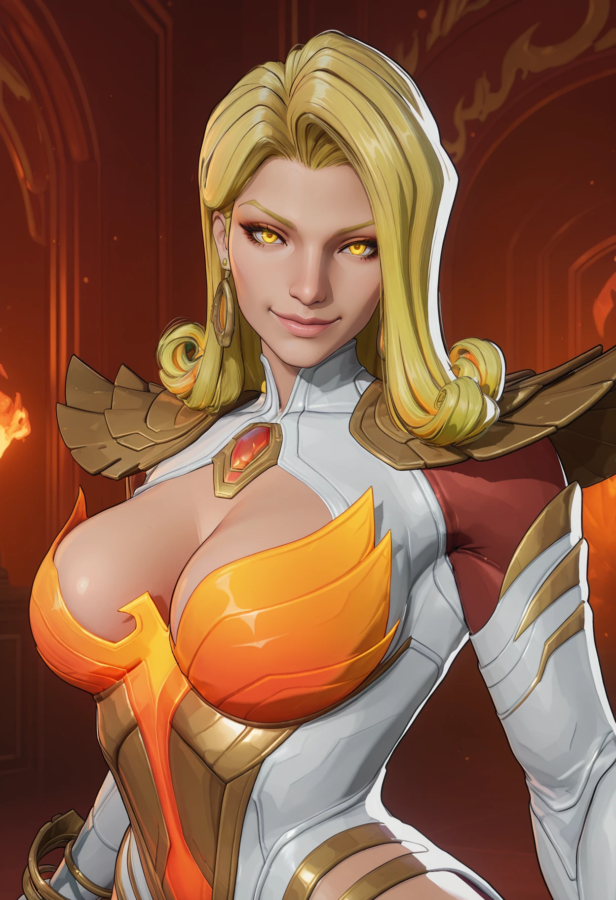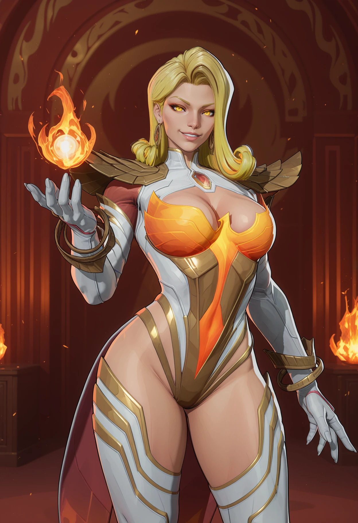 Phoenix costume,earrings,jewelry,glowing,cleavage,shoulder armor,bracelet,leotard,phoenix leotard,gloves,white gloves,coattails,thigh boots