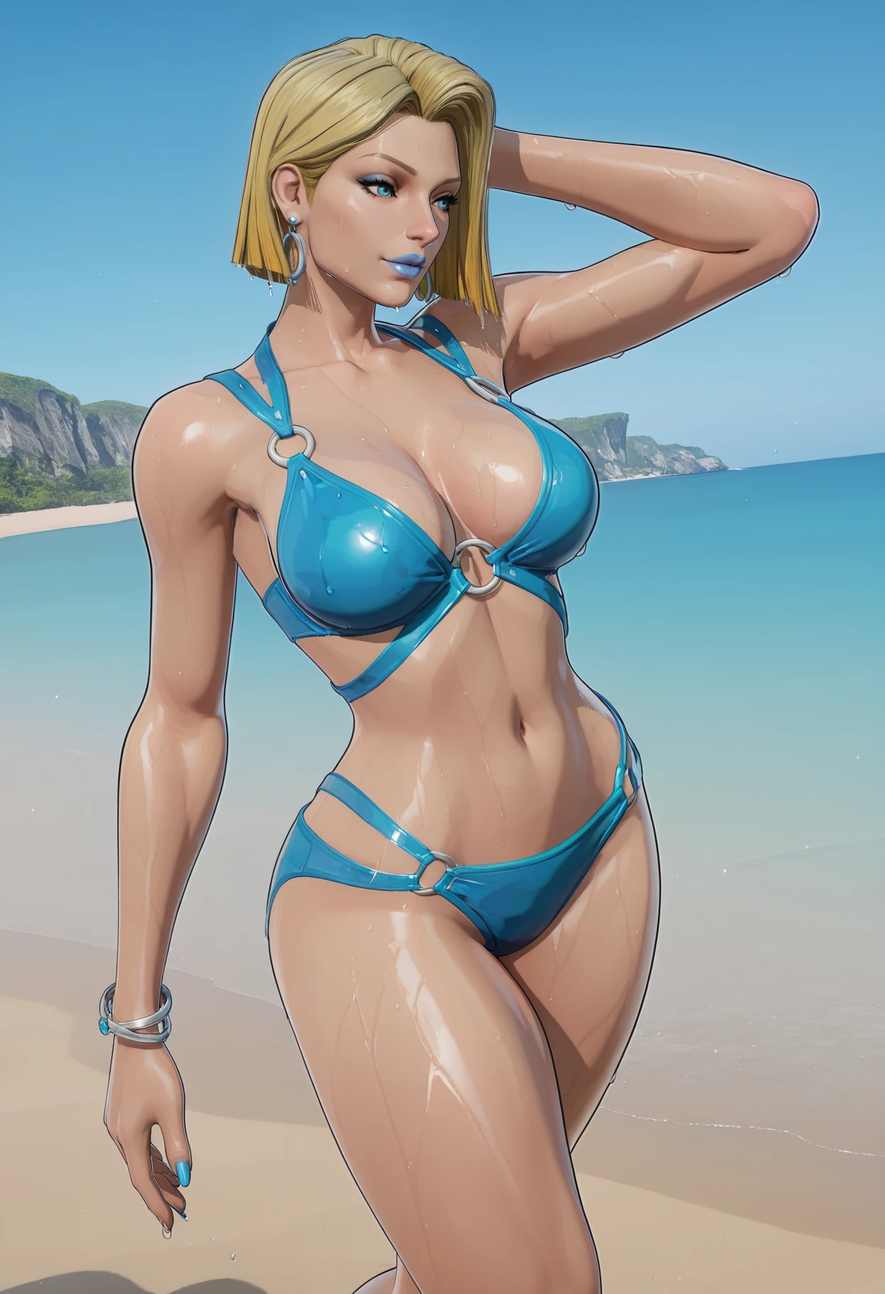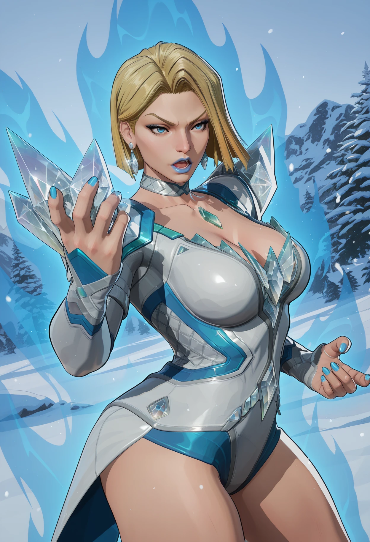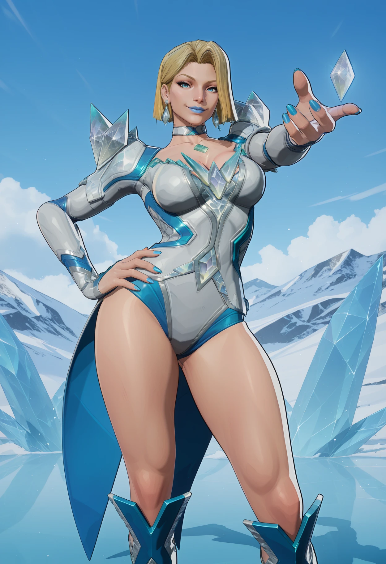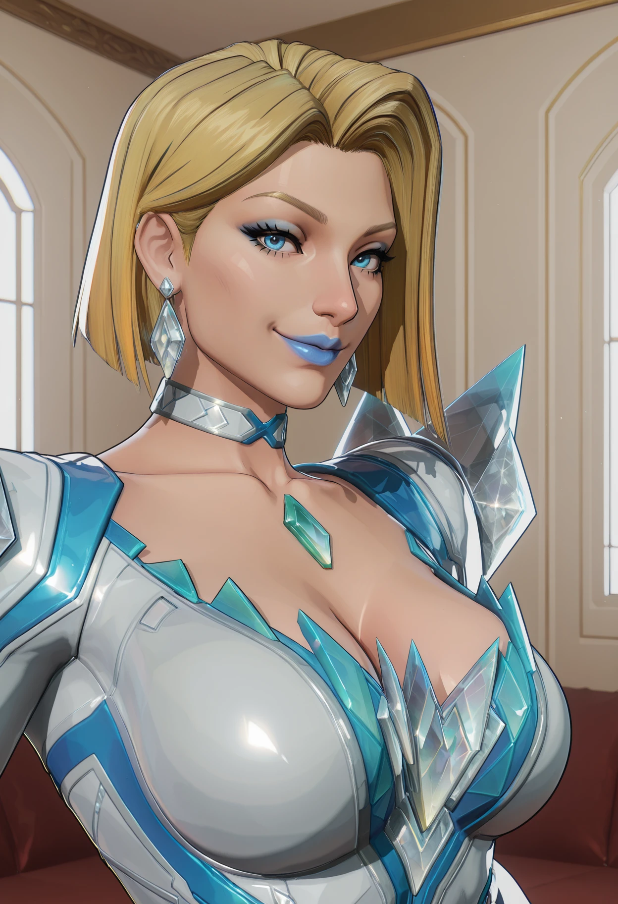 mm,mature female,blonde hair,short hair,blue eyes,lipstick,blue lips,makeup,3d,realistic