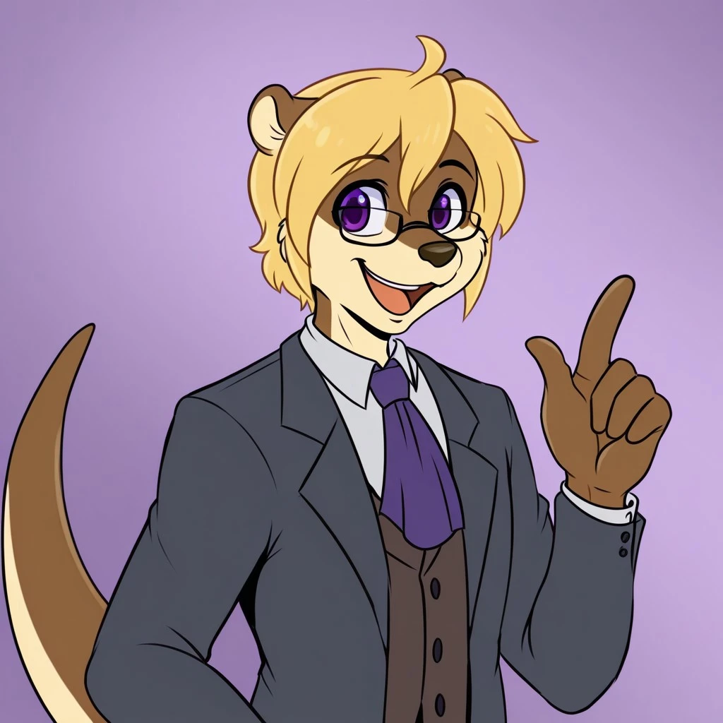 lutaro_uq, 1boy, solo, blonde hair, animal ears, furry, furry male, glasses, purple eyes, short hair, male focus, tail, long tail, otter ears, otter tail,