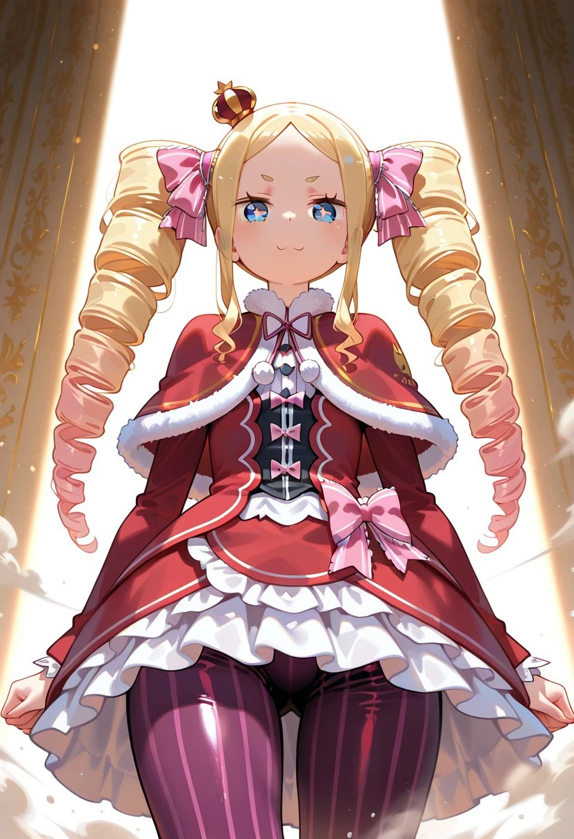 Beatrice from Re:Zero, long hair, blue eyes, blonde hair, twintails, hair ribbon, sidelocks, symbol-shaped pupils, drill hair, twin drills, small , dress, ribbon, fur trim, capelet, crown, mini crown, red capelet, frills, bowtie, striped leggings
