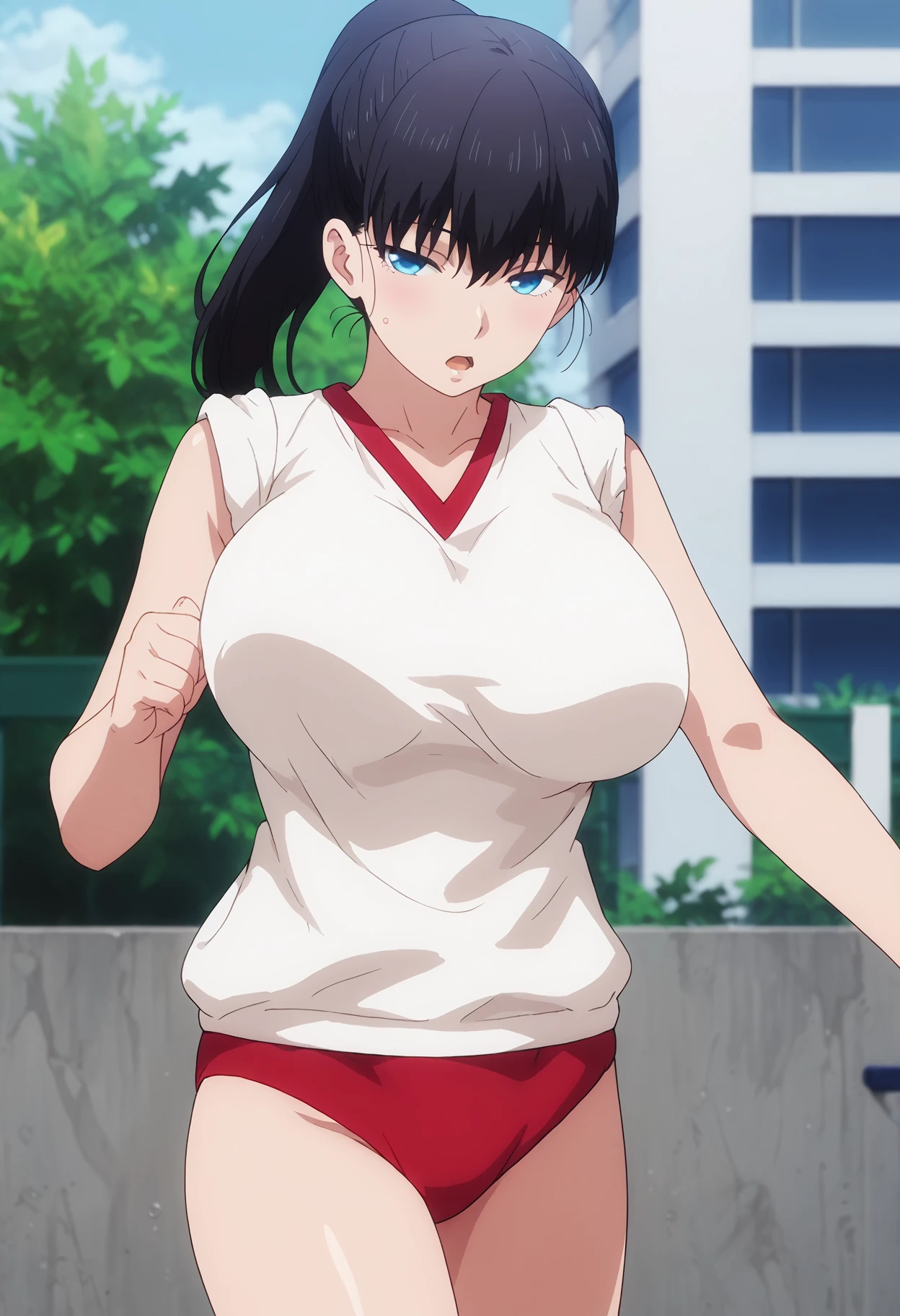 toudouakira, black hair, high ponytail, blue eyes, long hair, huge breasts,