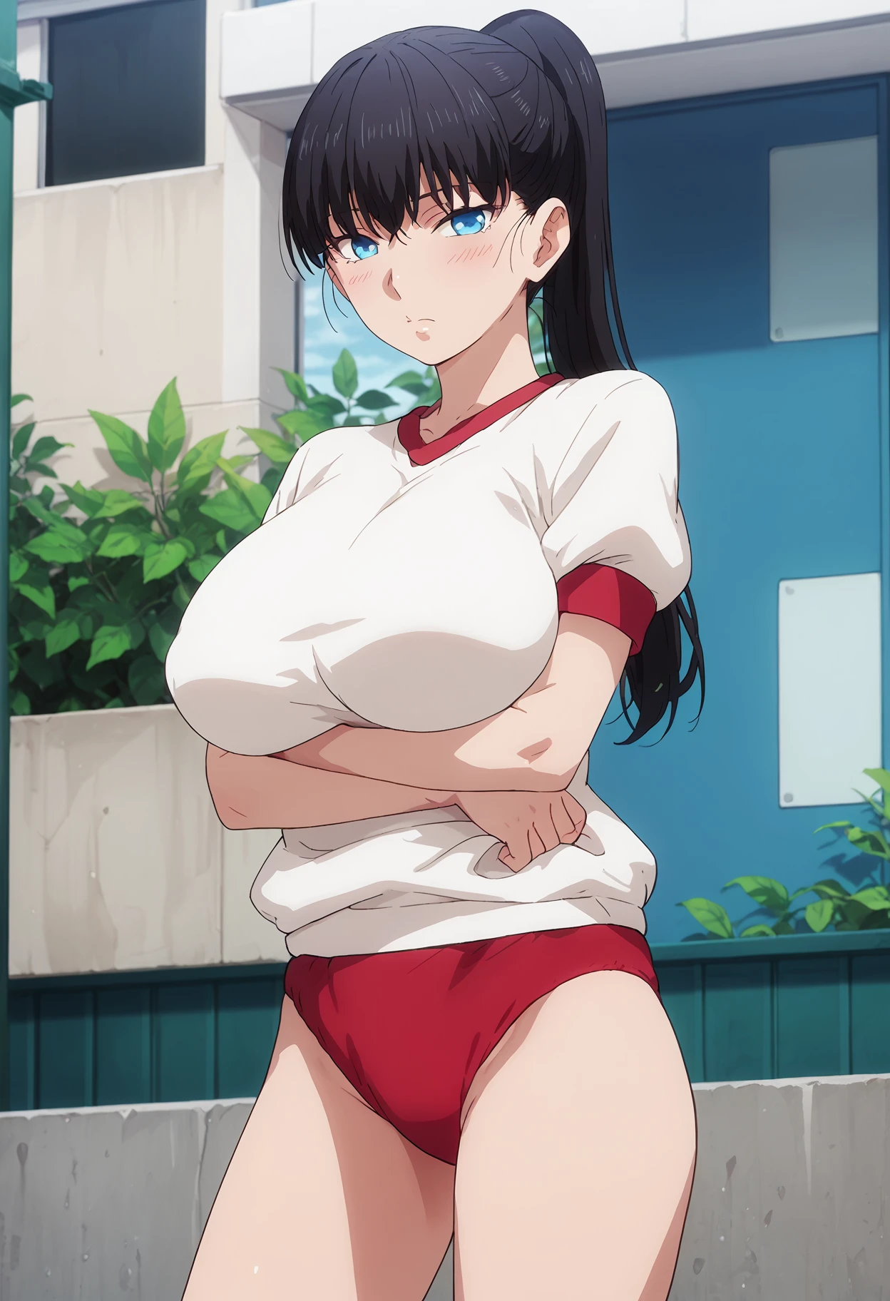 gym shirt, red buruma, short sleeves"short sleeves" can be replaced by "sleeves rolled up" and " bare shoulders".