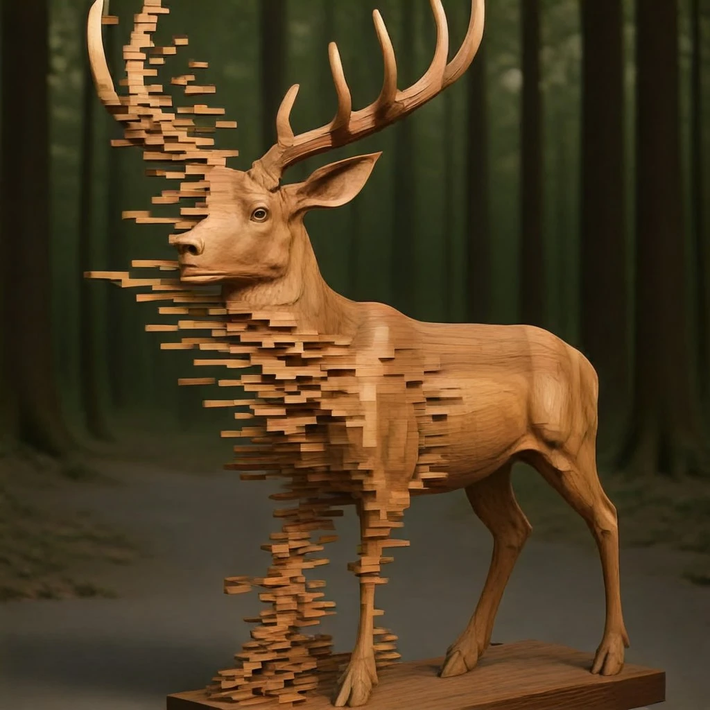 pixelated wood sculptures, hardwood veins, half pixelated, made of wood,