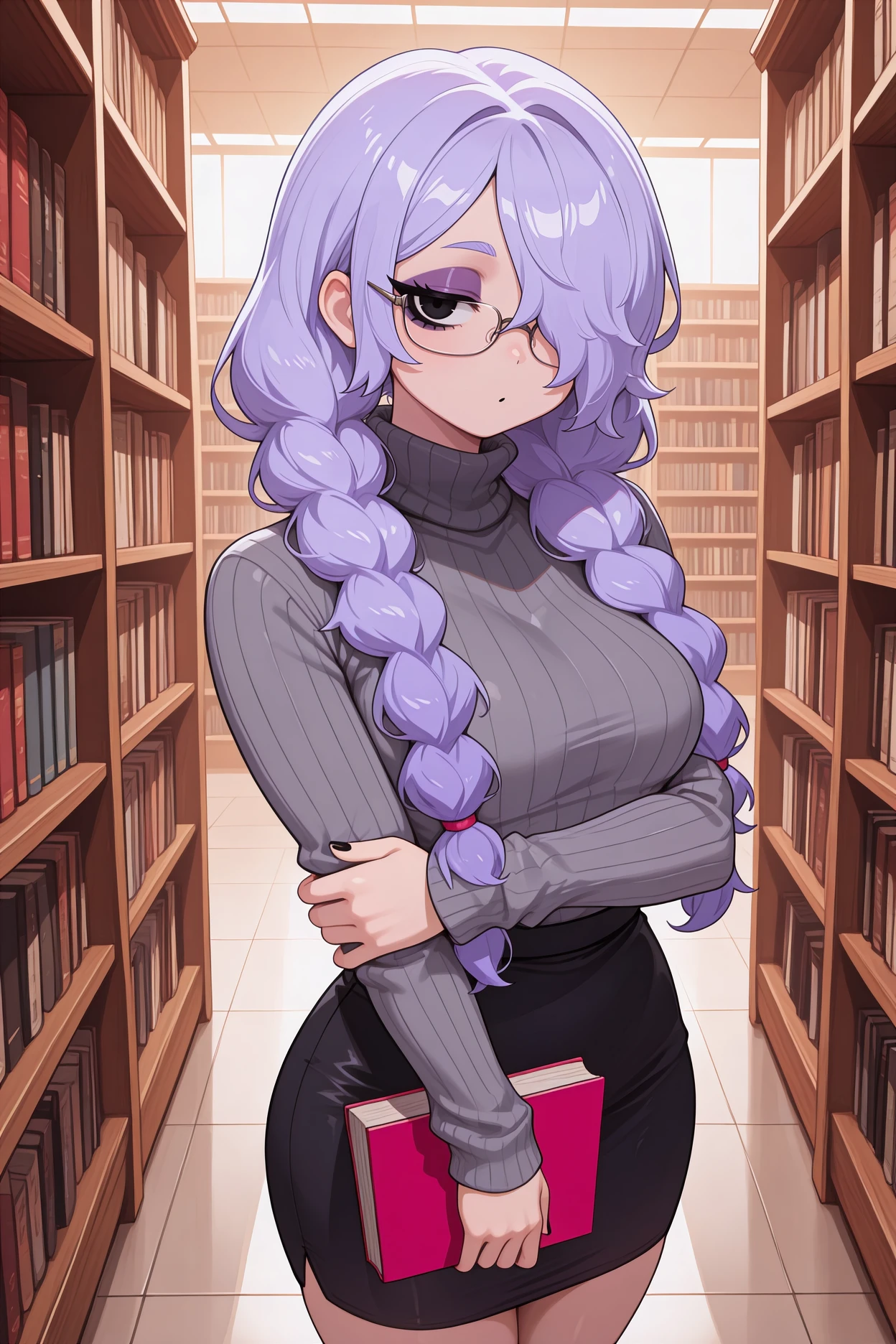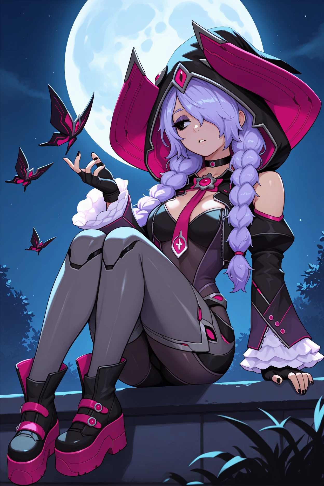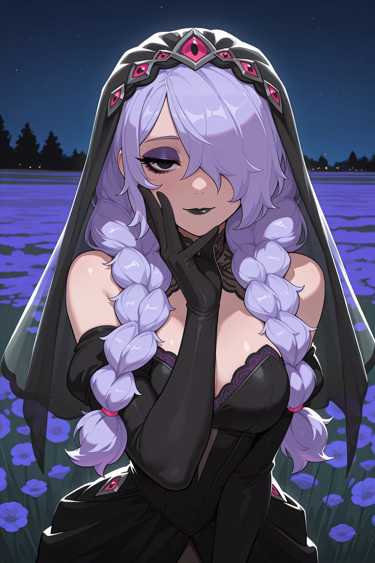 os3ra, long hair, light purple hair, twin braids, hair over one eye, black eyes, purple eyeshadow