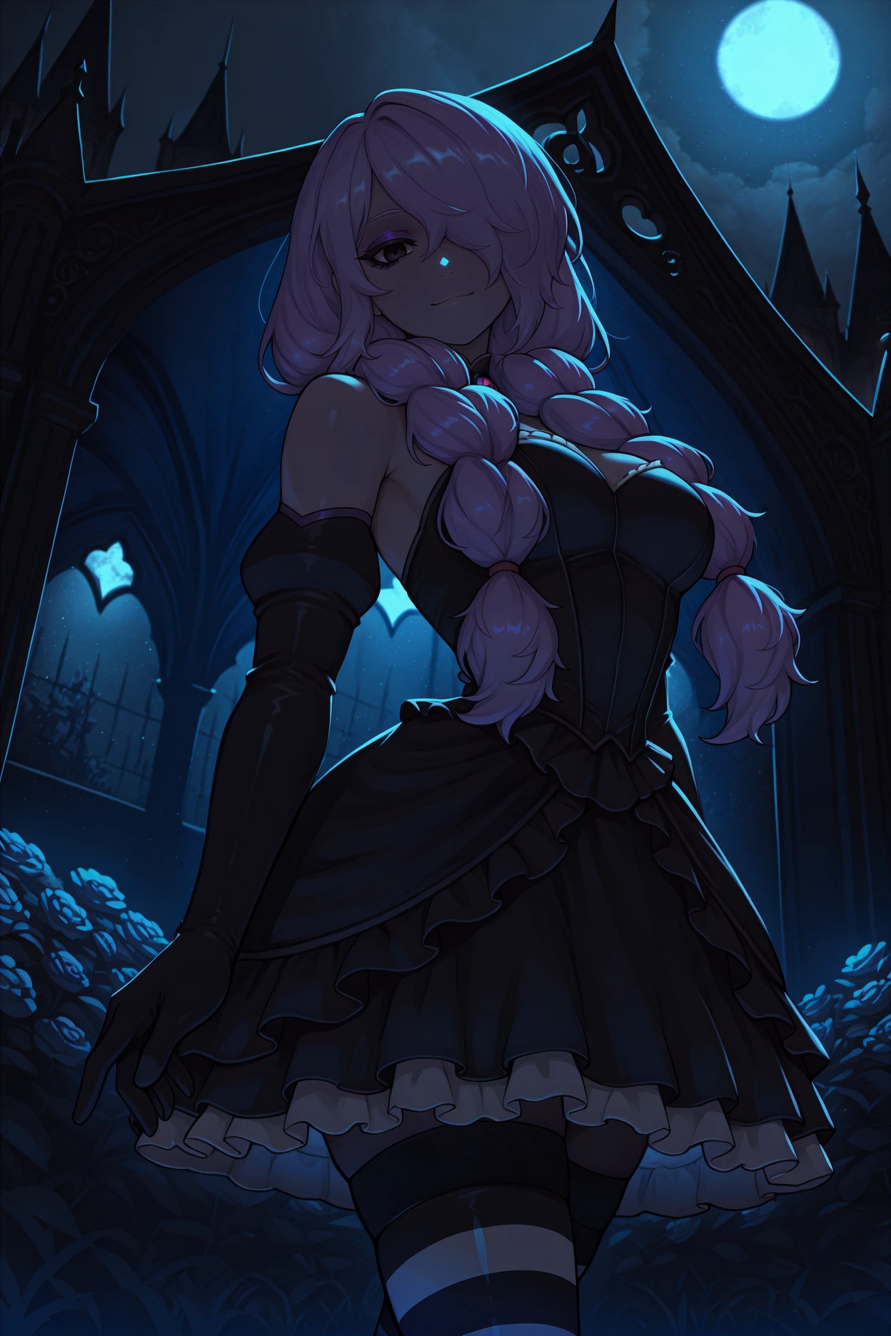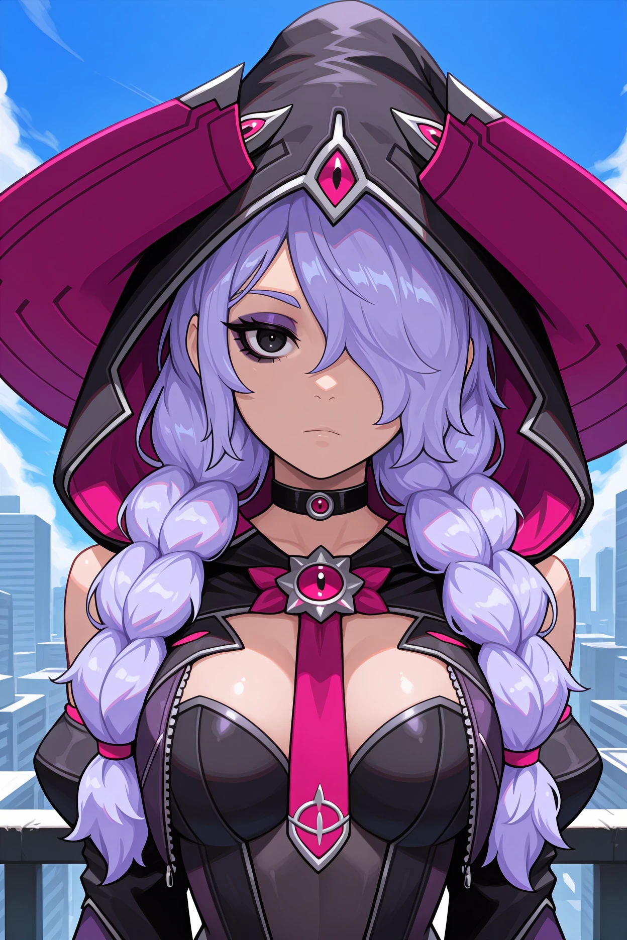 Trigger word is "os3ra" and "long hair, light purple hair, twin braids, hair over one eye, black eyes, purple eyeshadow" is required.