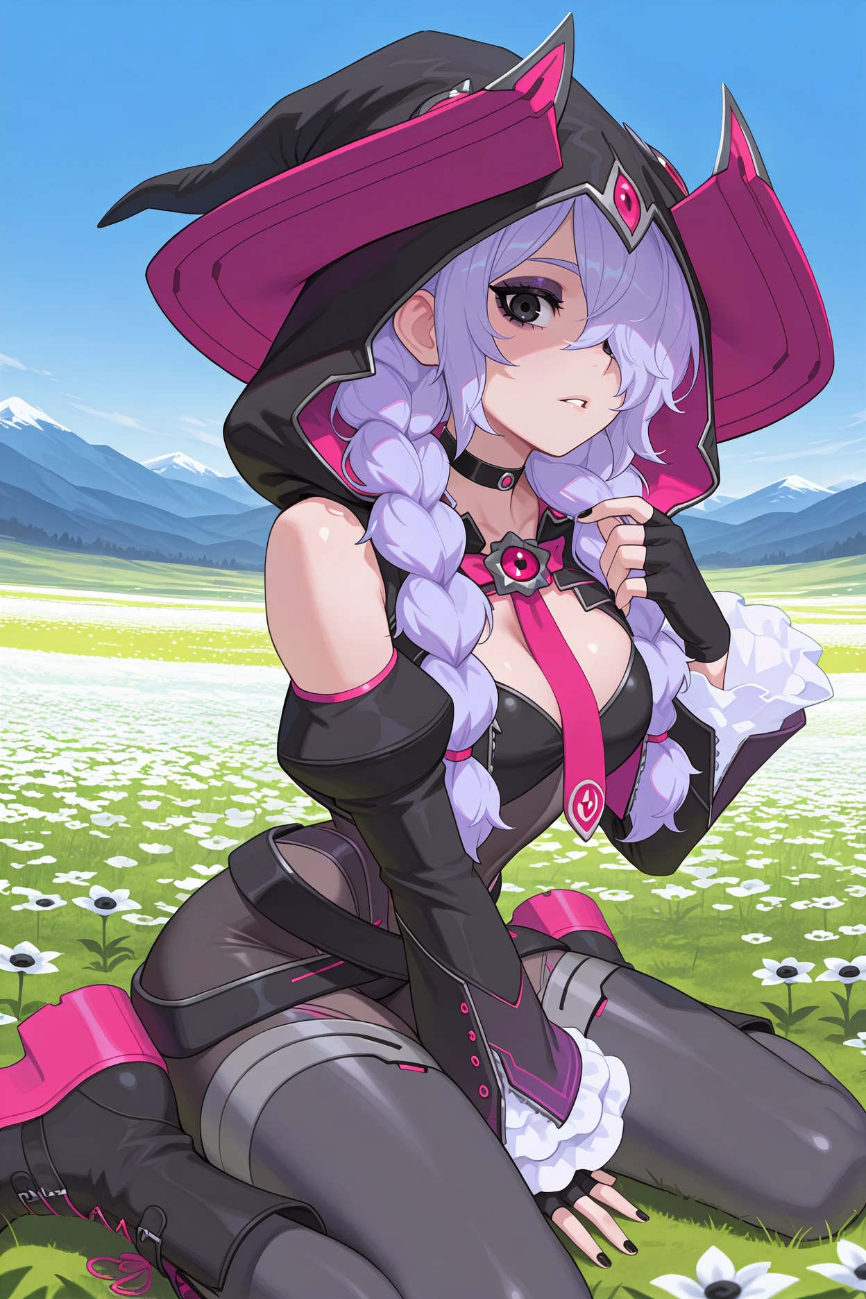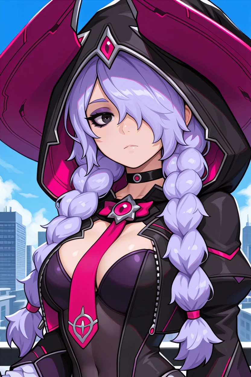 Add "black nails, witch hat, black hood, black choker, pink necktie, black vest, sleeveless vest, cropped vest, black ????????, cleavage cutout, detached sleeves, black sleeves, puffy sleeves, frilled sleeves, black gloves, fingerless gloves, grey thighhighs, pink platform boots" for her typical look.