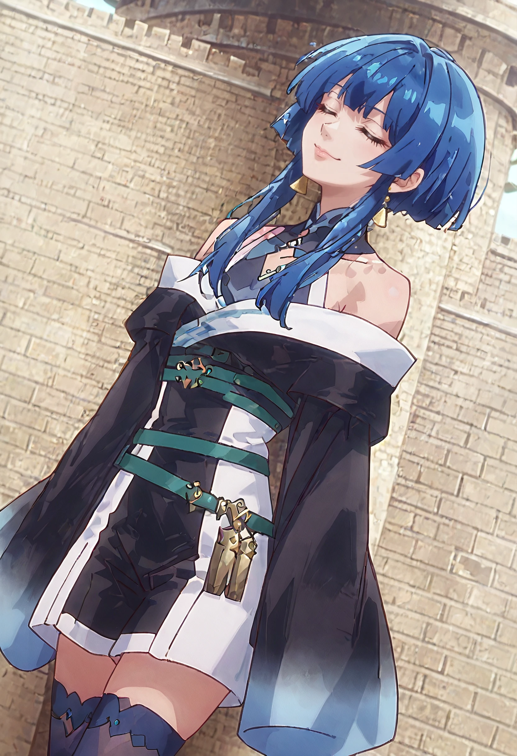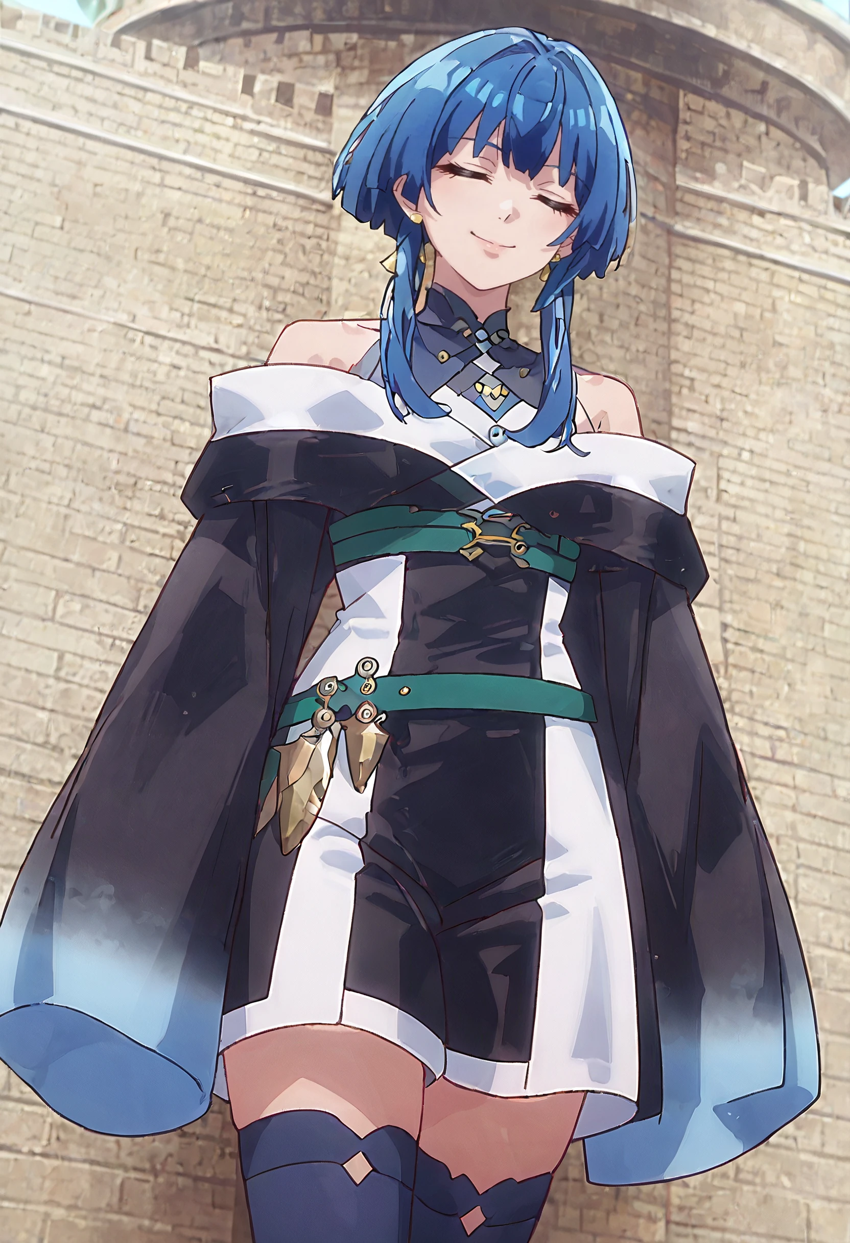 SigneOutfit, long sleeves, bare shoulders, sleeves past wrists, wide sleeves, jewelry, sleeves past fingers, thighhighs, blue thighhighs, black dress, robe, green belt, dress, belt,