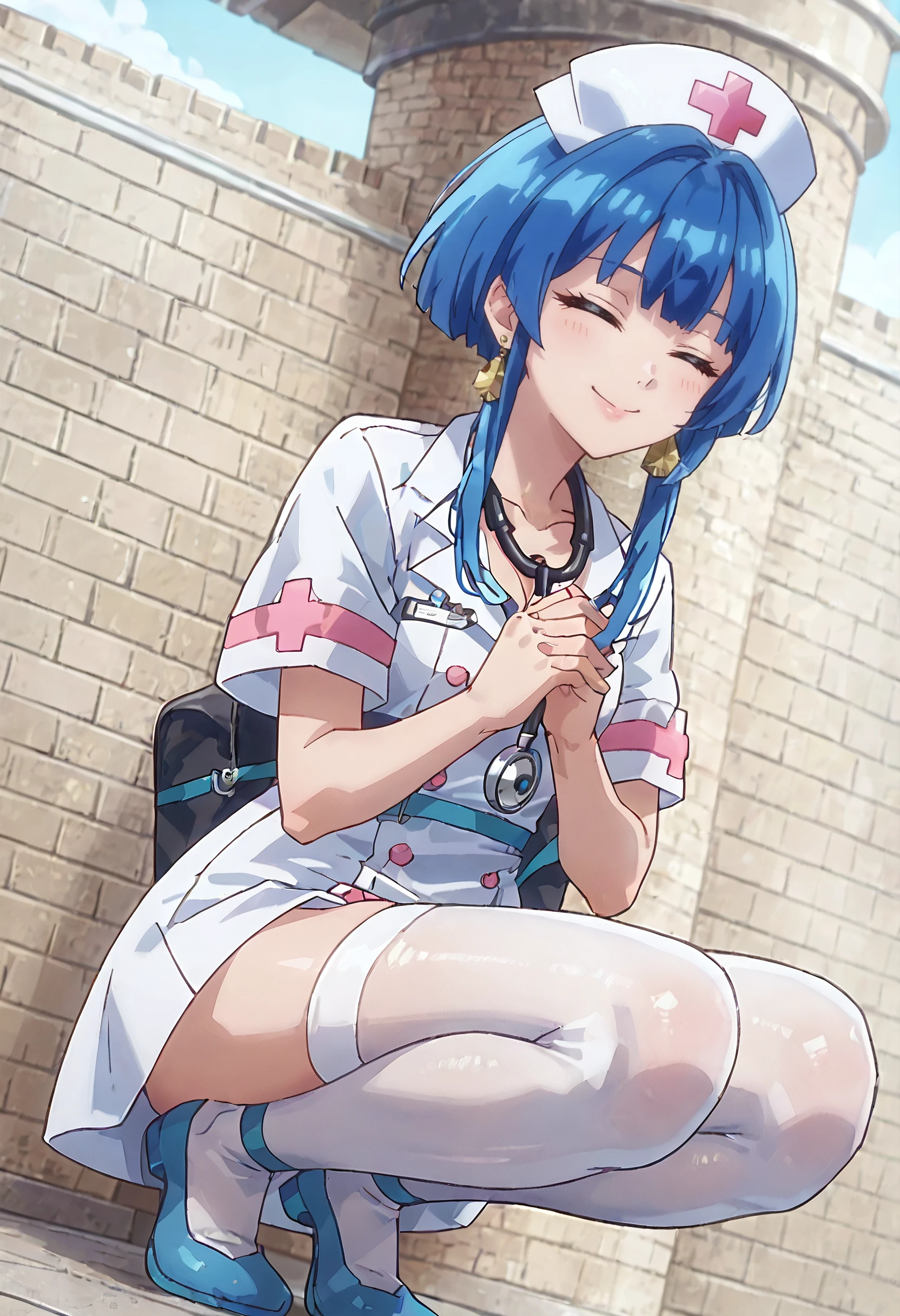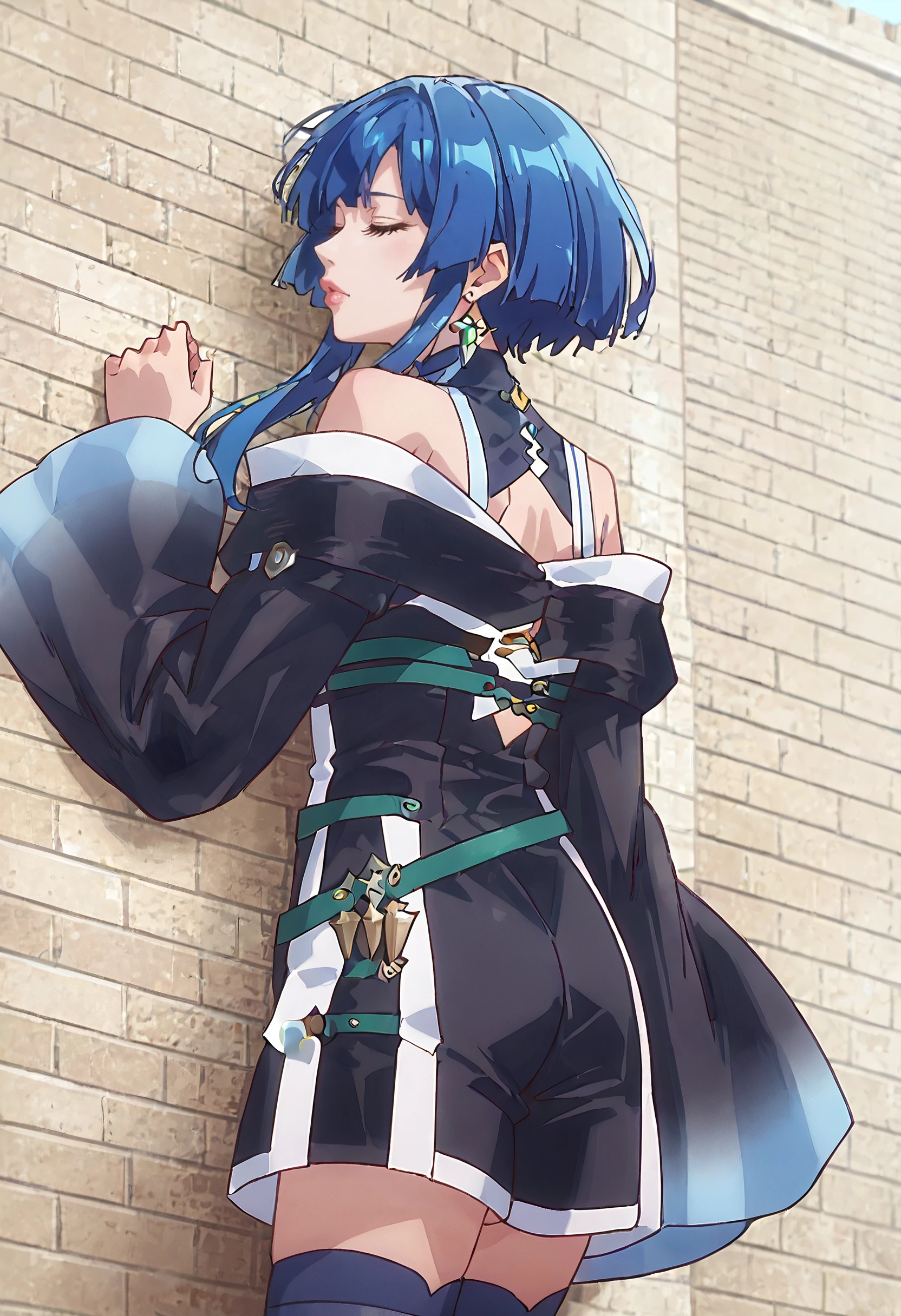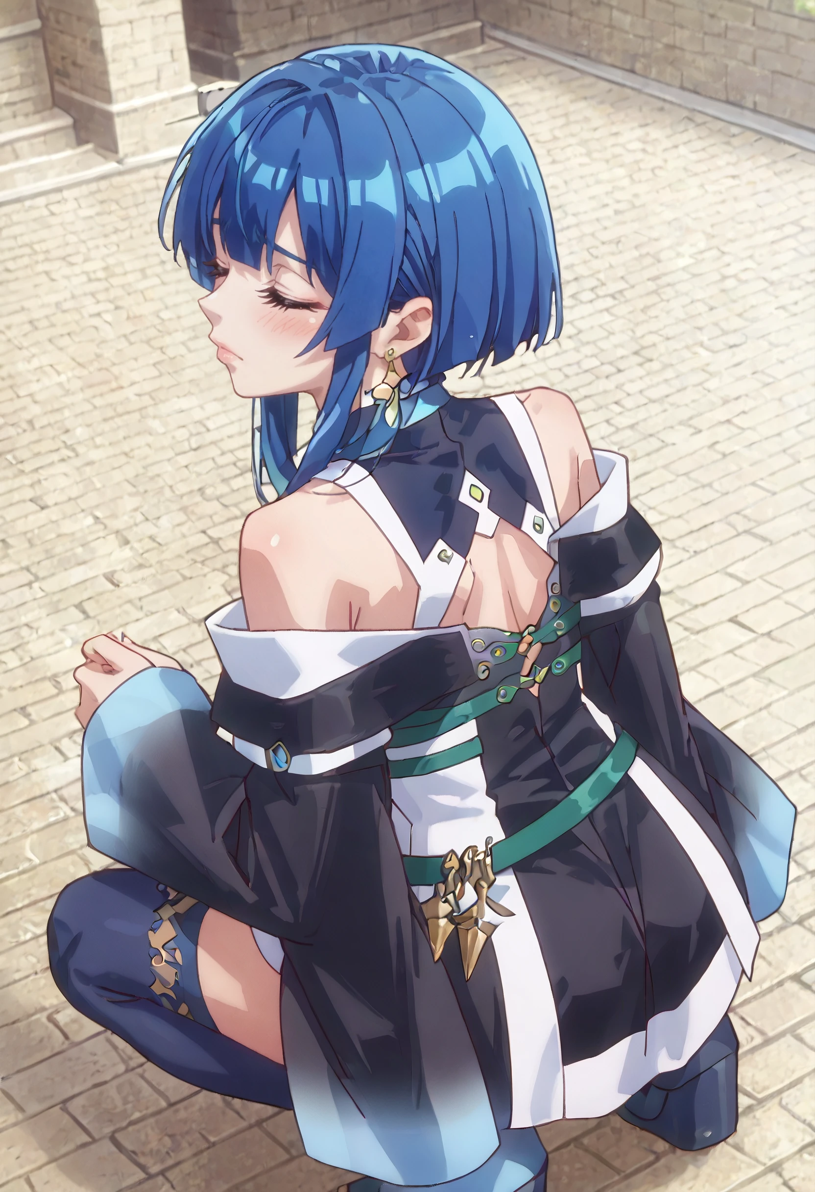 KMaSigne, closed eyes, blue hair, short hair, short hair with long locks, earrings, sidelocks,