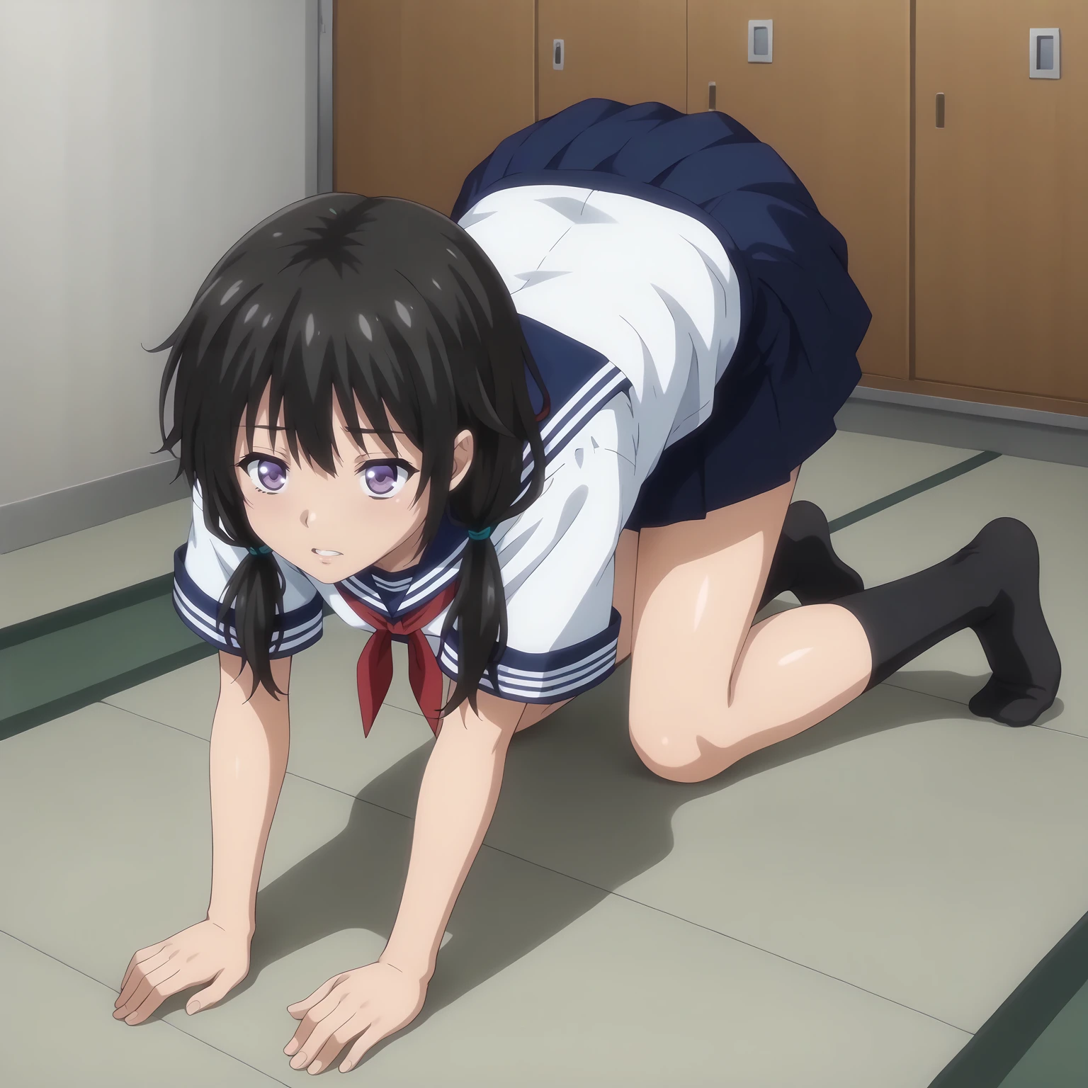 Hayakawa,1girl,black hair,low twintails,purple eyes,