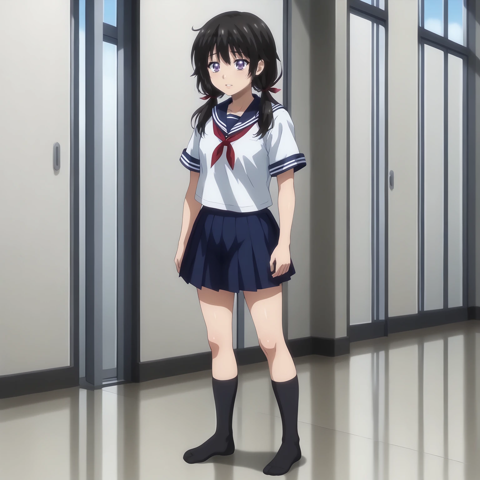 serafuku,white shirt,red_neckerchief,short_sleeves, pleated_skirt,blue skirt, black socks,