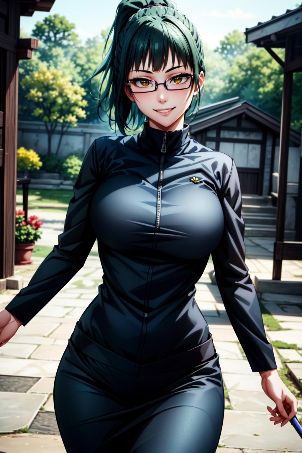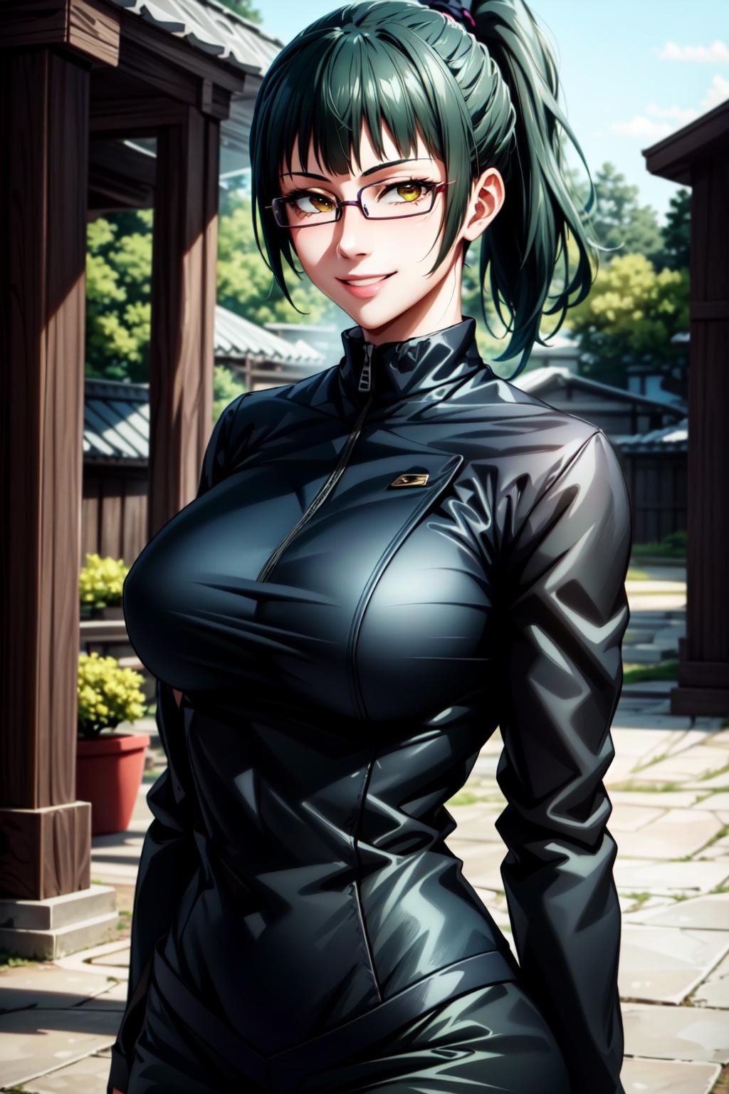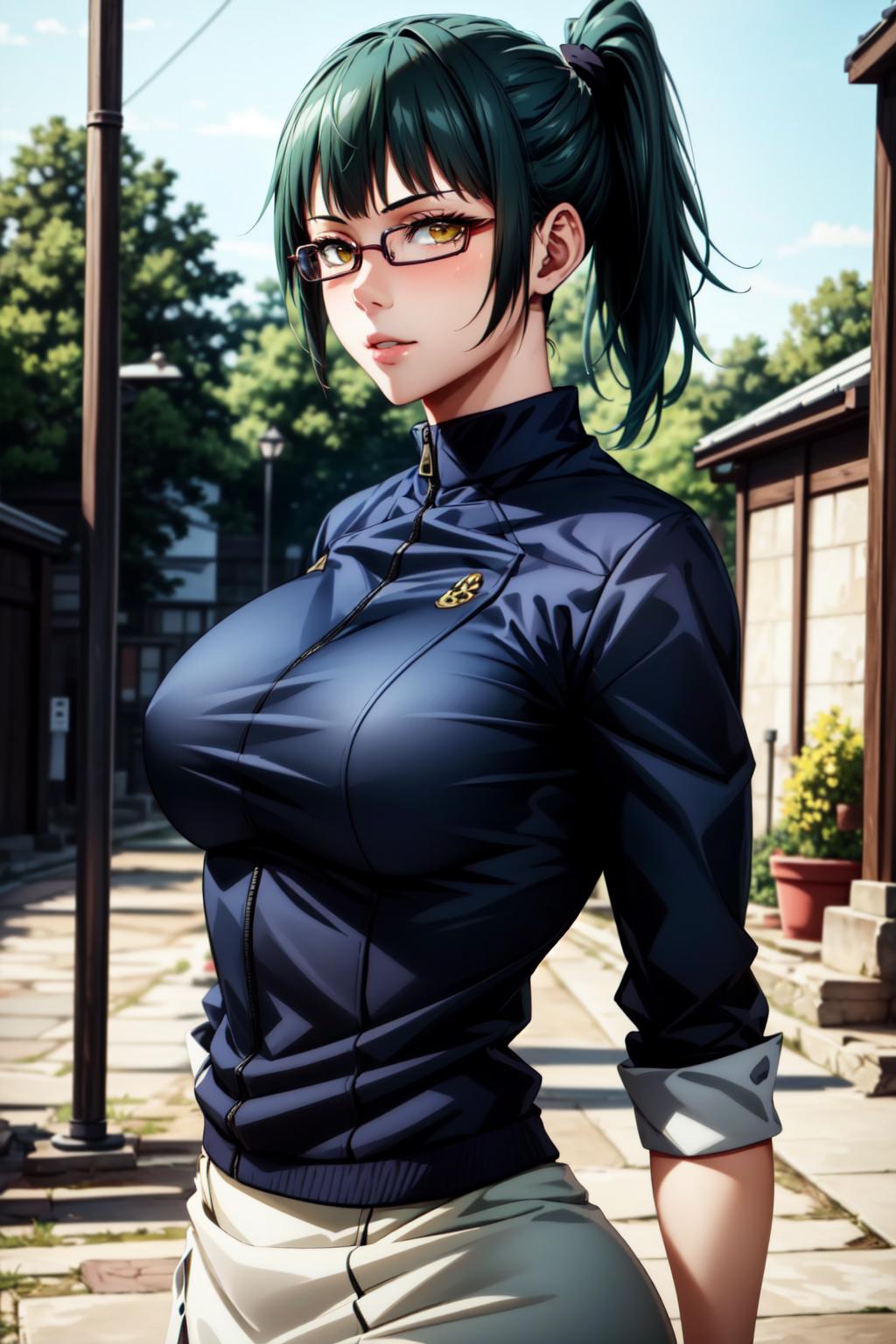 ZeninMakiNDV, 1girl, green hair, yellow eyes, large breasts, ponytail, glasses, jujutsu uniform, jacket, black skirtBest weight: 0.6-0.8