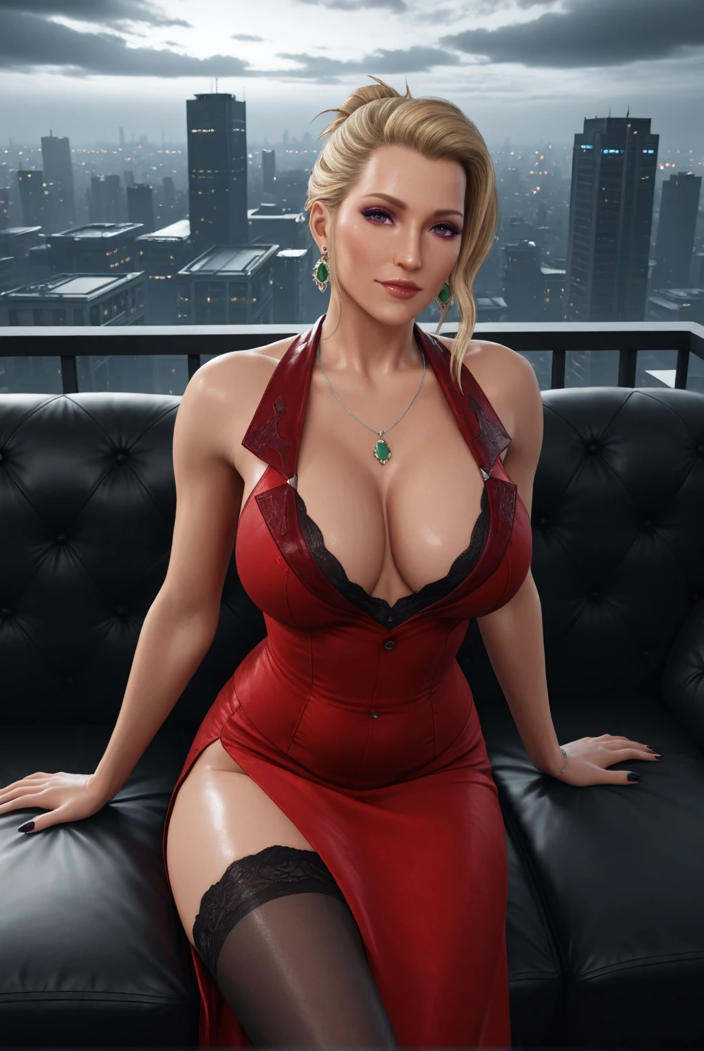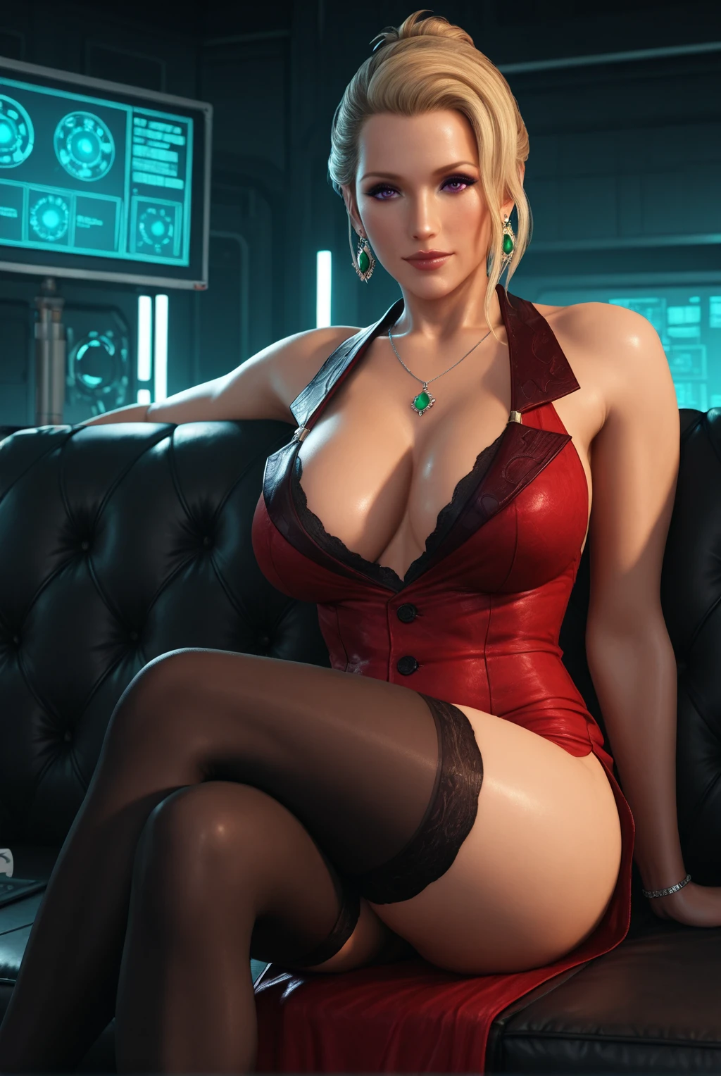 ScarletFF7R, short hair, hair bun, purple eyes, blonde hair, mature female, bare shoulders, earrings, red dress, side slit, makeup, black thighhighs, high heels