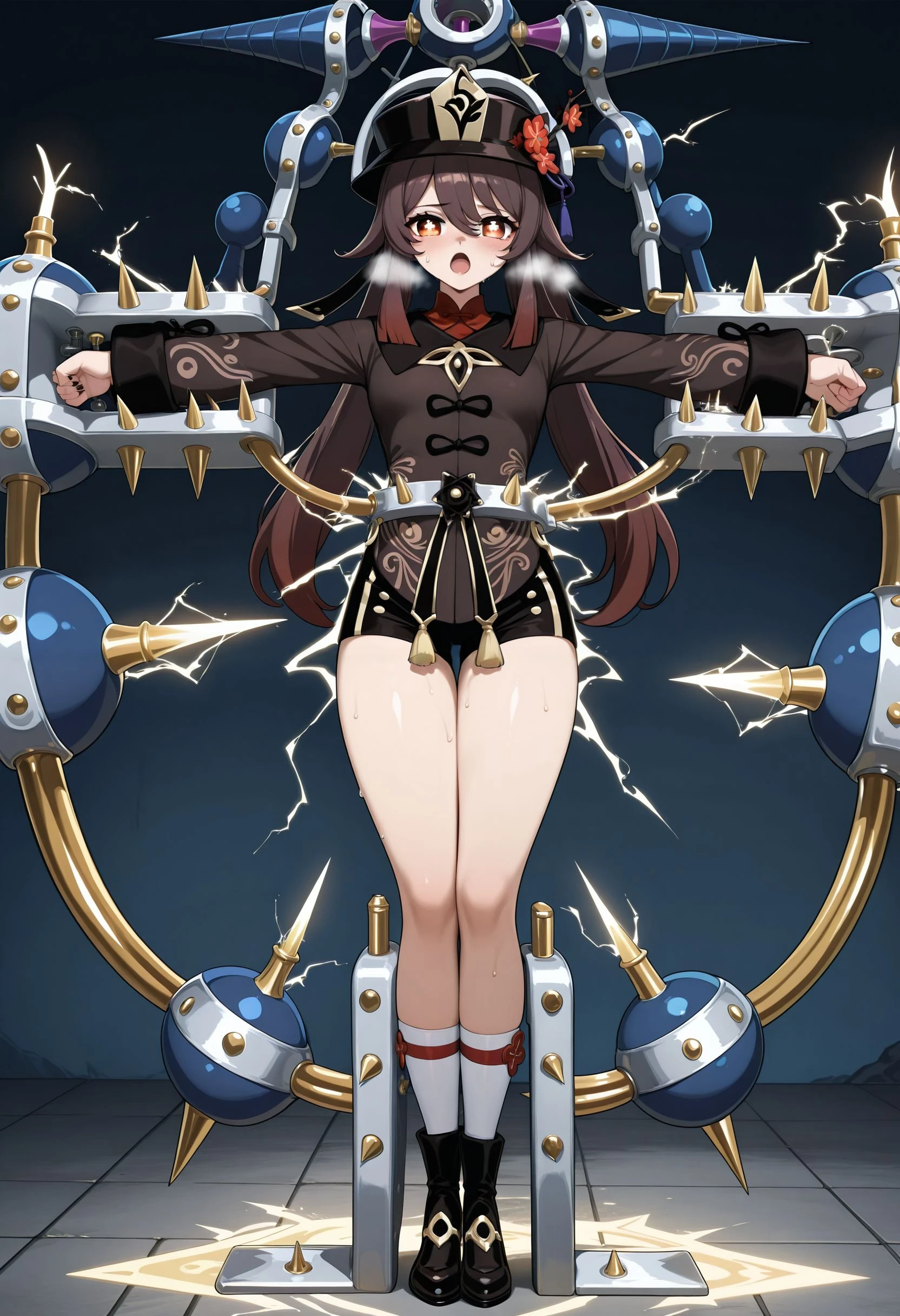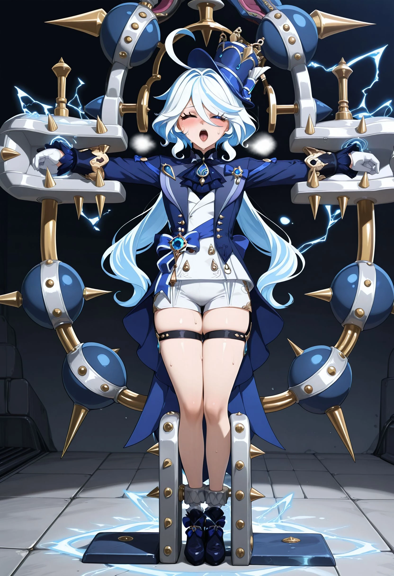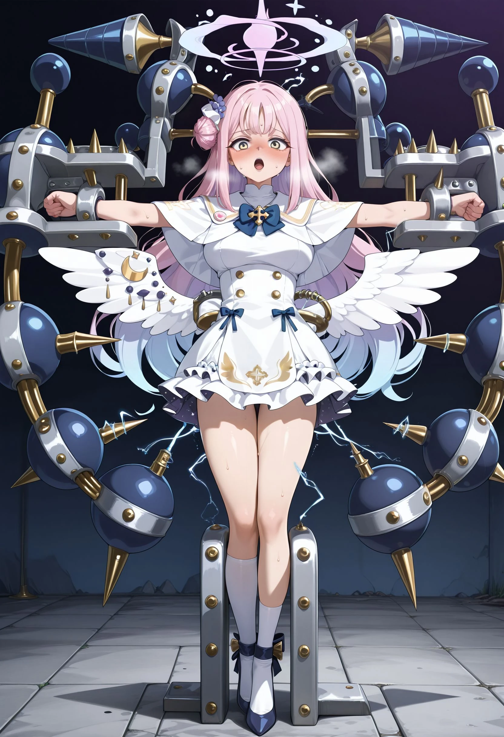 t_pose_restrained, tpsrstrnd, stationary restraints, restrained, t-pose, sex machine, bound, bound wrists, bound ankles, screw, vise, (headgear:1.5), screw in head, screw hair ornament, electricity, electrodes, <lora:t_pose_restrained_illustrious:1>