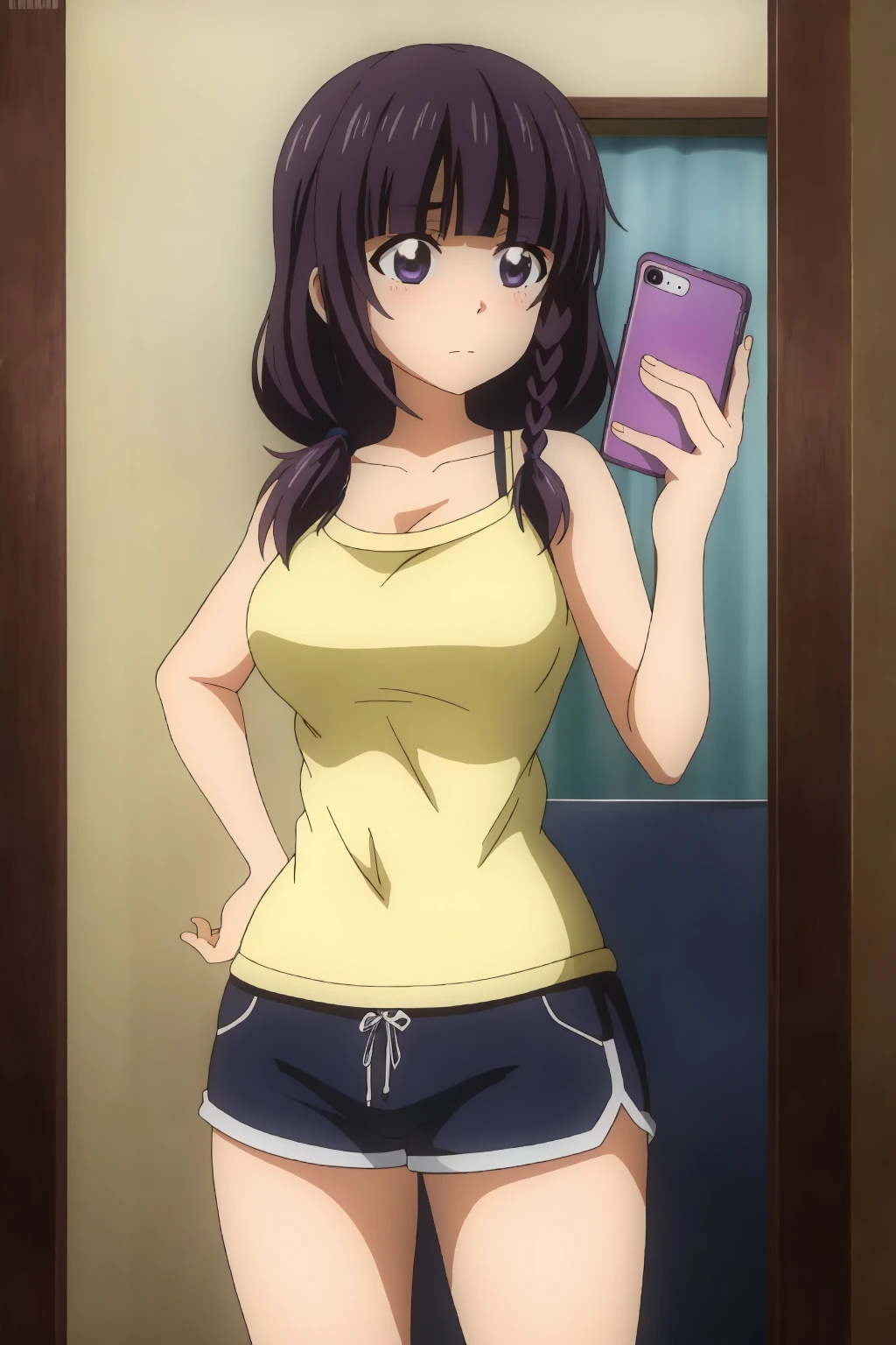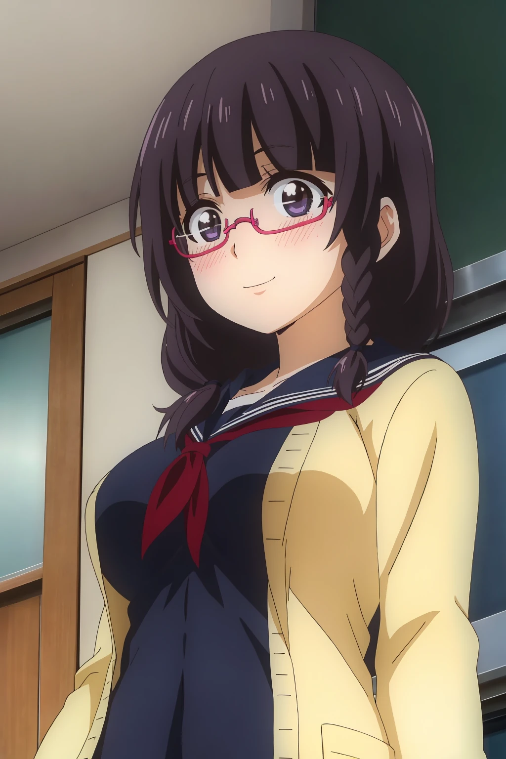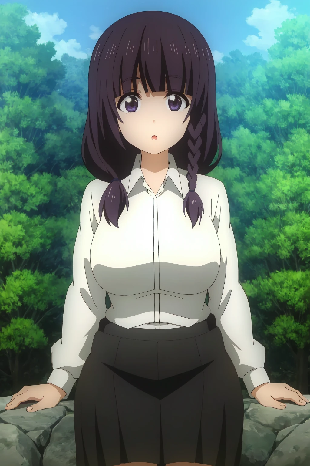 Mayu, purple eyes, purple hair, long hair, hair over shoulder, blunt bangs, twin braids, single braid, twintails,