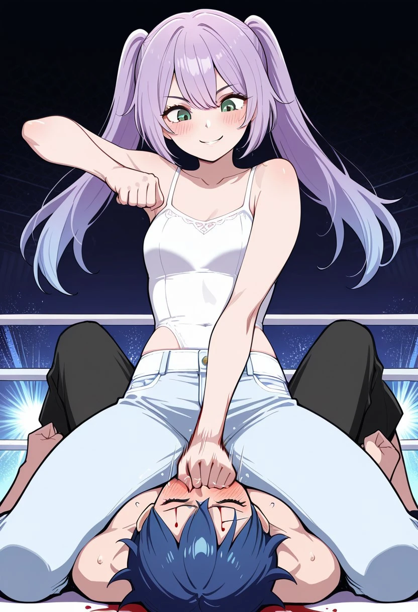 Strike Impact (Back View):masterpiece, best quality, montpunch, montpunch-impact, BackView, 1girl, ass, underwear, thighhighs, twintails, 1boy, sitting, blue hair, feet, wrestling, blood