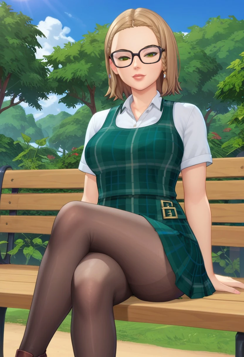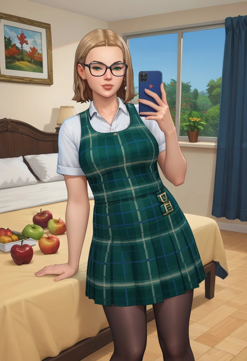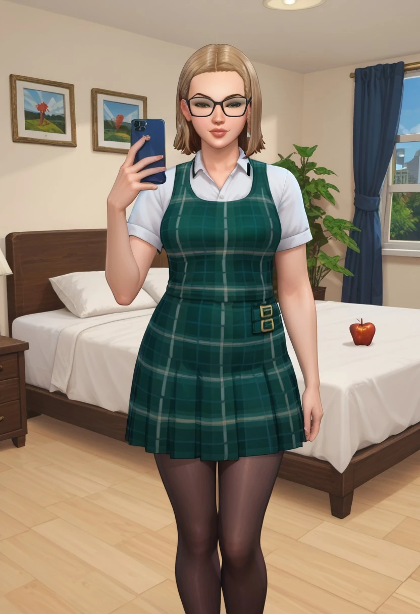 white shirt, short sleeves, collared shirt, green dress, pinafore dress, plaid, black pantyhose, school uniform,