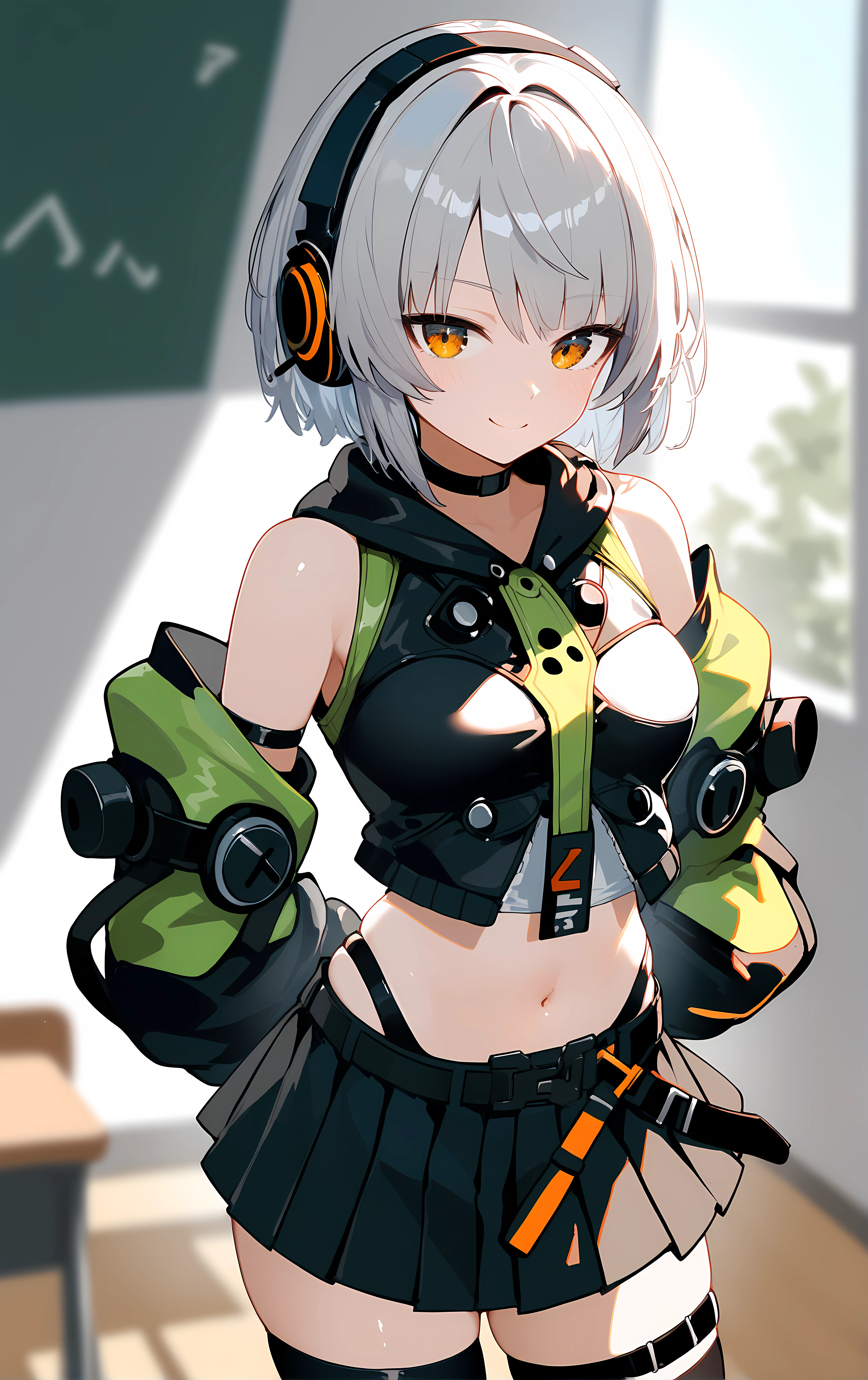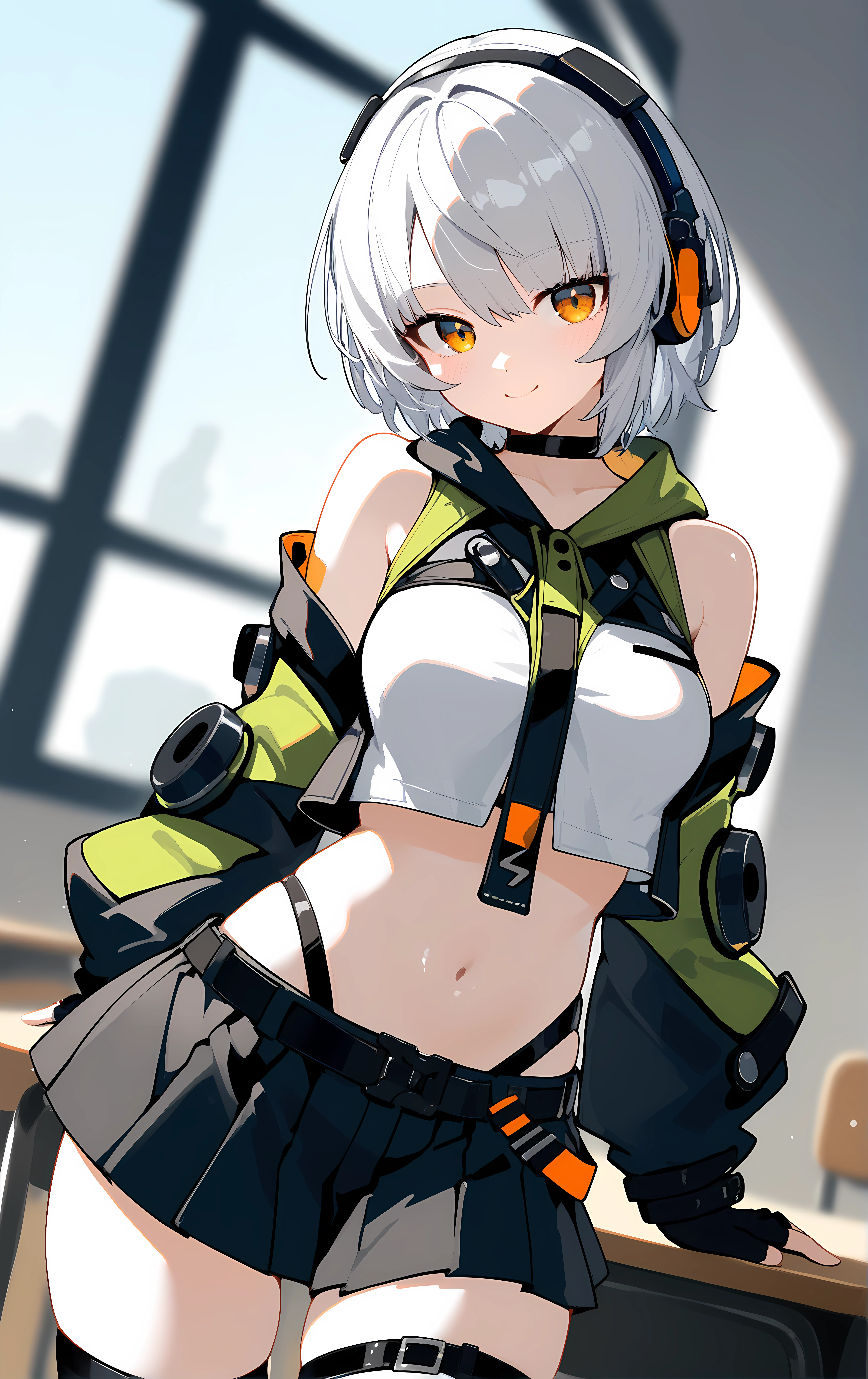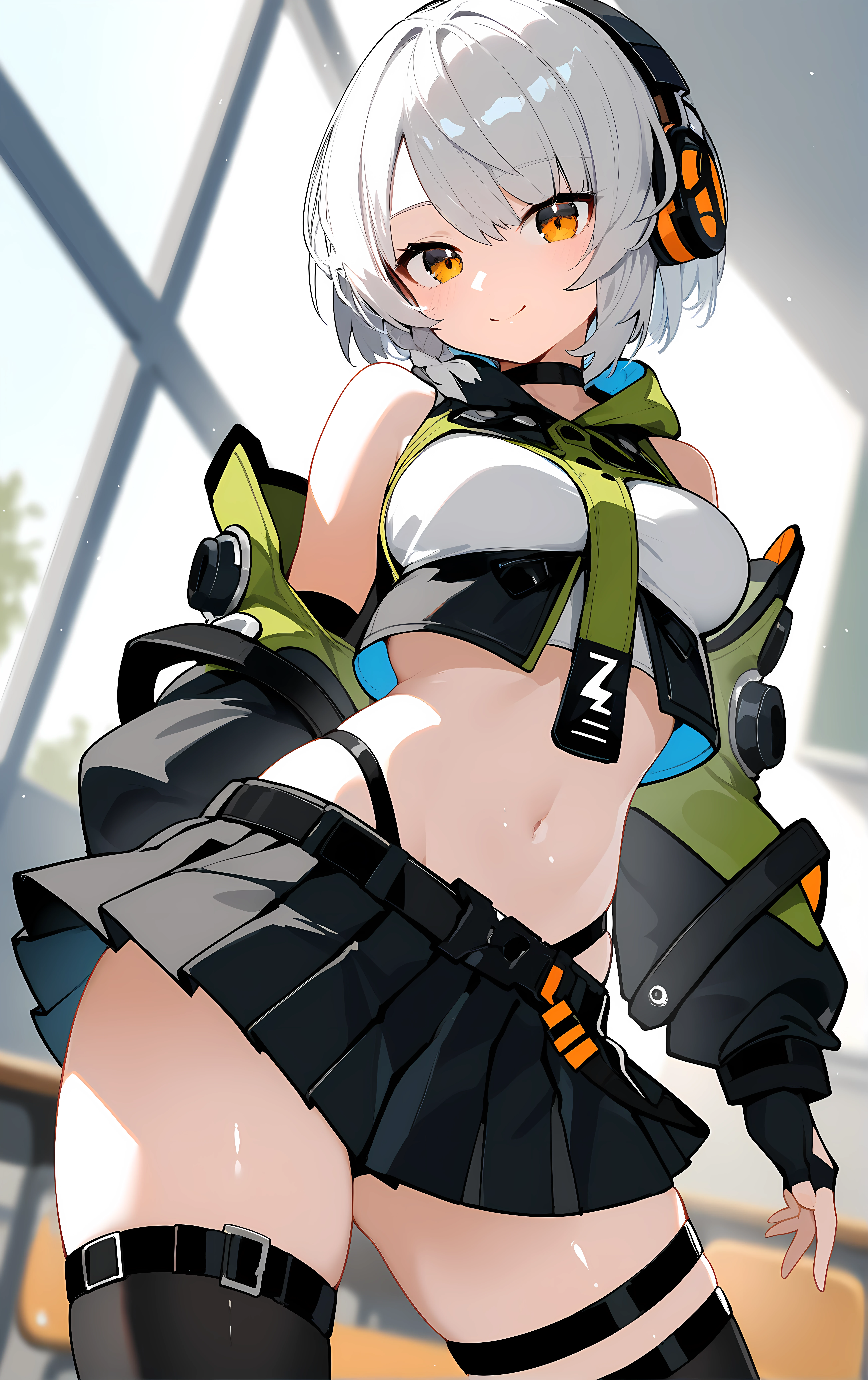 anby, 1girl, solo, skirt, thighhighs, gloves, navel, black_skirt, short_hair, fingerless_gloves, headphones, bare_shoulders, black_gloves, midriff, pleated_skirt, black_thighhighs, white_hair, jacket, miniskirt, thigh_strap, black_jacket, crop_top, choker, long_sleeves, belt, detached_sleeves, orange_eyes, black_choker, stomach, hood, shirt, sleeveless, zettai_ryouiki,