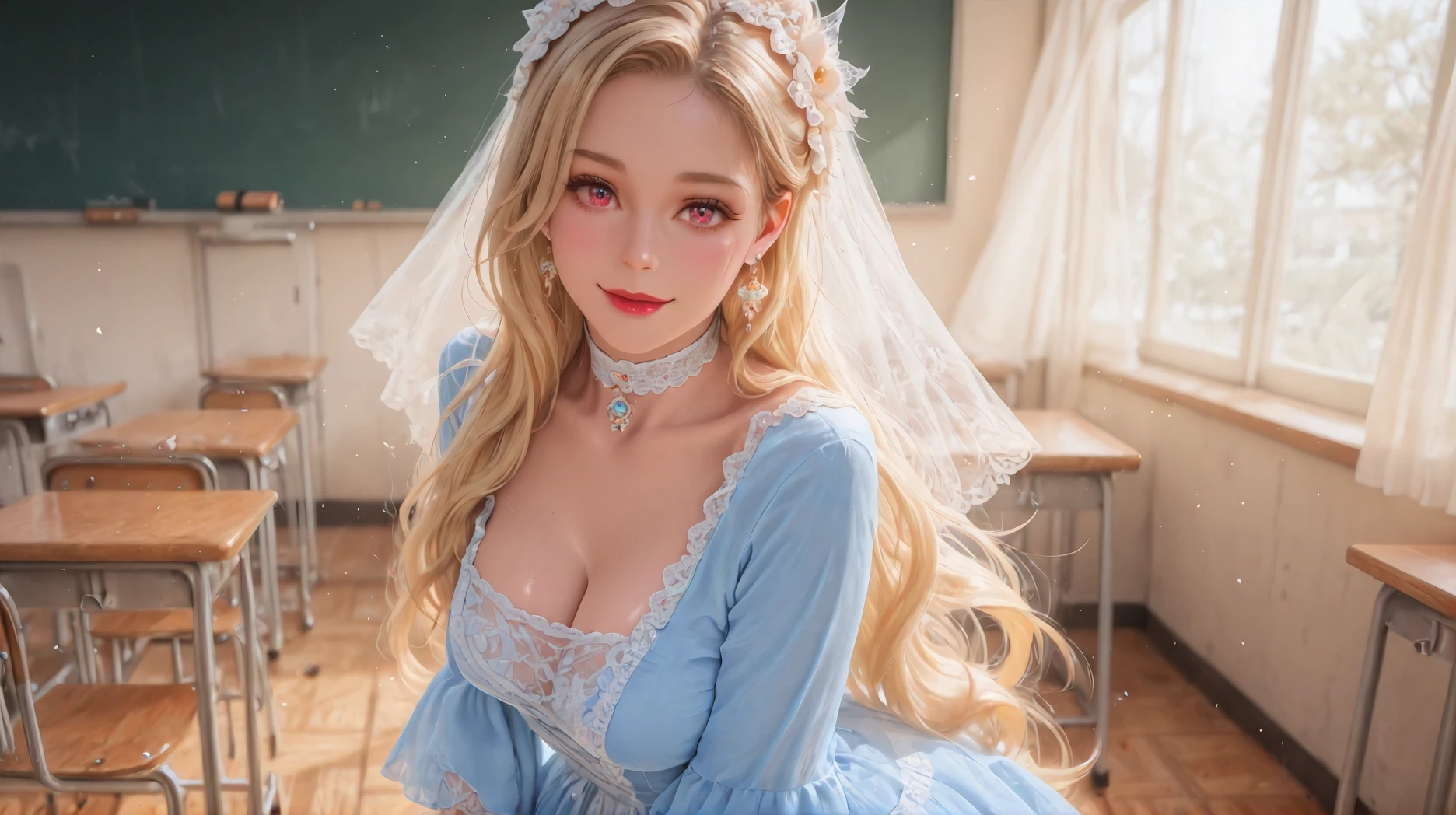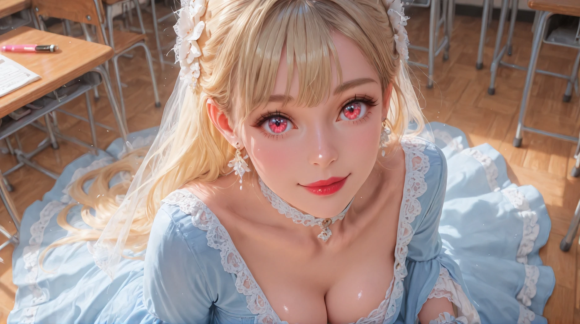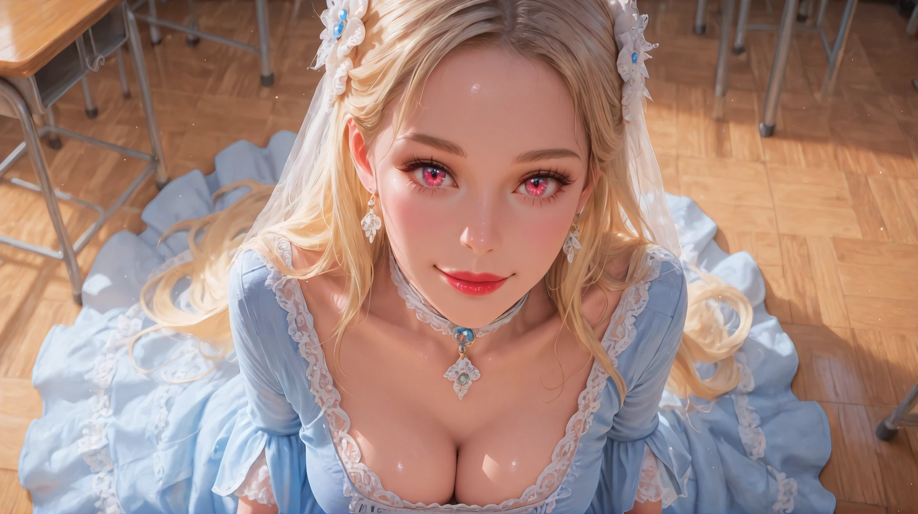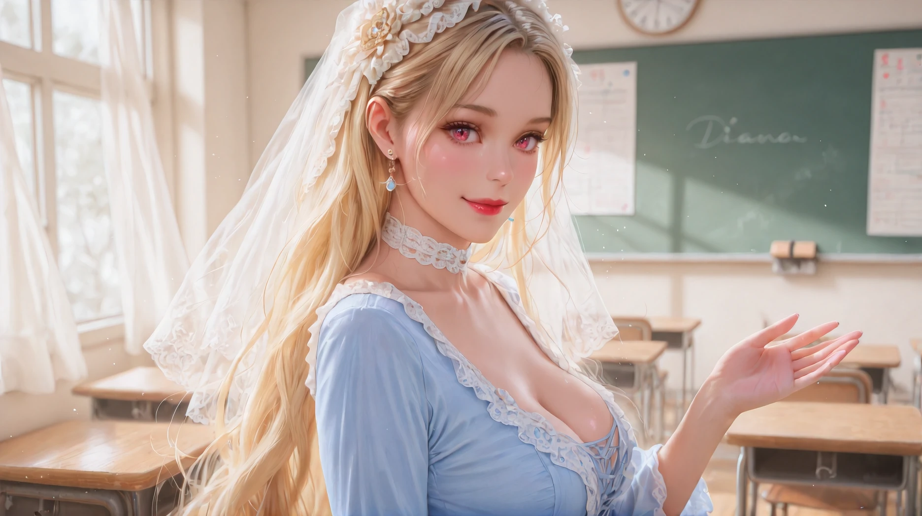 Diana,blue dress,jewelry,earrings,lace,lace trim,hair ornament,choker,long sleeves