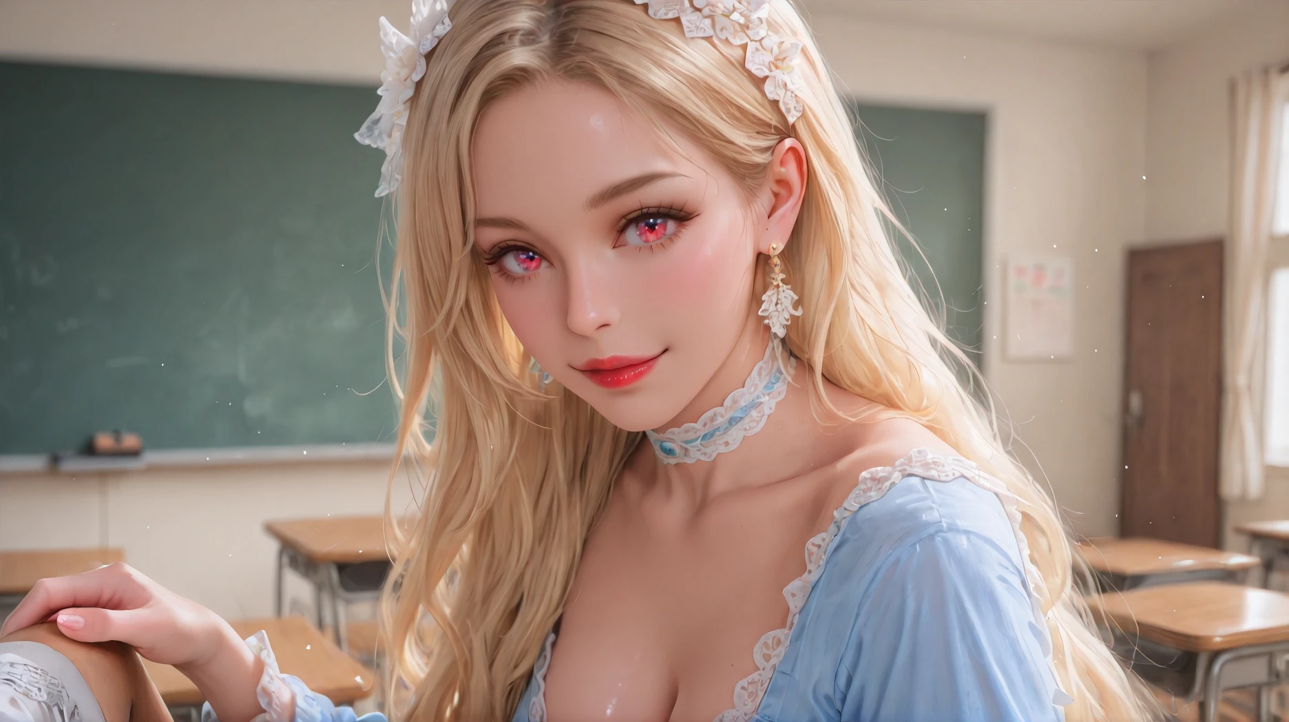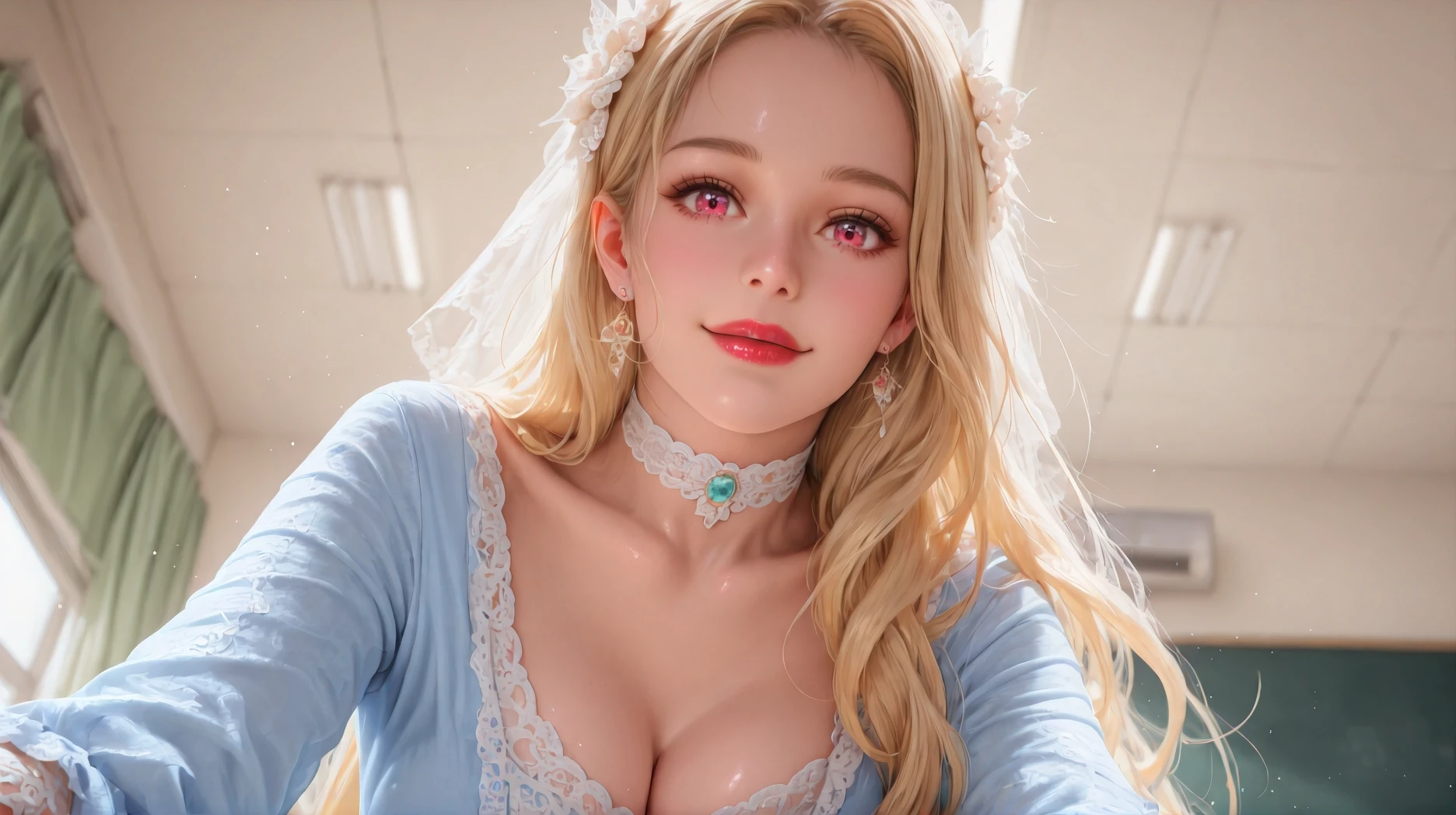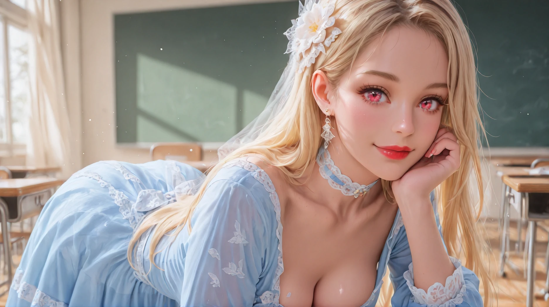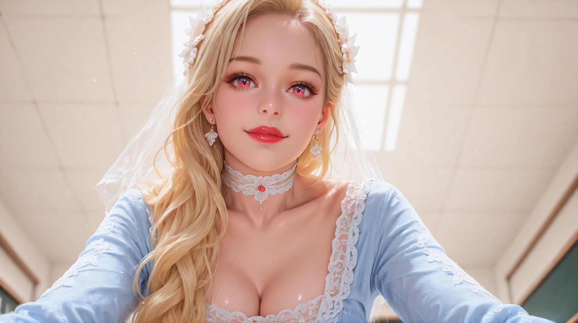 Diana,blue dress,jewelry,earrings,lace,lace trim,hair ornament,choker,long sleeves