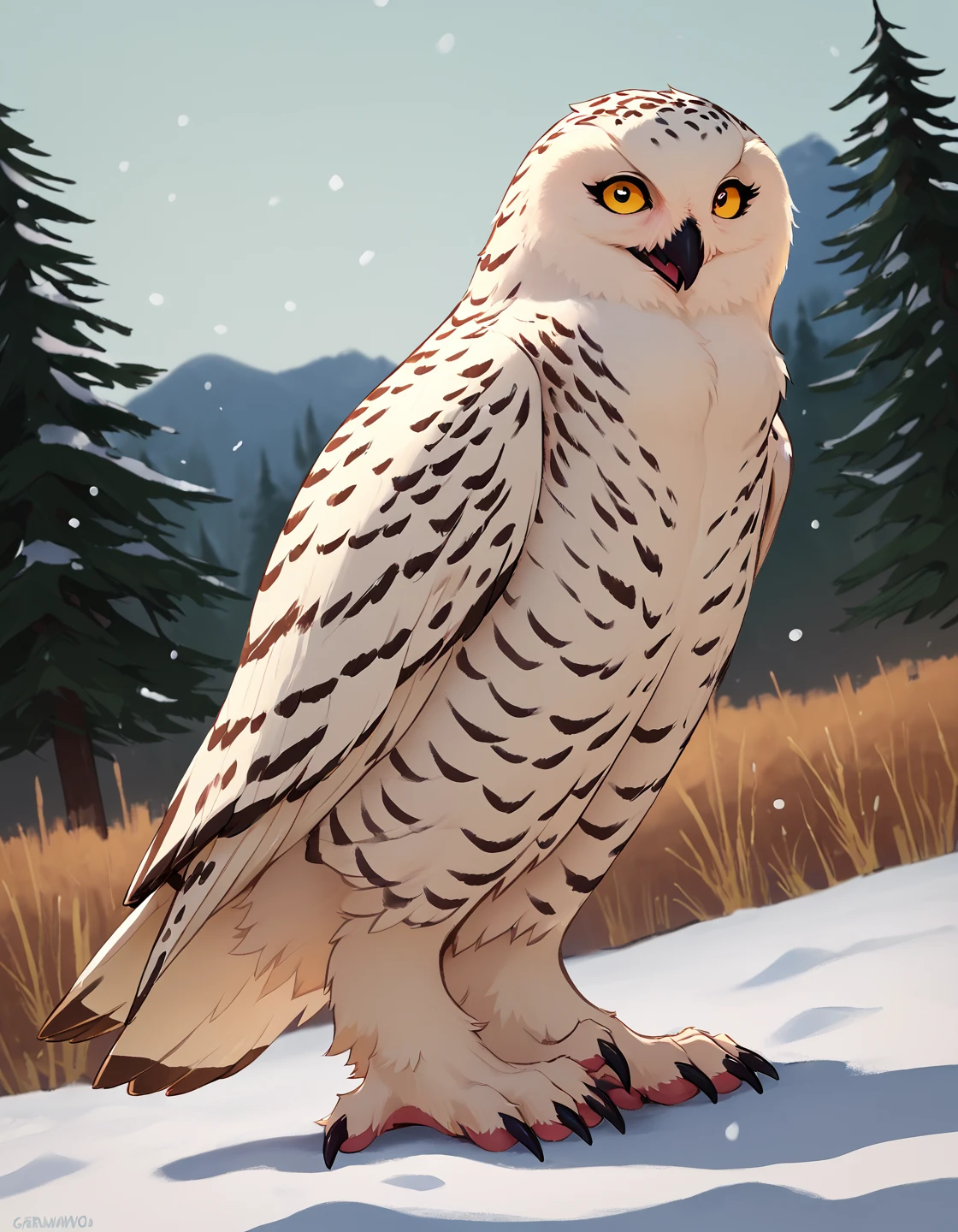 sn0wy 0wl, anthro snowy owl, white feathers, big yellow eyes