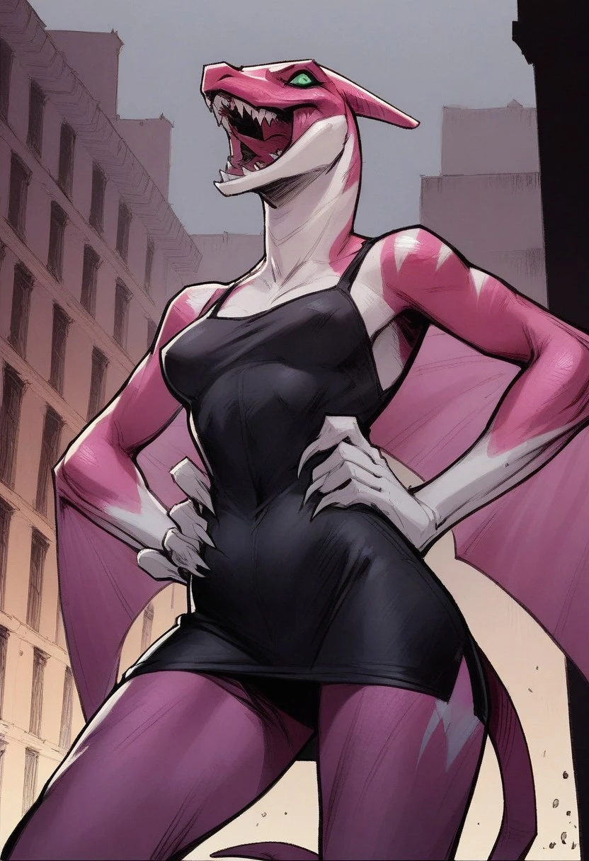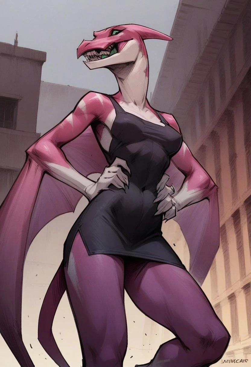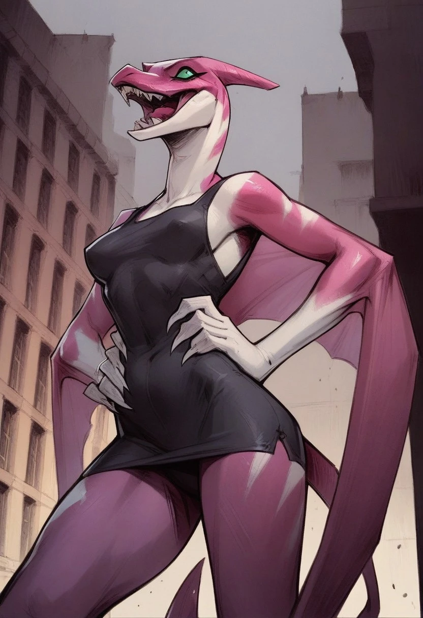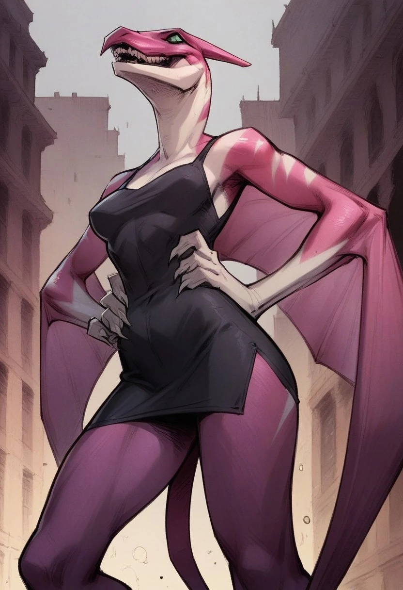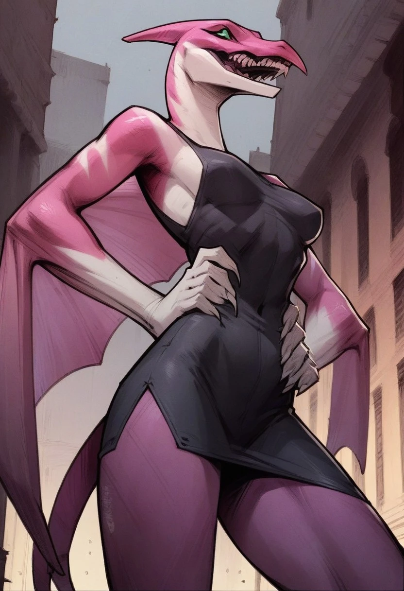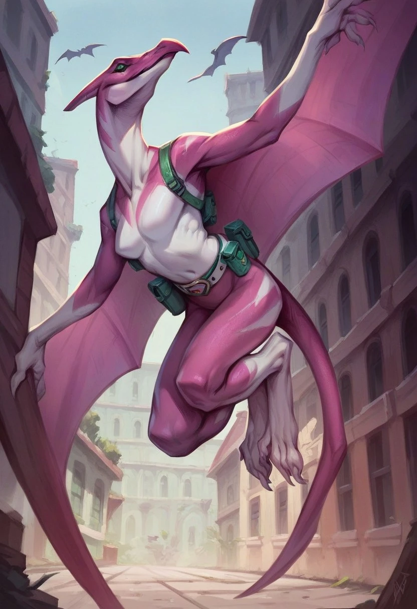 PMPR, furry female, pterodactyl, pink skin, multicolored skin, wings, tail, claws, sharp teeth, green eyes, colored sclera, medium breasts, belt