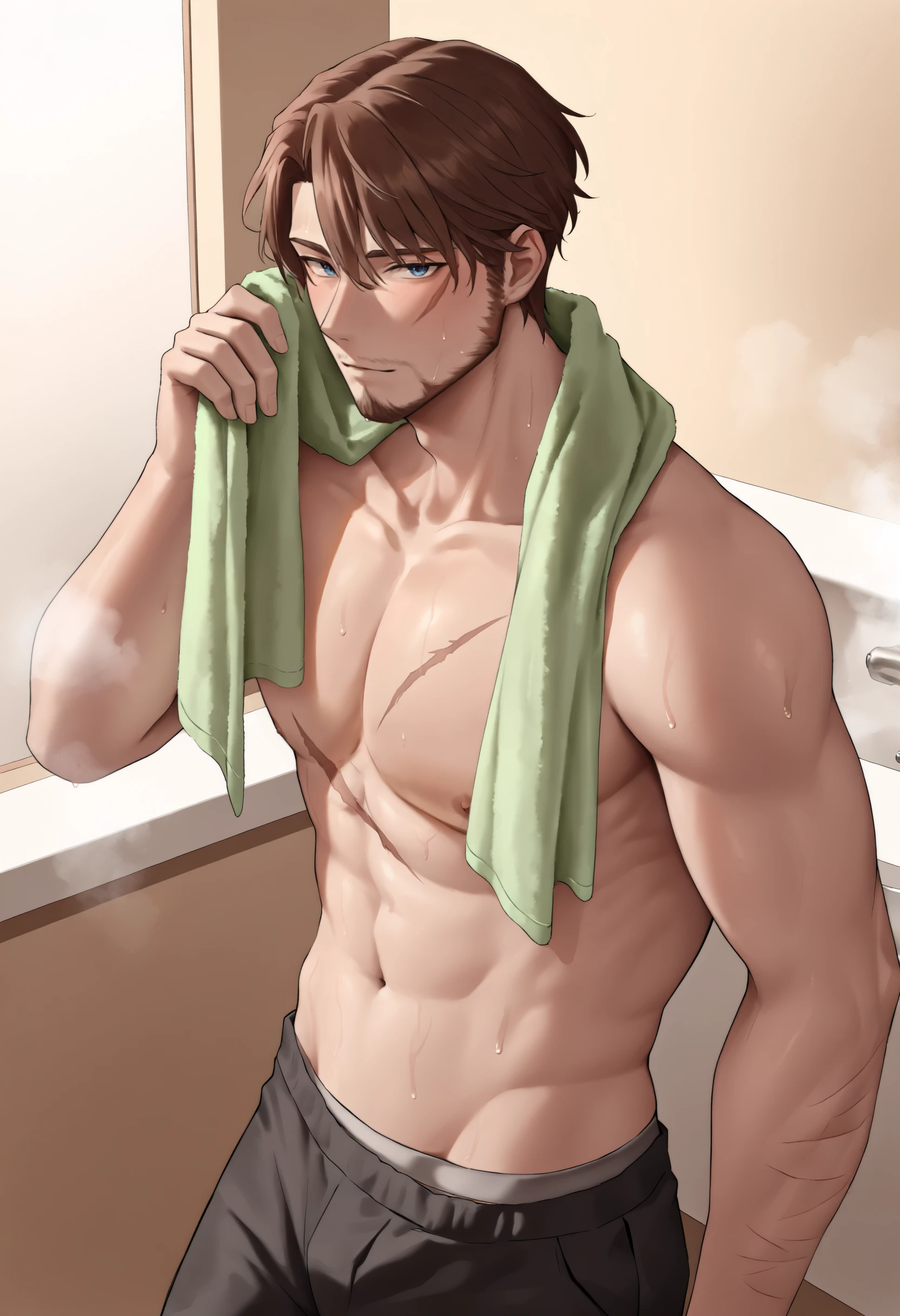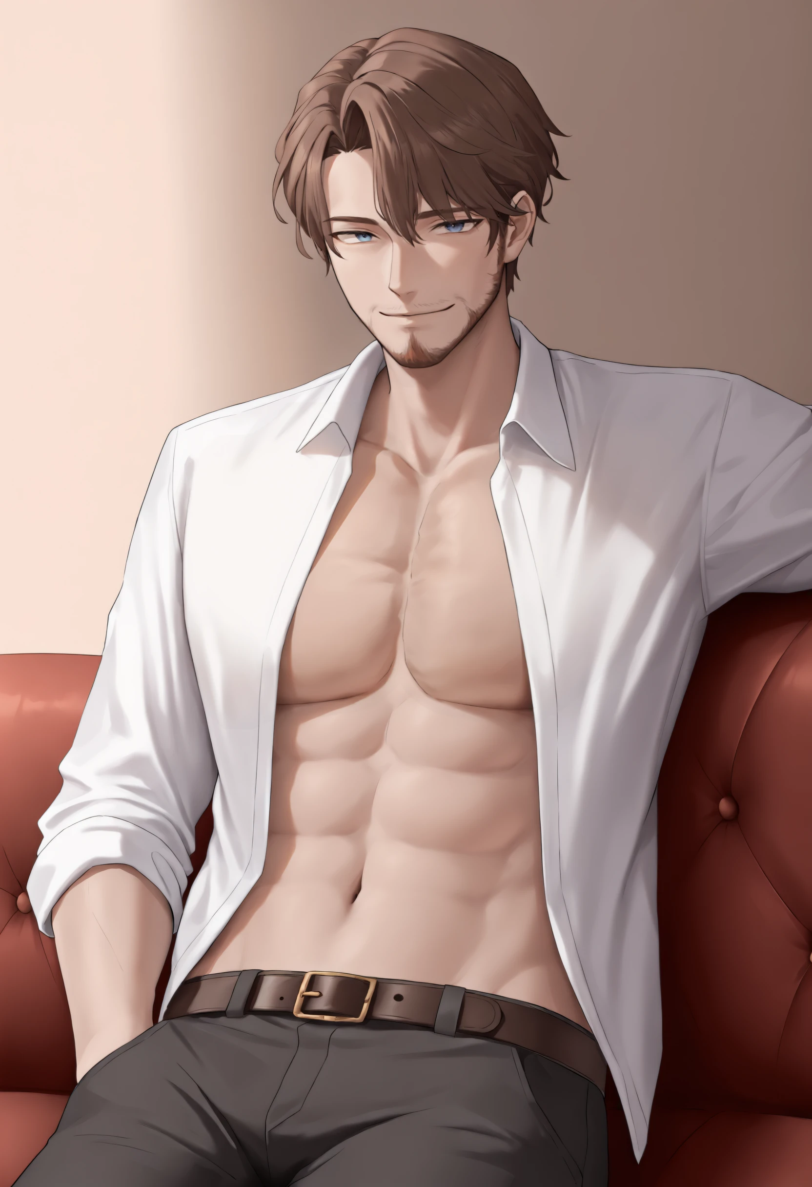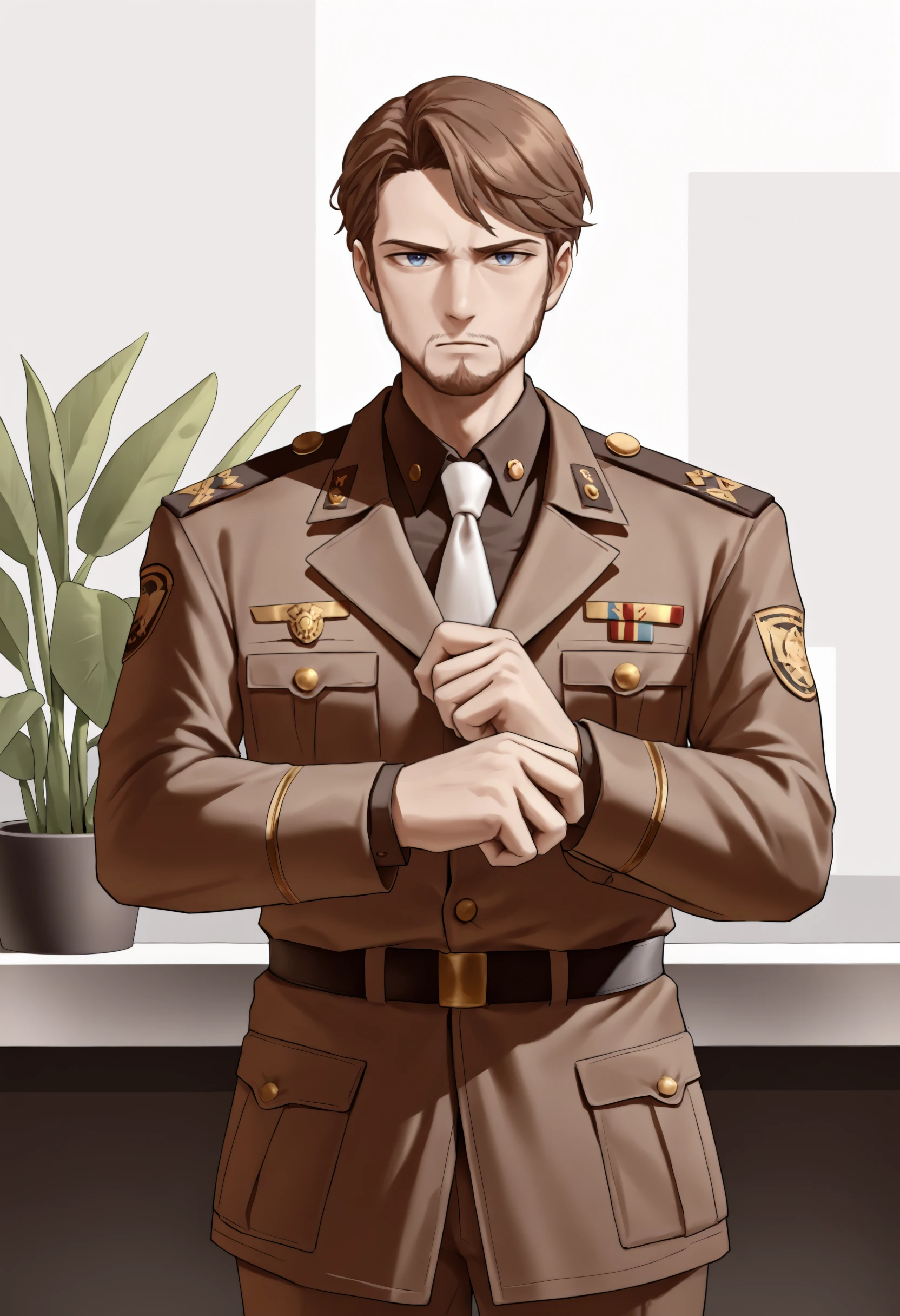 jeloanrsn, brown hair, blue eyes, facial hair, military uniform, brown jacket, white necktie, belt, brown pants
