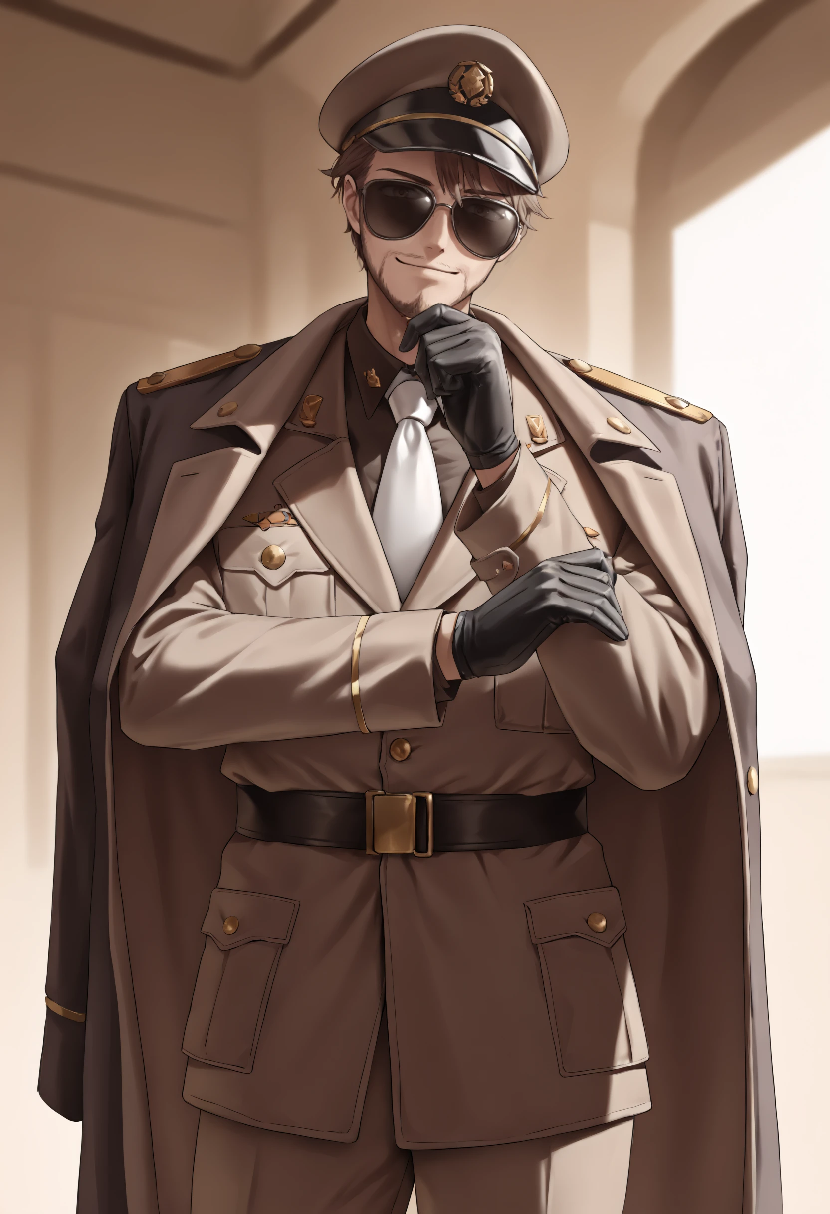 jeloanrsn, brown hair, facial hair, peaked cap, sunglasses, military uniform, black coat, coat on shoulders, brown jacket, white necktie, belt, black gloves, brown pants