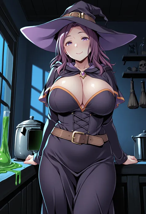 nagorr, 1girl, purple hair, long hair, parted bangs, purple eyes, large breasts, mature female,