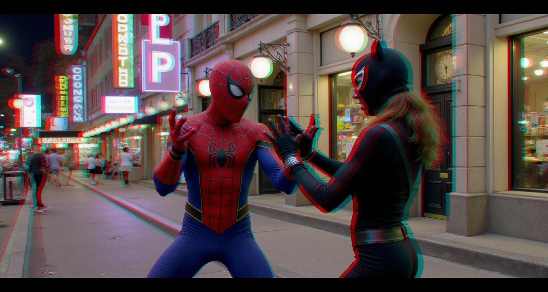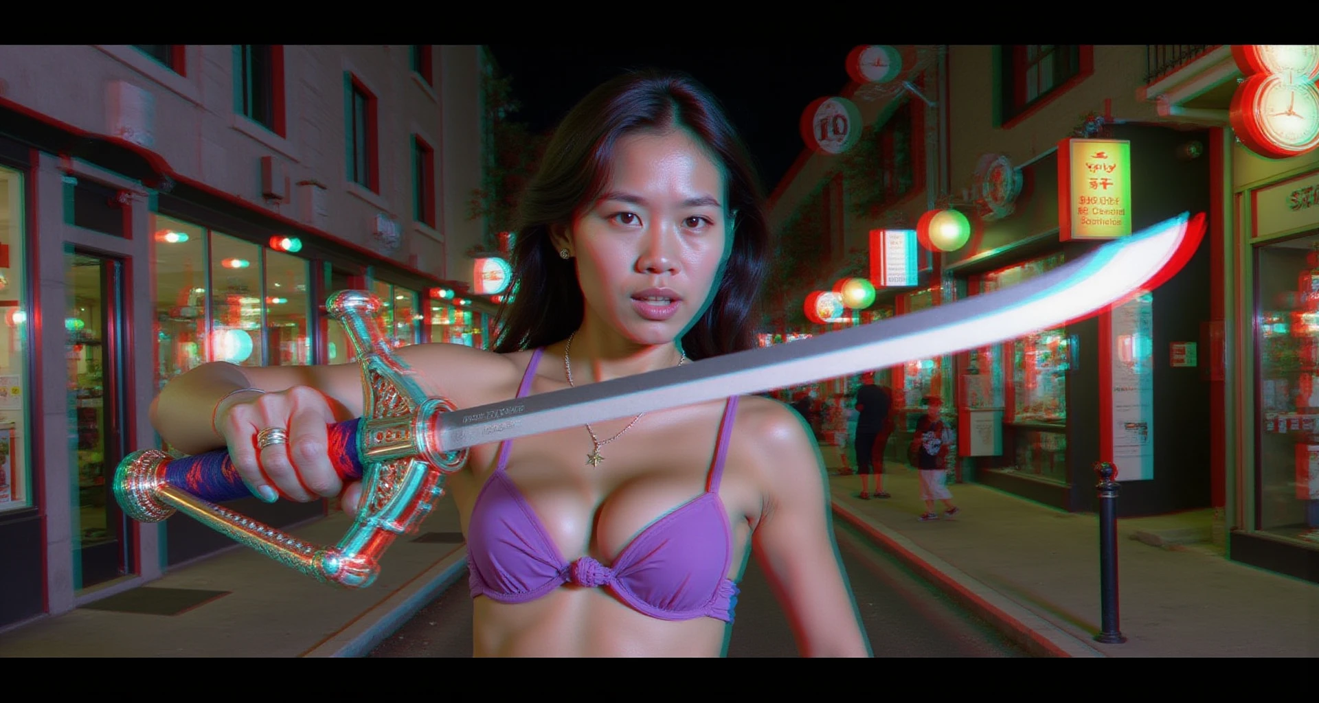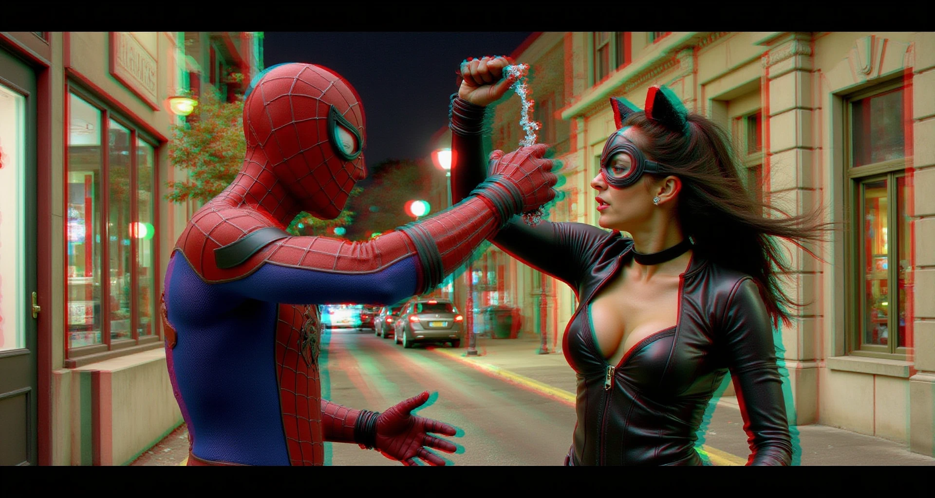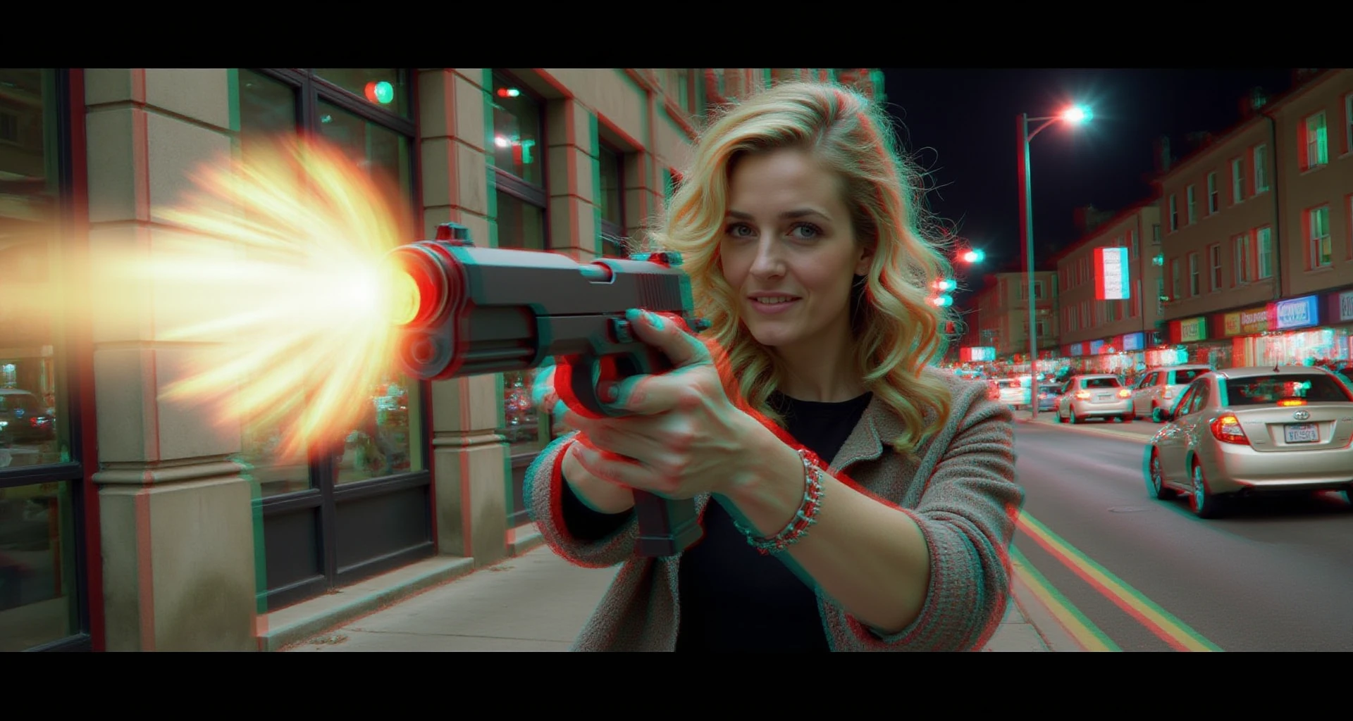 "Harley Quinn points a gun at the camera, Anaglyph3D image of Harley Quinn, the gun barrel is sticking out towards the camera in 3D, infinite depth, Anaglyph 3D is a stereoscopic 3D effect that uses red and cyan filters to encode images for each eye. Two images are created, one with a red filter and one with a cyan filter, the images are superimposed but offset so that the main subject is in the center and the foreground and background are shifted laterally, 16k, HDR, amazing lighting, fully 3D, the Anaglyph3D effect brings the image to life as you look at it, the anaglyph3d effect gives depth to every pixel of the image for 100% realism and depth, their hands have 4 fingers and one thumb on each hand, you can see the depth between everything in the image, every strand of hair, everything in the image, the depth of every curve, the depth of all the light and every shadow"