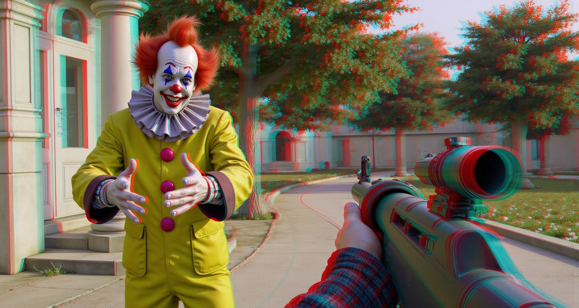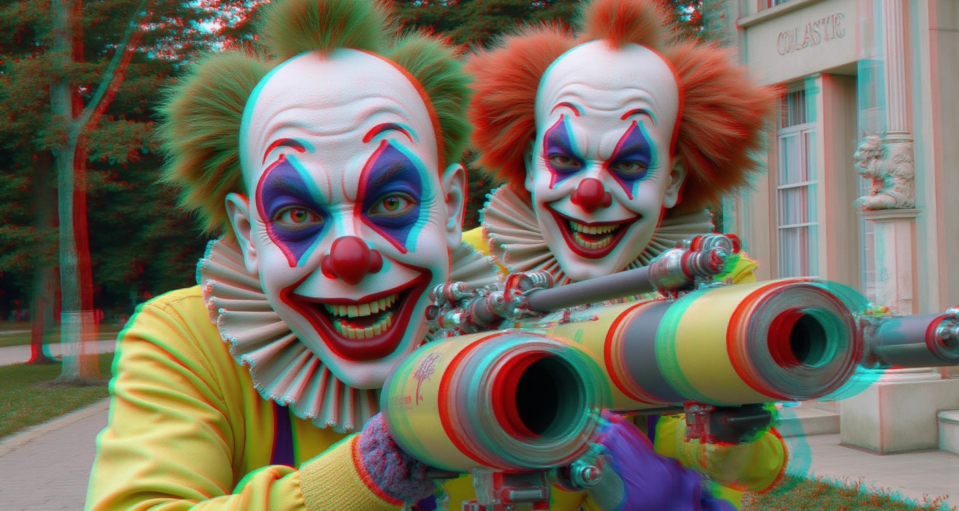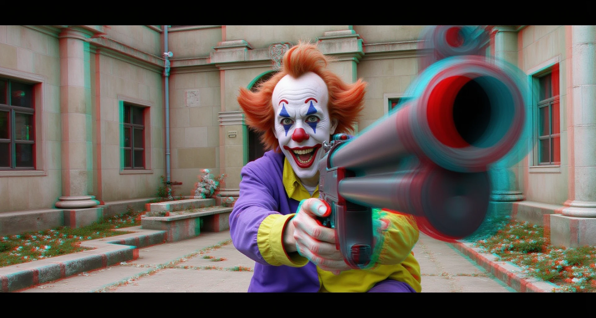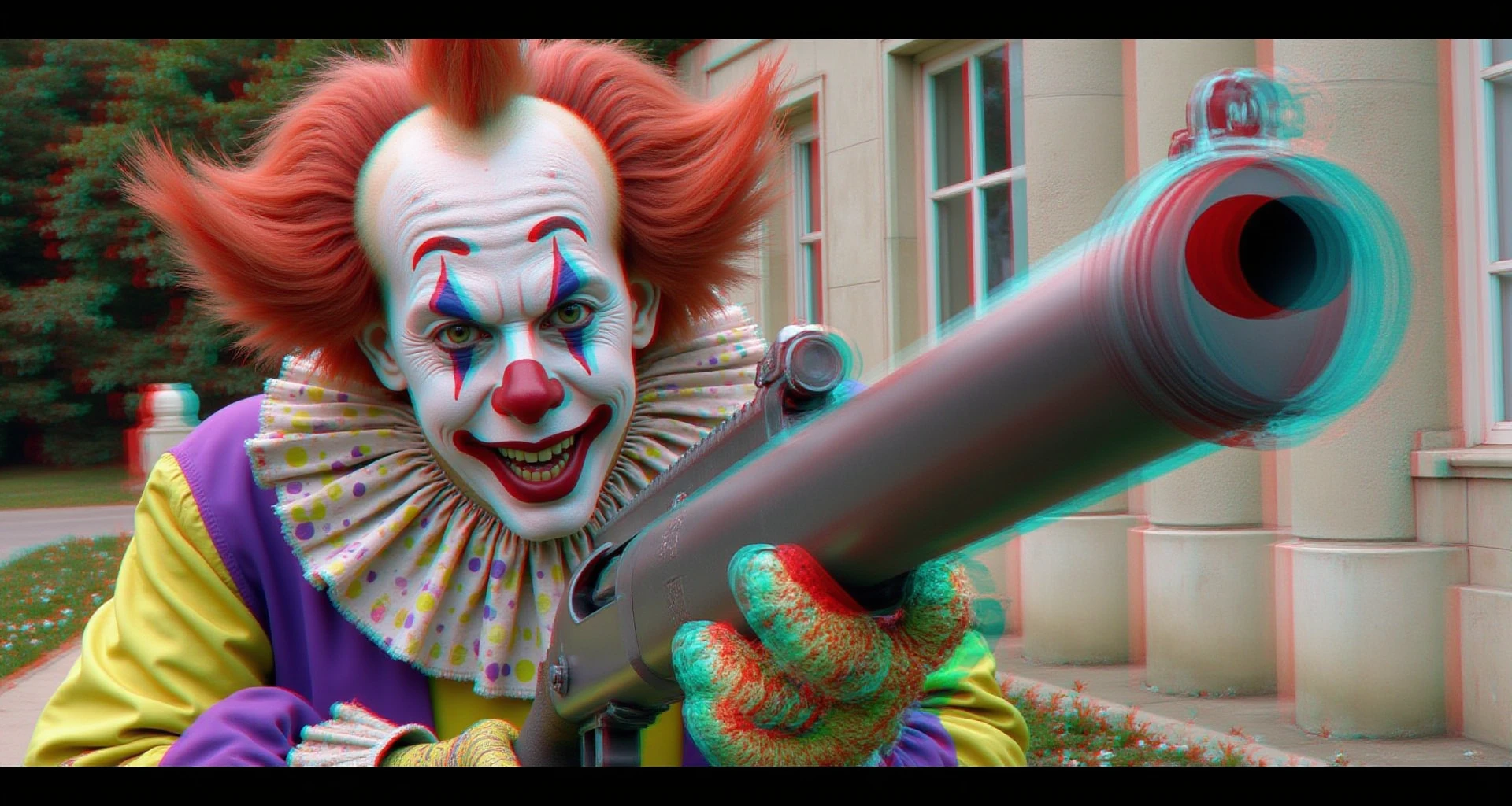 "Anaglyph3D image of a first person shooter video game where you hunt killer clowns with a shotgun, sticking out towards the camera in 3D, Anaglyph 3D is a stereoscopic 3D effect that uses red and cyan filters to encode images for each eye. Two images are created, one with a red filter and one with a cyan filter, the images are superimposed but offset so that the main subject is in the center and the foreground and background are shifted laterally, 16k, HDR, amazing lighting, fully 3D, the Anaglyph3D effect brings the image to life as you look at it"