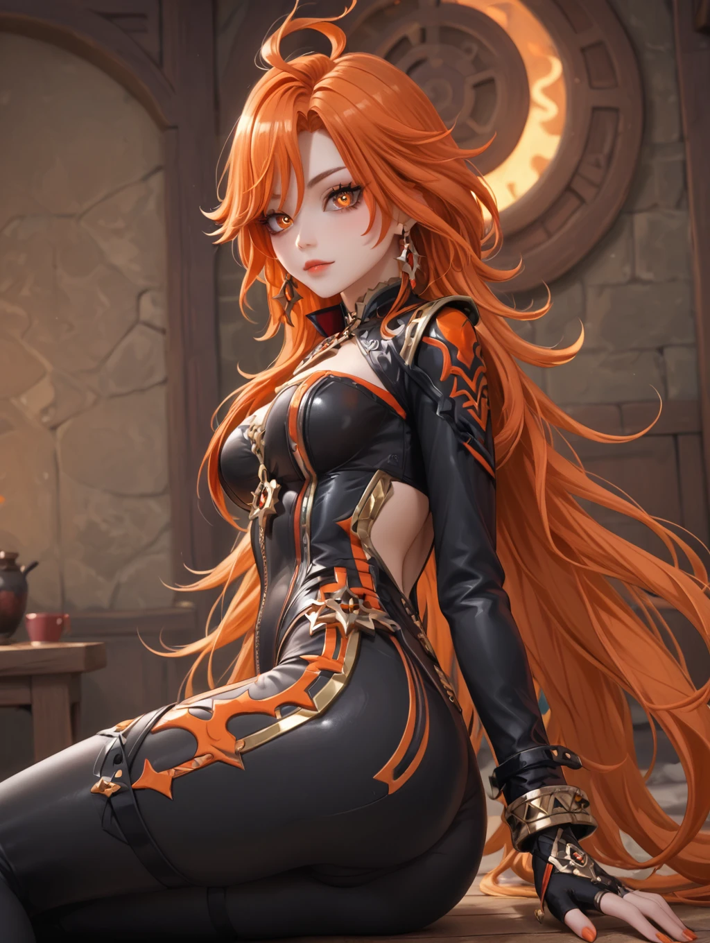 1girl, mavuika (genshin inpact), mavuika, (official mihoyo), (genshin inpact), orange burning hair, simbol eyes, tight leather outfit,