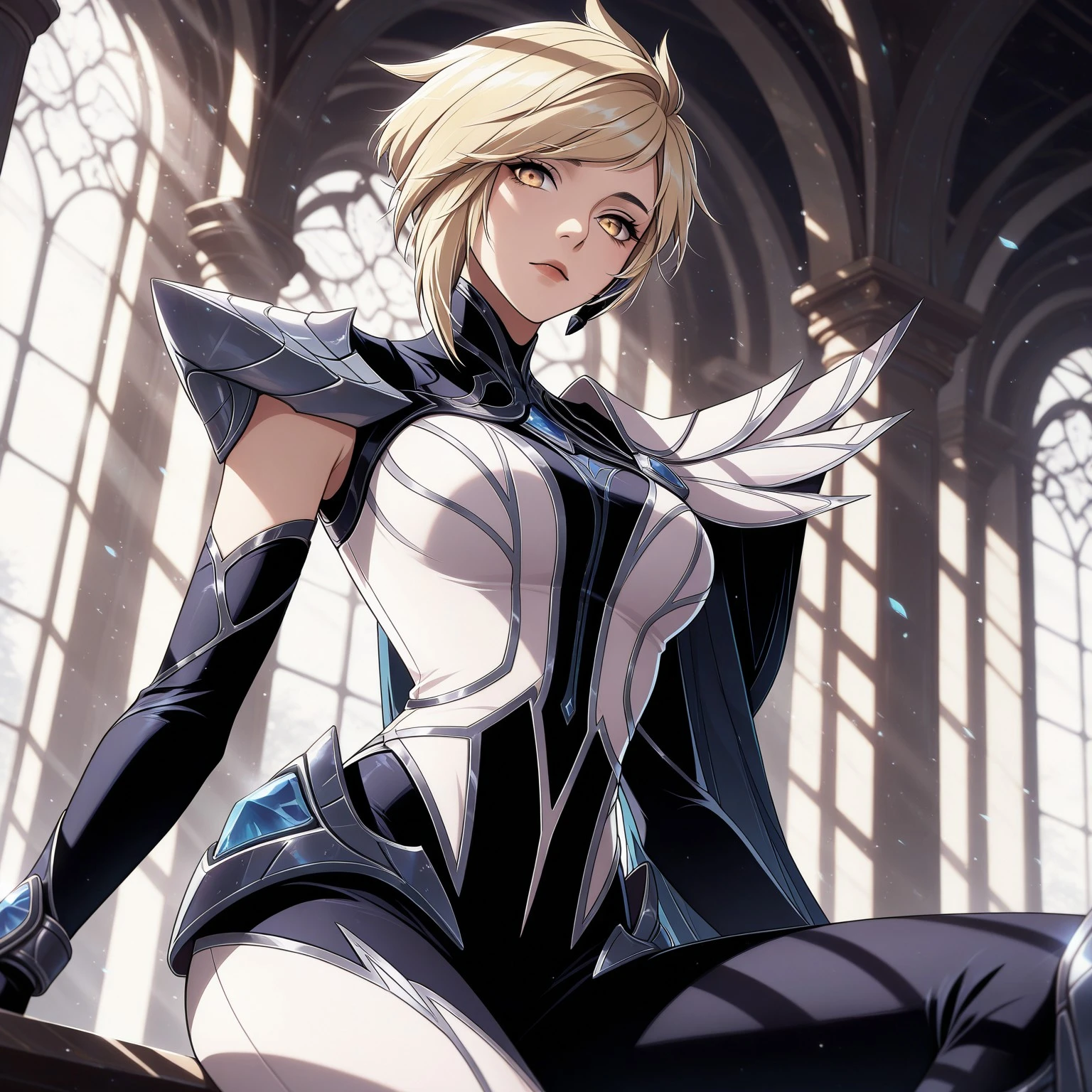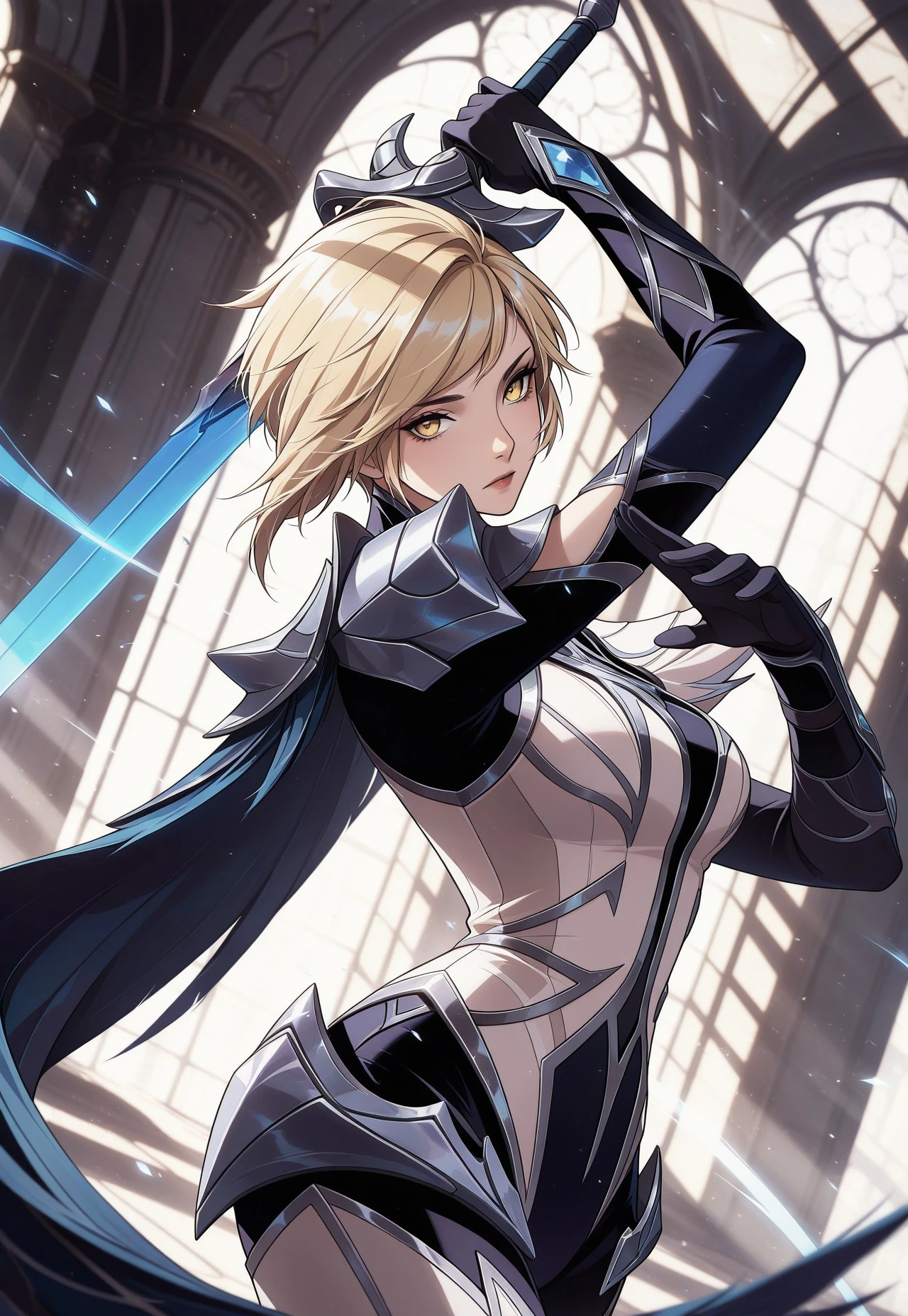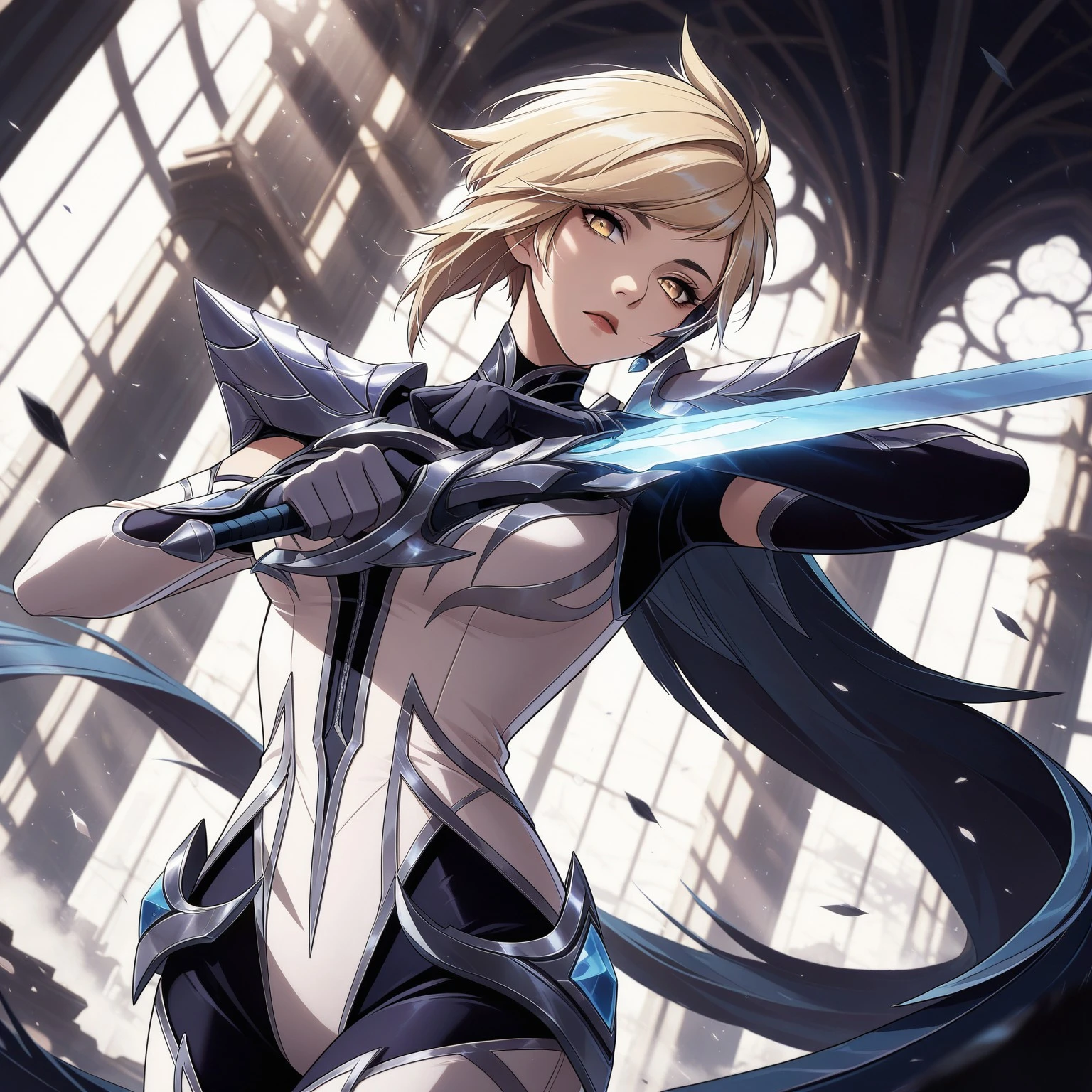 IGfiora, short hair platinum blonde hair, golden eyes, multicolored , shoulder pads, cape, sword, holding sword,