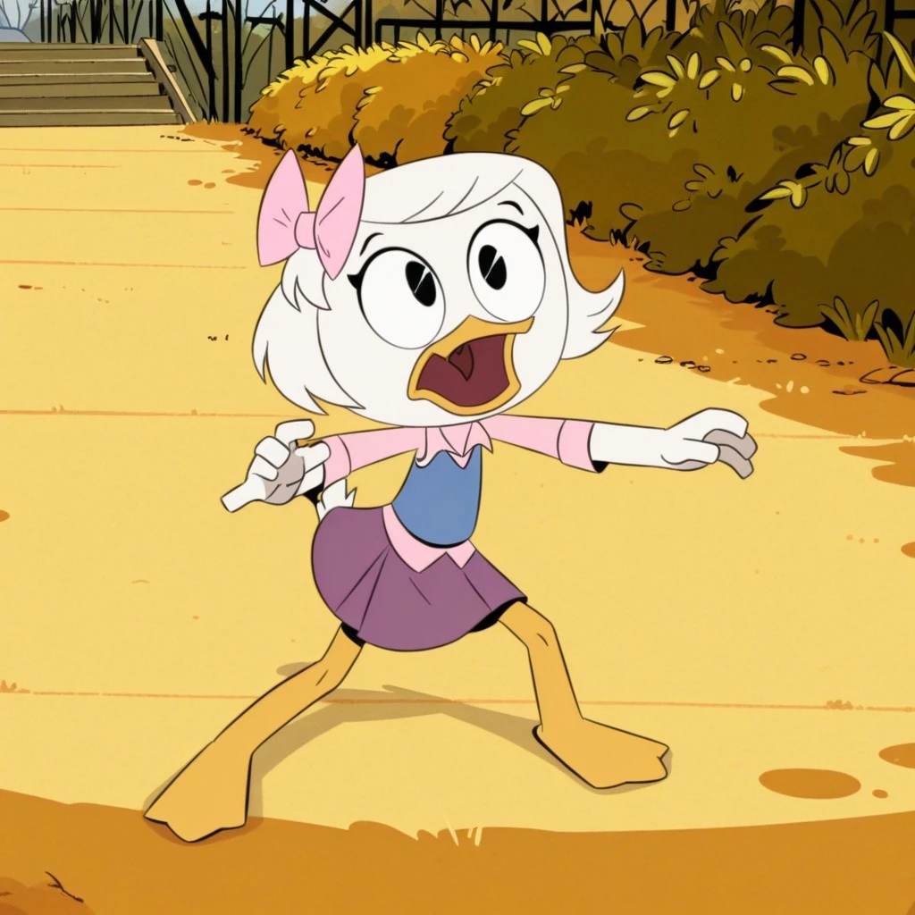 WebbyDT, semi-anthro, female, white feathers, short white hair, black eyes, pink hairbow, pink shirt, blue vest, purple skirt