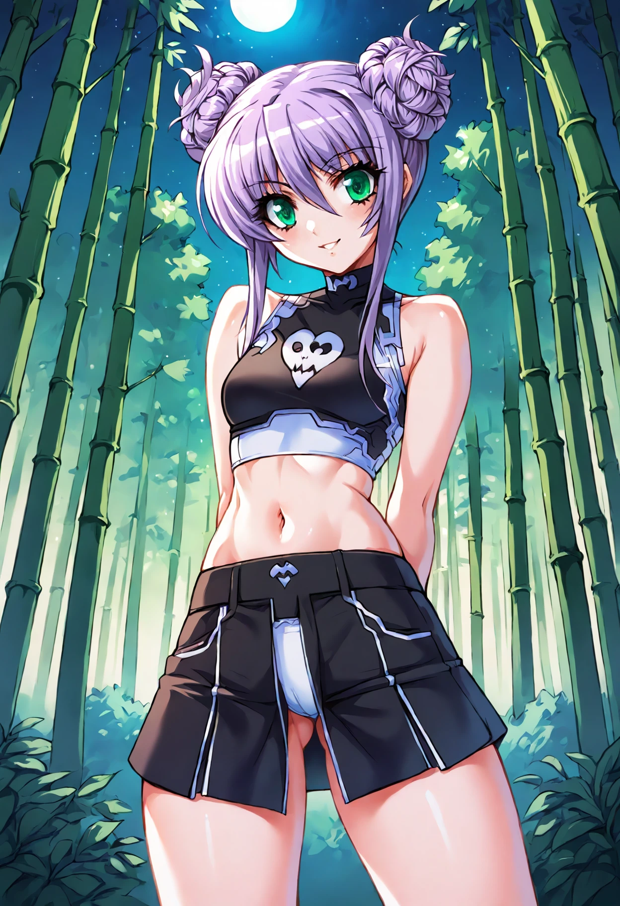 Azif, al azif, alternate costume, official alternate costume, black clothes, underwear, navel, midriff, hair bun, double bun, purple hair, green eyes,