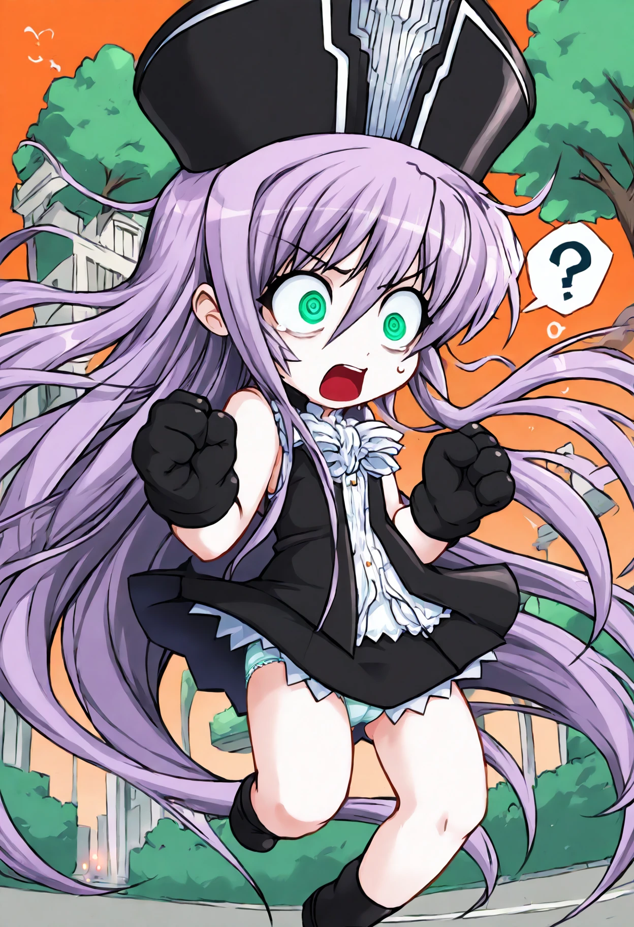 Azif, al azif, purple hair, chibi, floating, floating hair, long hair, gloves, hat, underwear, panties, dress, very long hair, green eyes