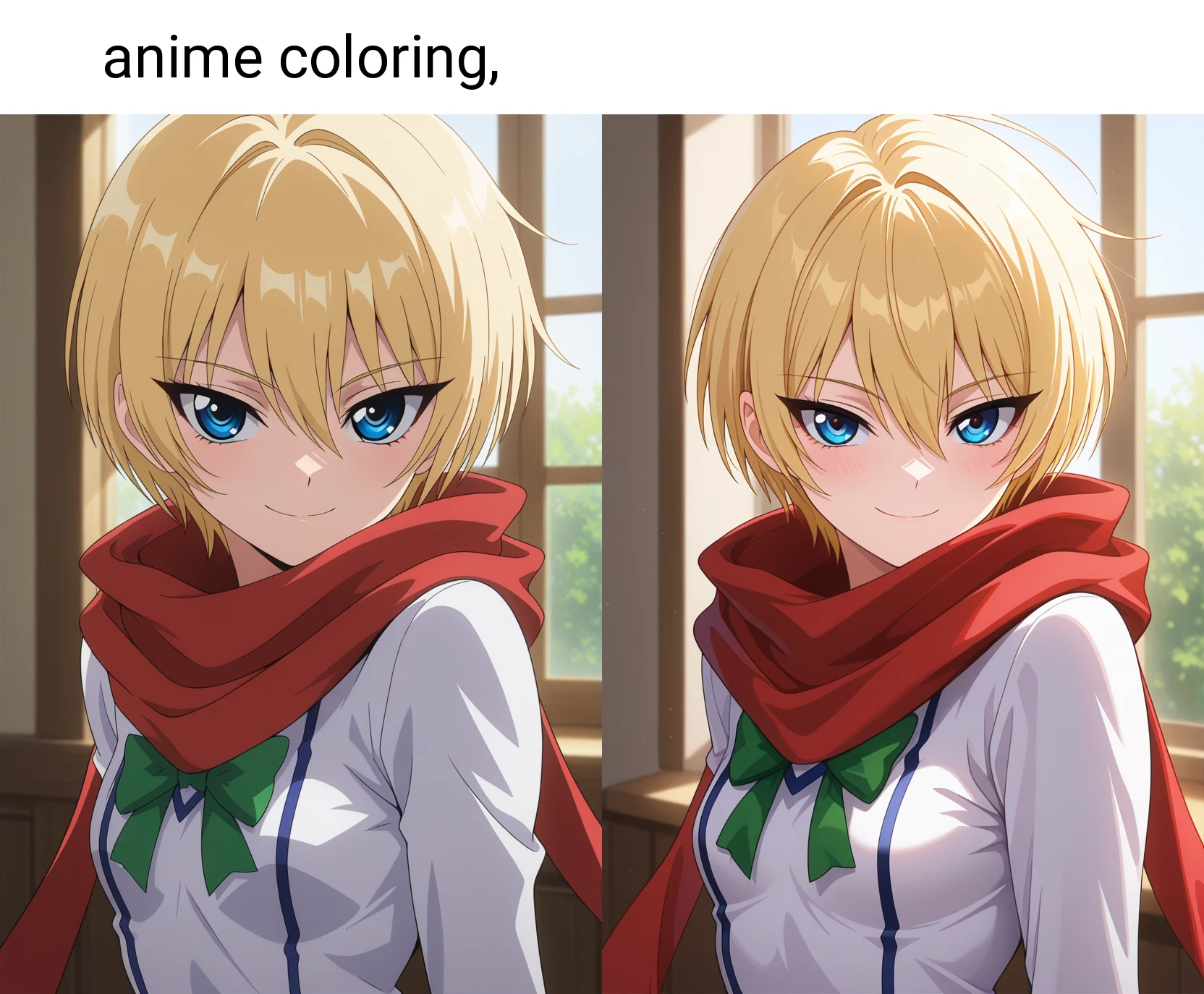 Using 'anime coloring' in the prompt will make the illustration look closer to an anime style.