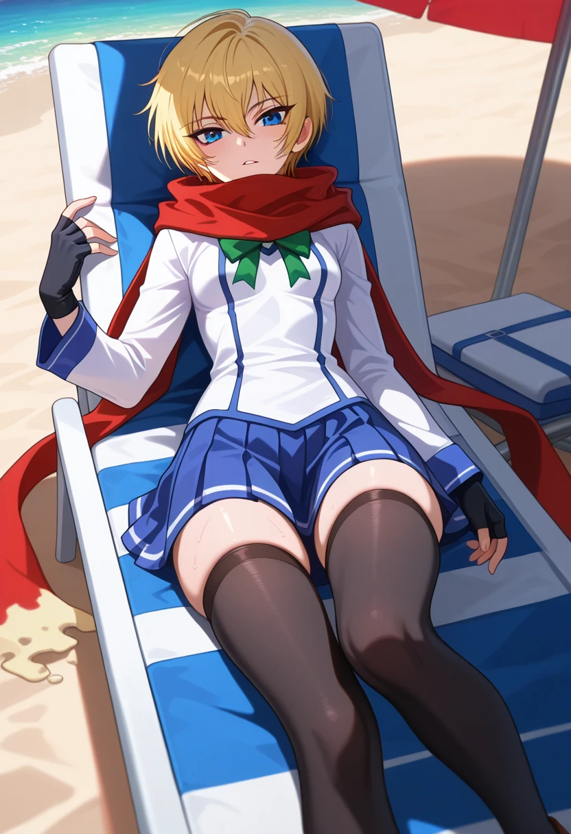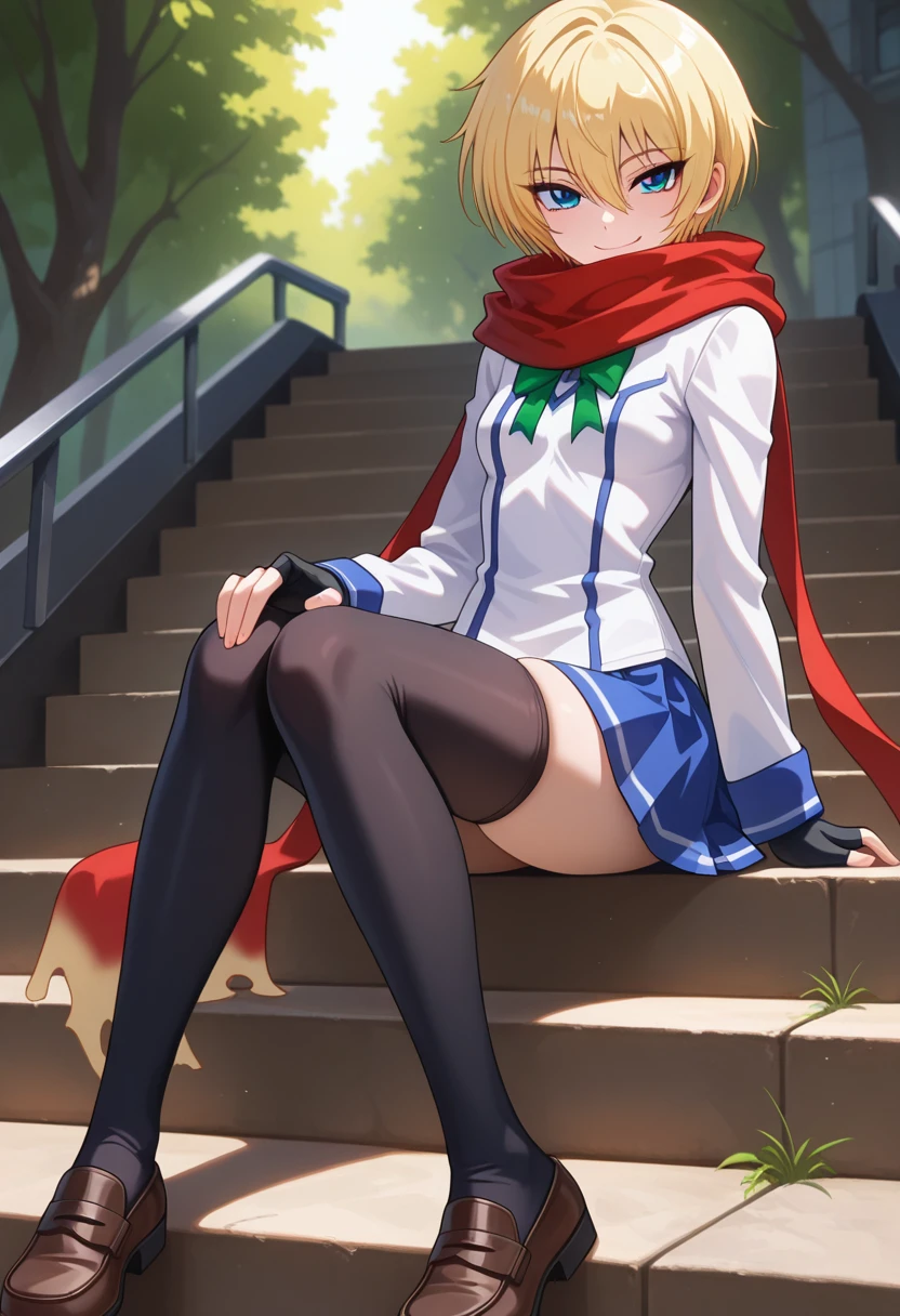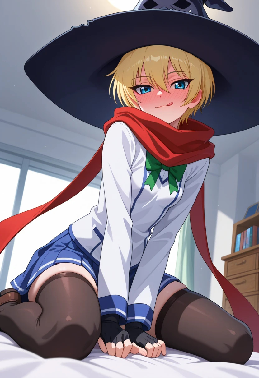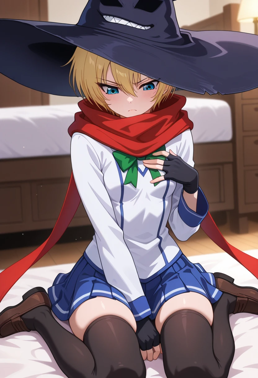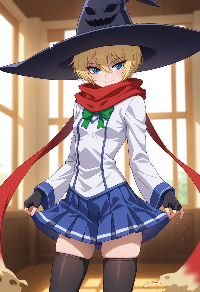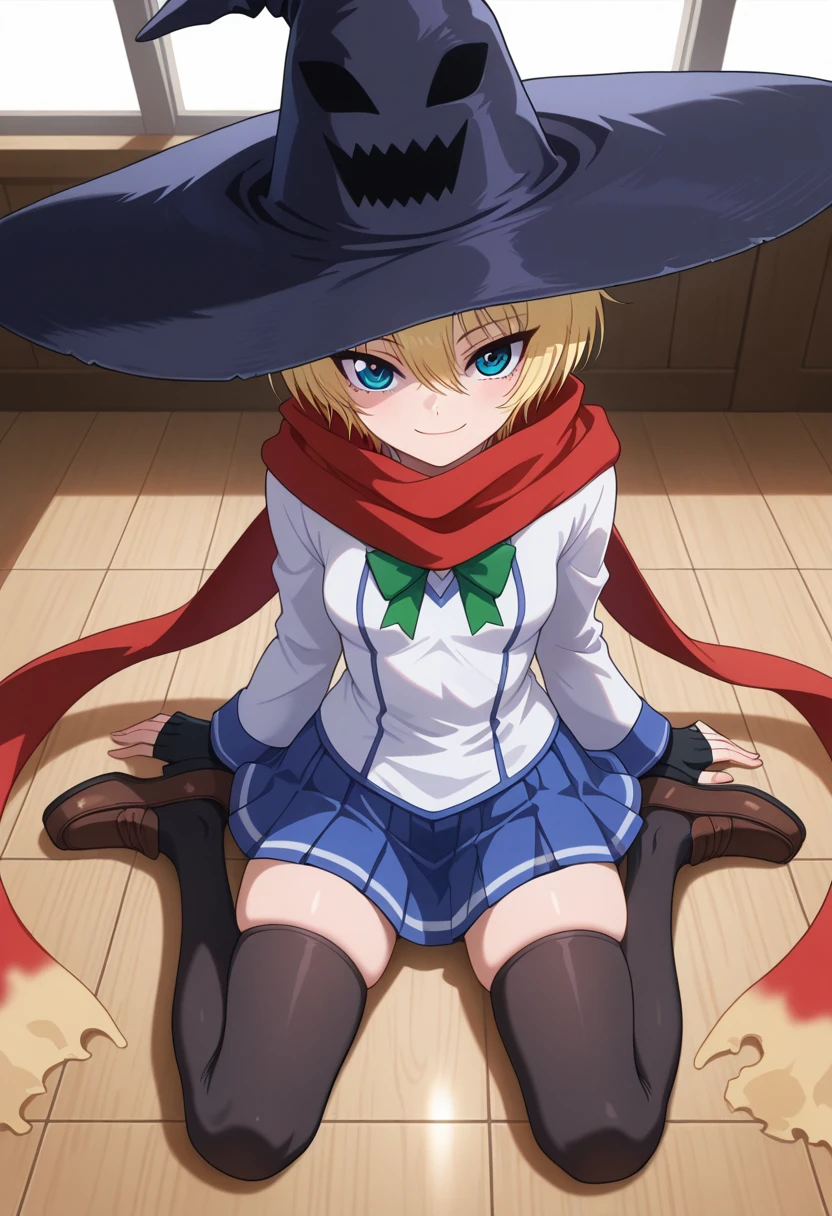 school uniform, witch hat, red scarf, white school shirt, green breasts bow, long sleeves, black fingerless gloves, blue pleated skirt, zettai ryouiki, black thighhighs, loafers,