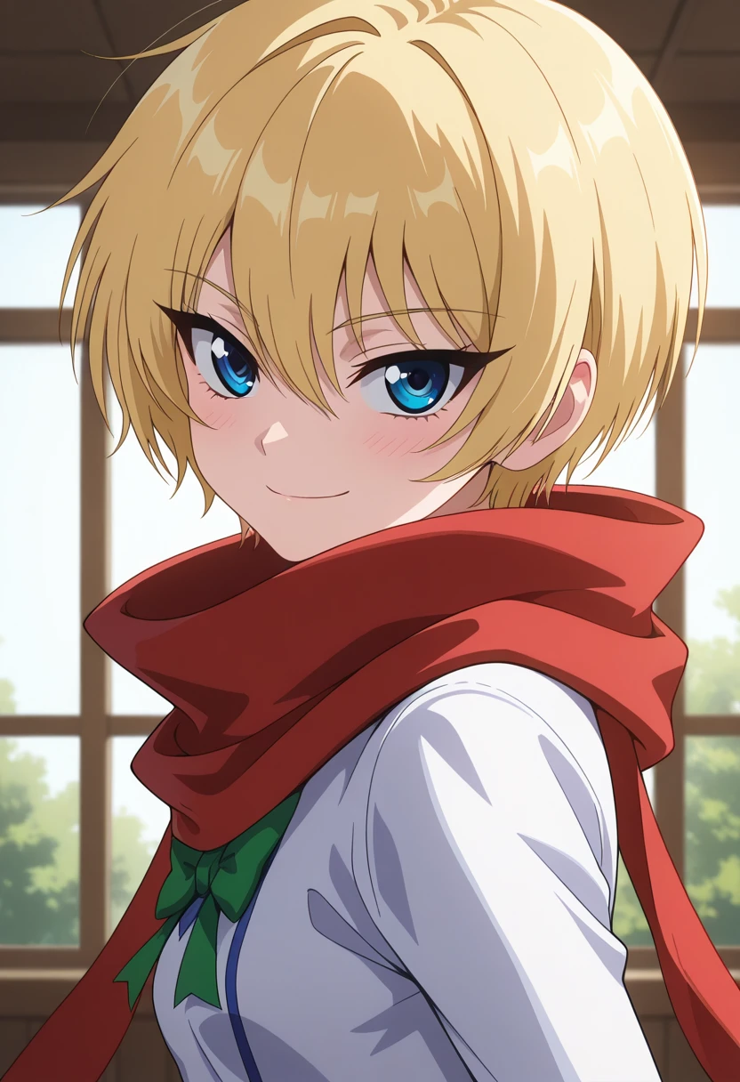 lilyww, blue eyes, tsurime, blonde hair, short hair, hair between eyes, small breasts,