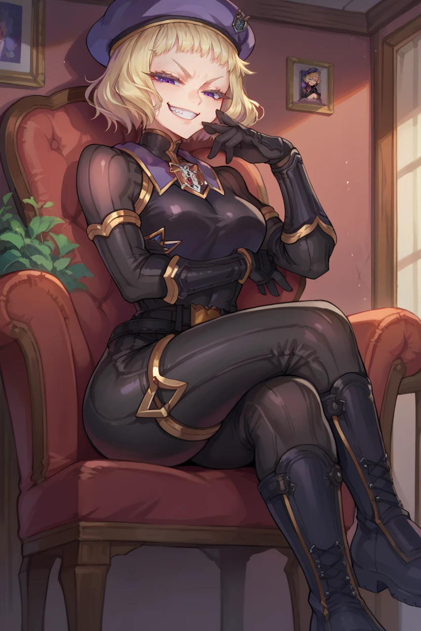 beret, black bodysuit, fingerless gloves, belt, black pants, boots