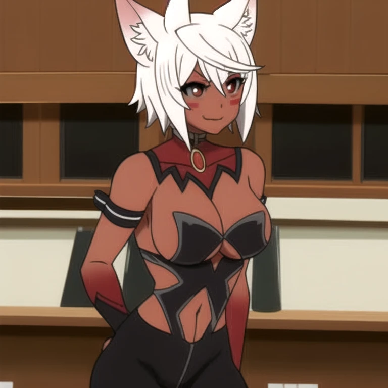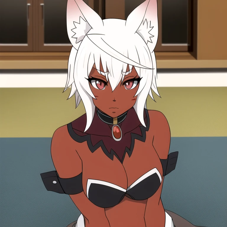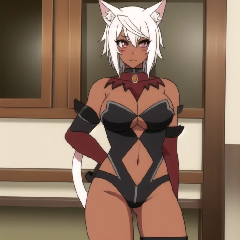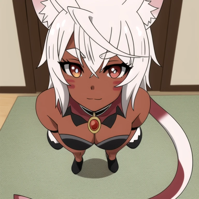 uruminasu,White hair, brown skin, cat ears, cat tail, white cat tail, red eyes