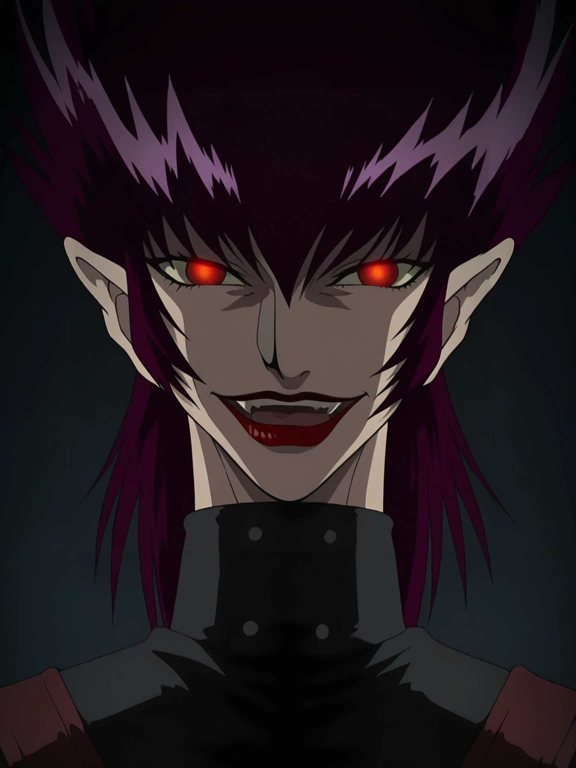nekome, 1girl, solo, claws, pointy ears, purple hair, red lips, red eyes, high collar, waist cape, green dress