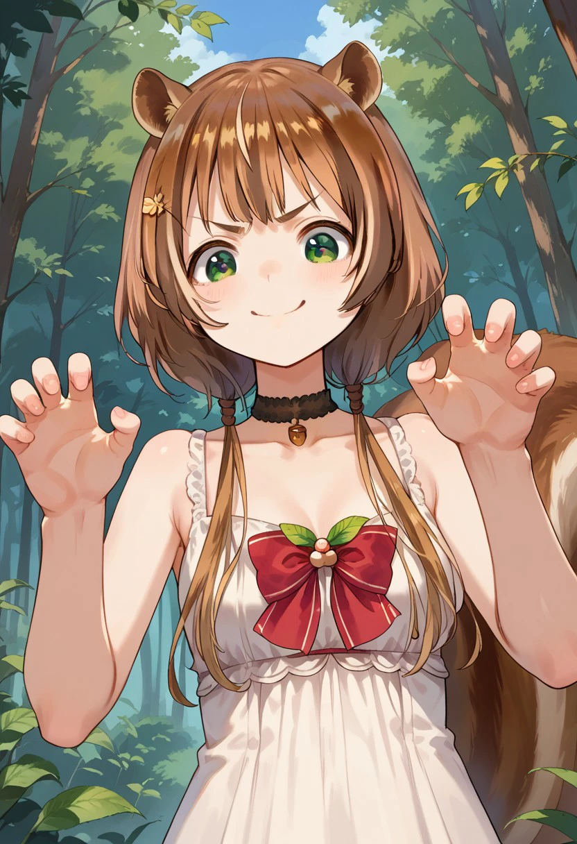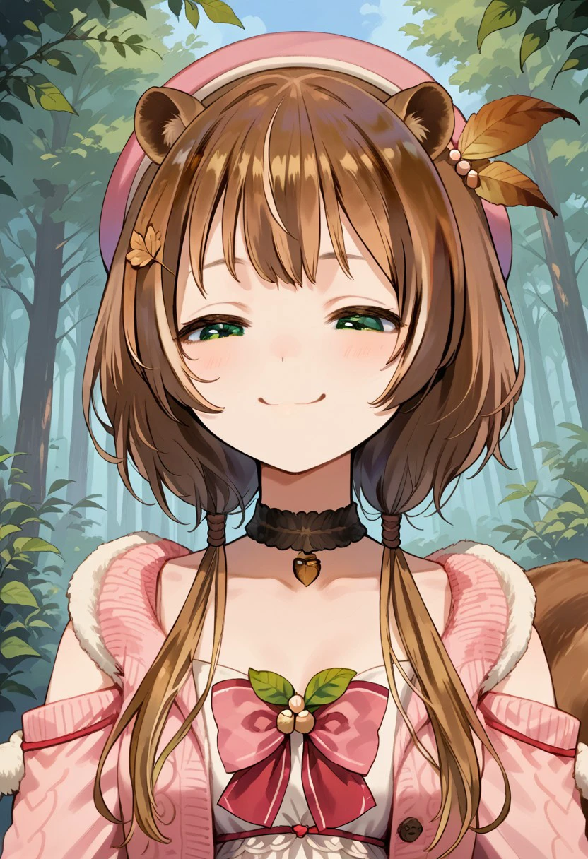 risu_first, brown hair, green eyes, squirrel ears, low twintails, squirrel tail, pink beret, leaf hair ornament, choker, acorn, pink cardigan, white dress, fur-trimmed legwear, white thigh highs, brown shoes,