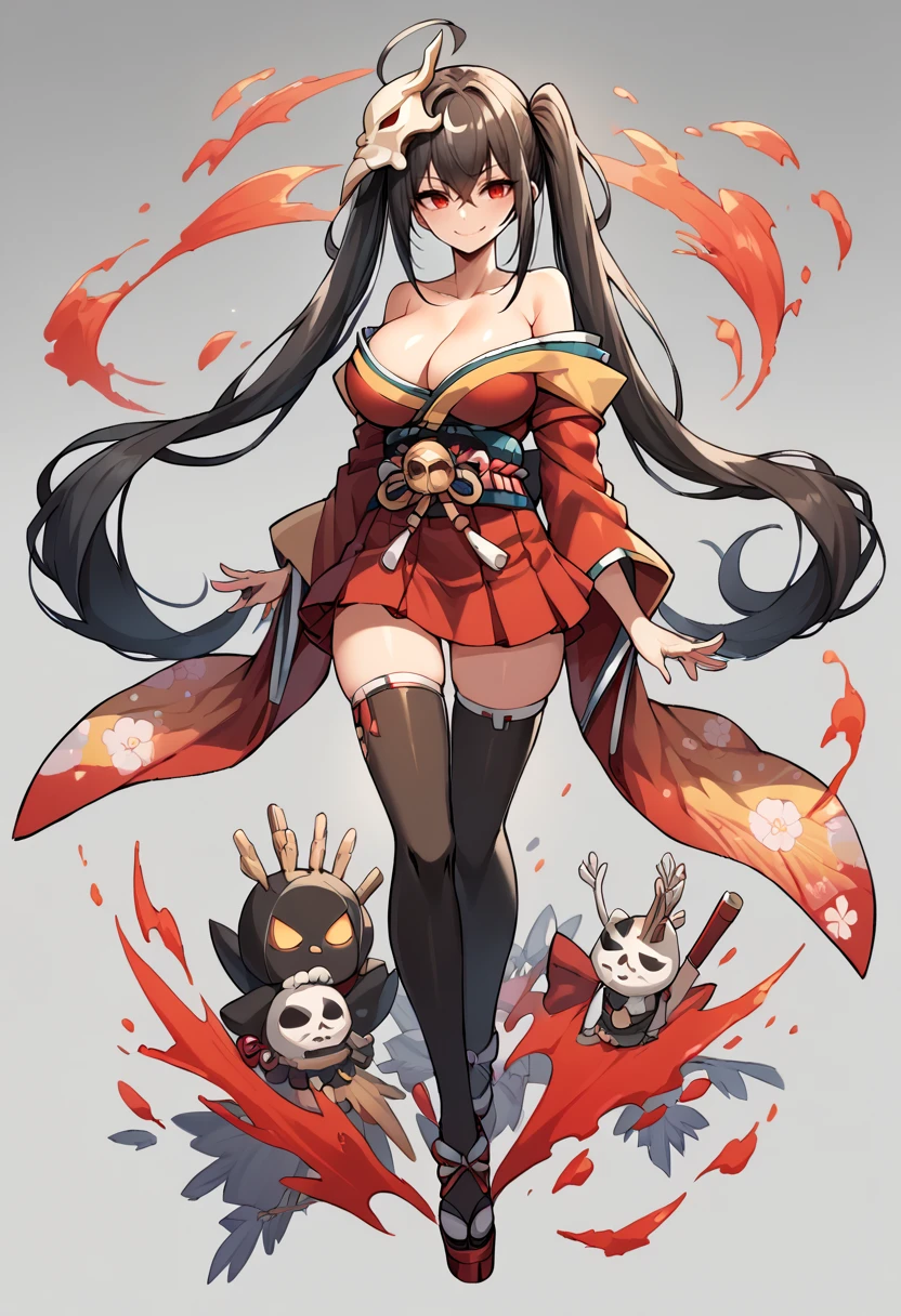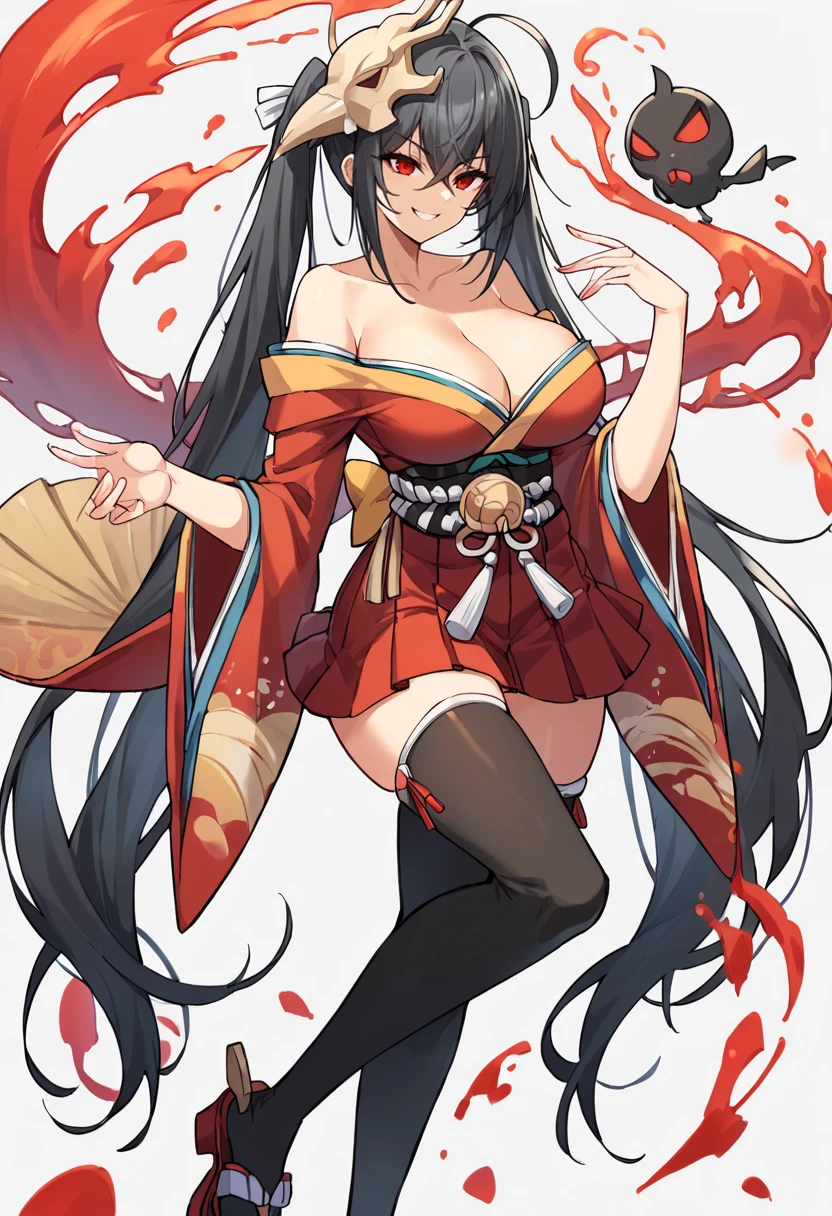 Base: MLTaiho, off shoulder kimono, short kimono, twintails, zettai ryouiki, wide sleeves, black thighhighs, hakama short skirt, red kimono , simple background, red eyes, crossed bangs , smile, rudder footwear