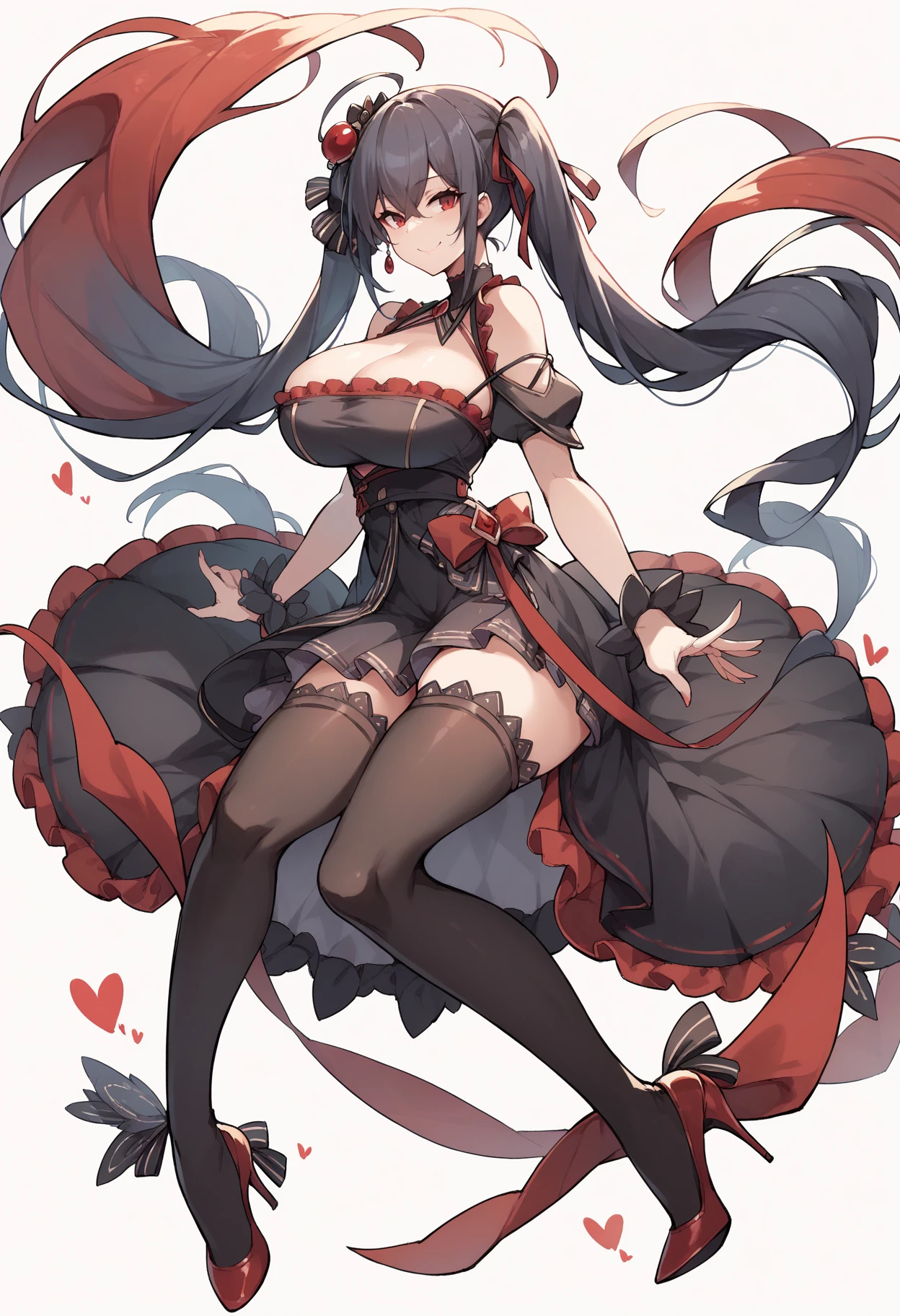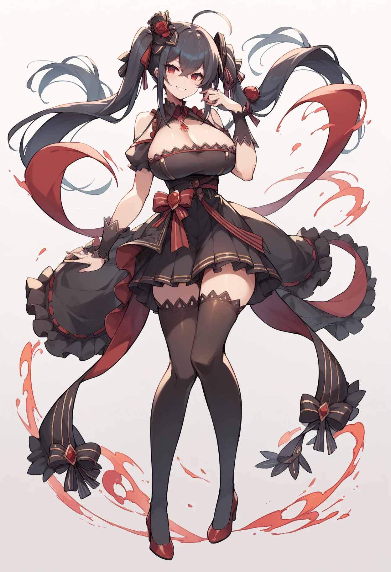 Muse (Idol): mltaidol, black idol dress, frills, black thigh highs, high heels, hair ornament, hair ribbon, red trim, (short skirt), huge breasts, simple background, bare shoulders, twintails, (short dress), smile, - the parenthesis are for keeping it in line.