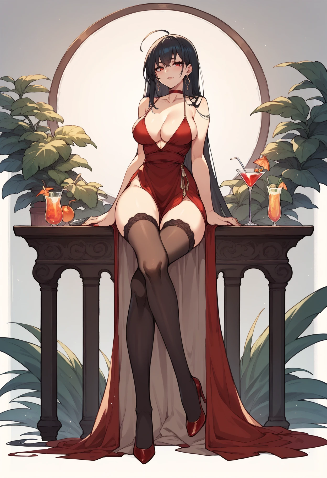 Forbidden Feast (Party Dress/Red Dress): mltaidress, bare shoulders, black thighhighs, choker, cleavage, cocktail dress, collarbone, red choker, red dress, hair ornament