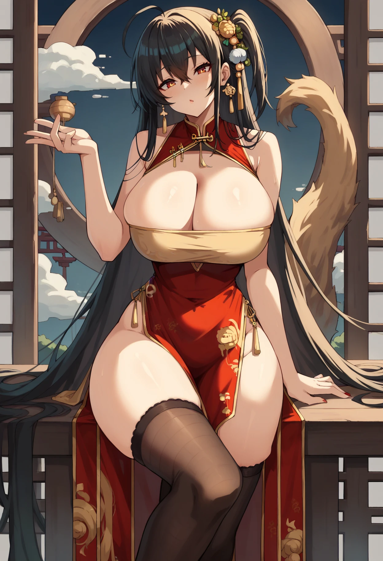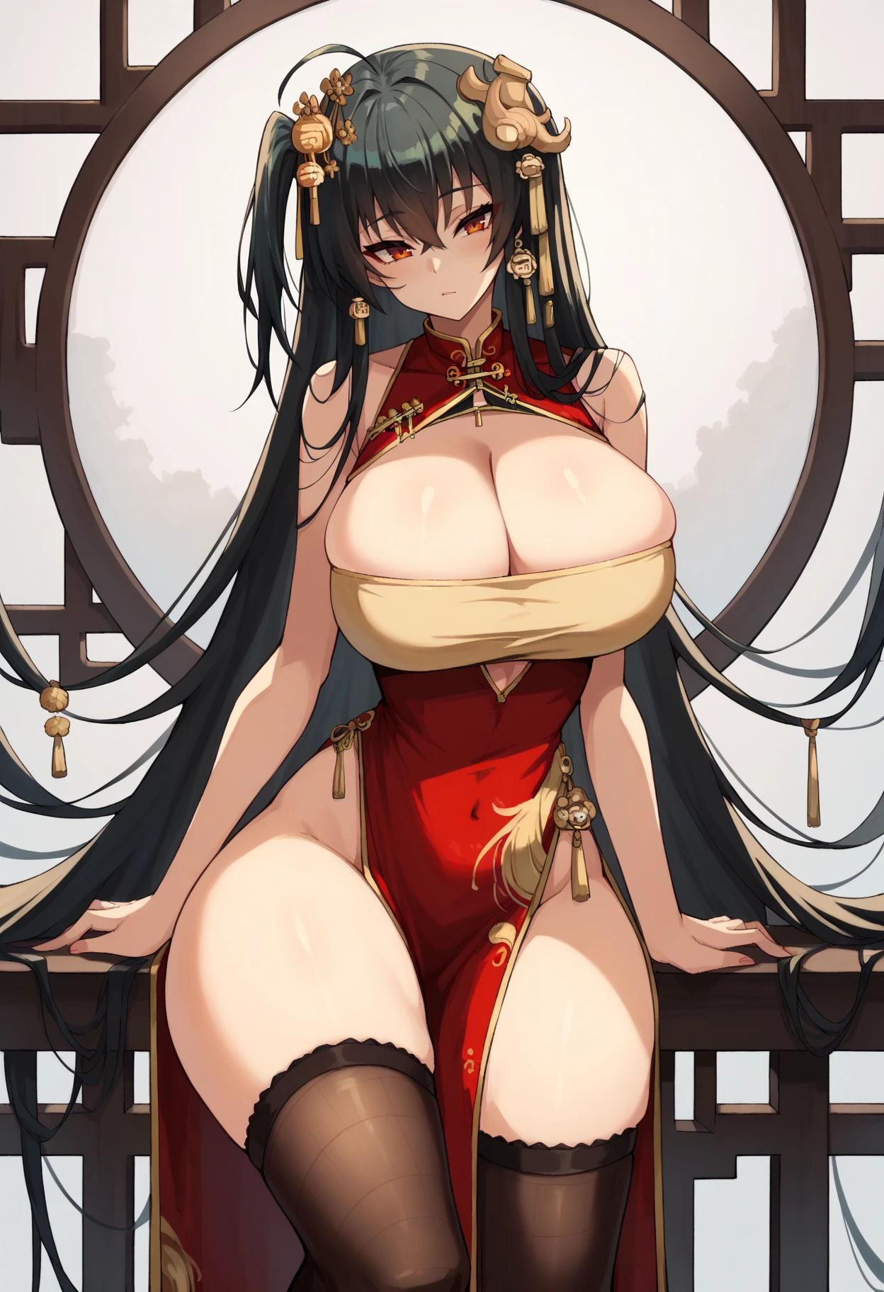 Phoenix's Spring Song (Chinese New year/Qipao): mltaiqipao, bare shoulders, black thigh highs, china dress, chinese clothes, cleavage cutout, gold bustier, gold hair ornament, pelvic curtain, red qipao, sleeveless dress - This one may require twintails in the negative.