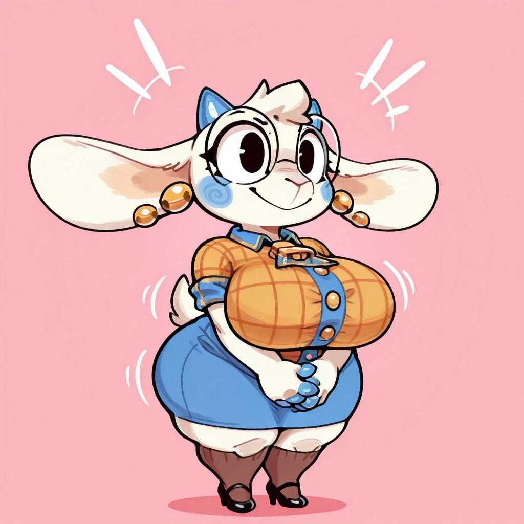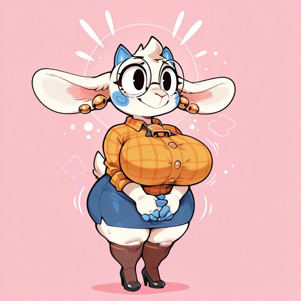 kobold, goat, hybrid, white fur, black eyes, black nose, blue horns, long ears, blue cheek marks, blue fingers, goat tail, shortstack, large breasts, huge breasts, wide hips, round glasses, gold bell ear piercings,