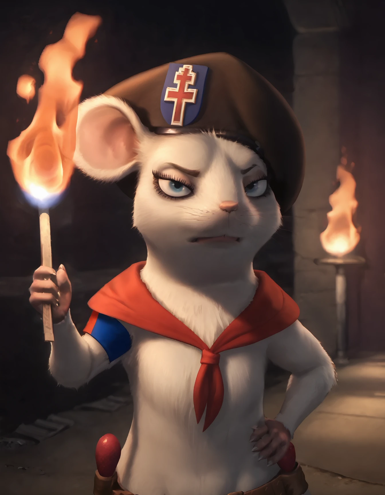 CDG, 1animal, solo, furry mouse, female animal, mouse, animal foocus, black beret hat, furr body, nudity, belt, red neckerchief, blue eyes, cross on the beret, shoulder patch, matches in belt,
