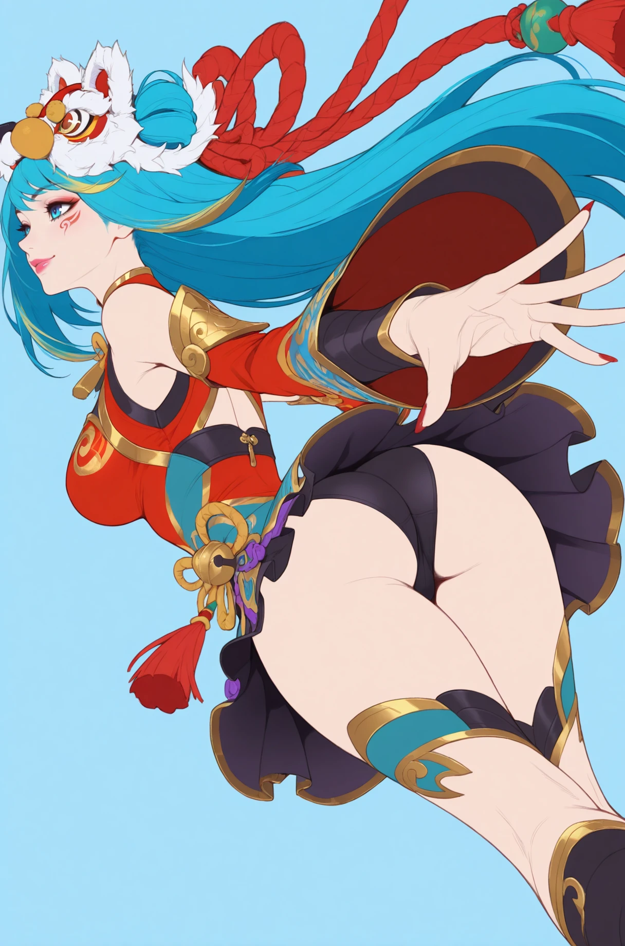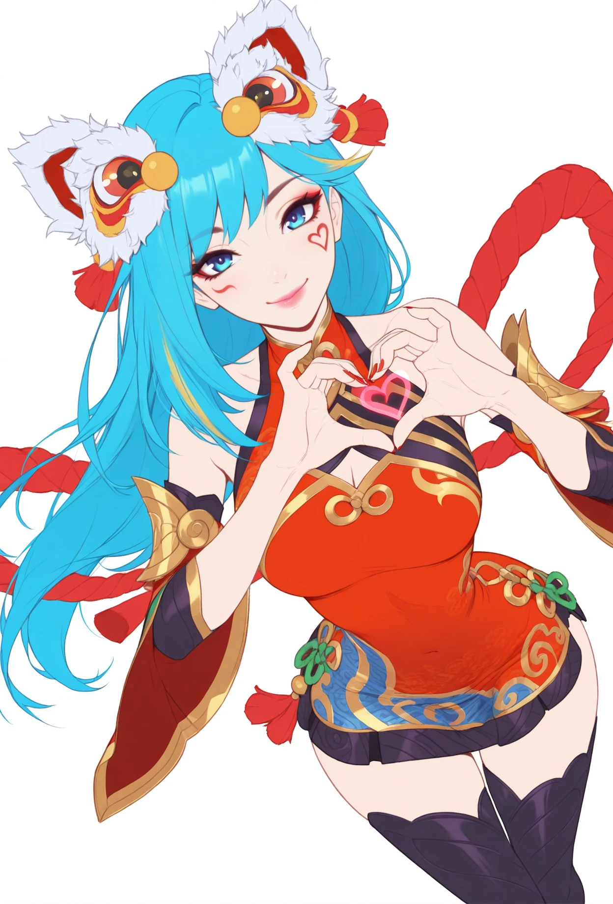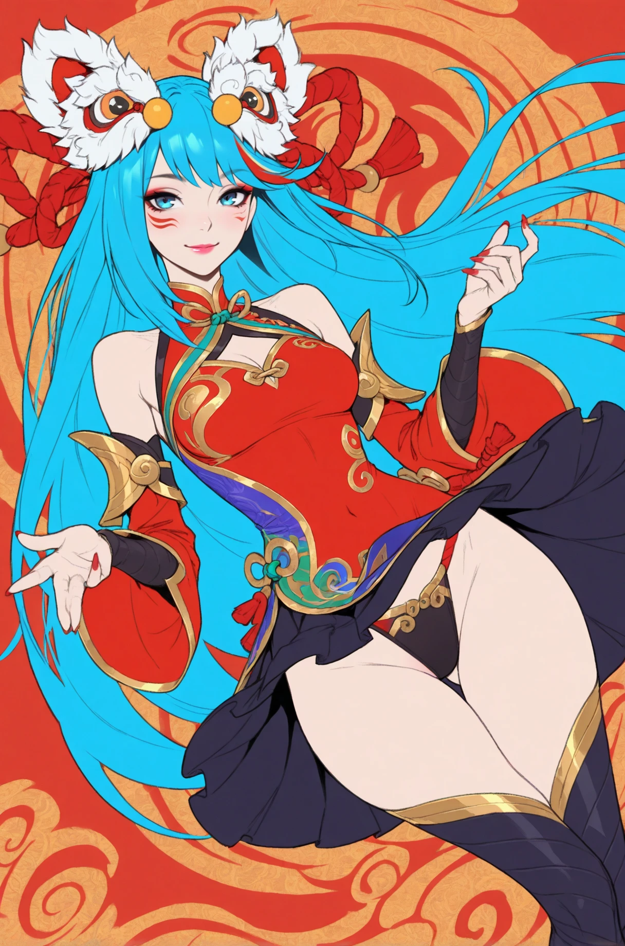 FC_Sera,slim body,blue eyes,blue hair,long hair,blue to cyan hair,smooth straight hair,bang,side bang,face mark,lion dance headpiece,red dress,chinese dress,tight dress,gold trim,ornamental patterns,wide sleeves,bare shoulders,pattern stockings,red rope,heels